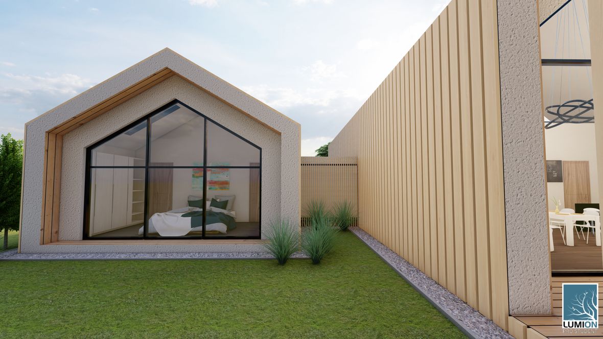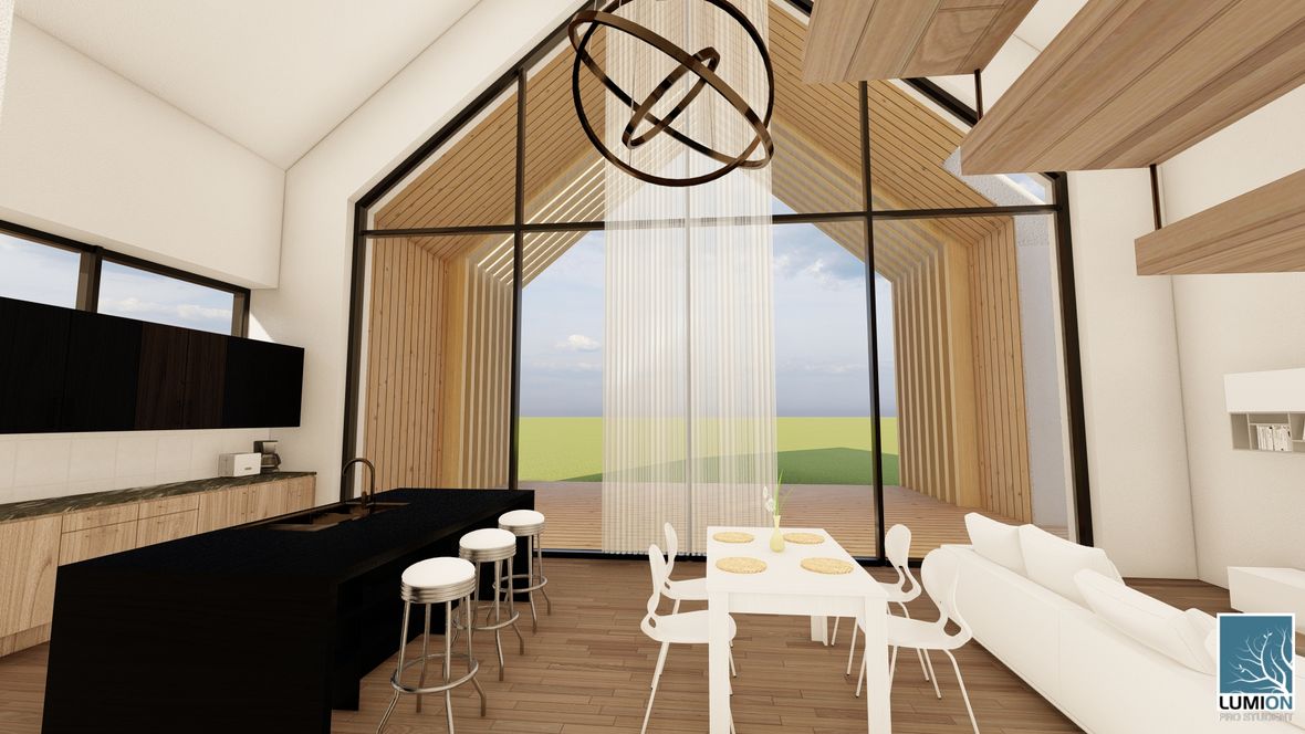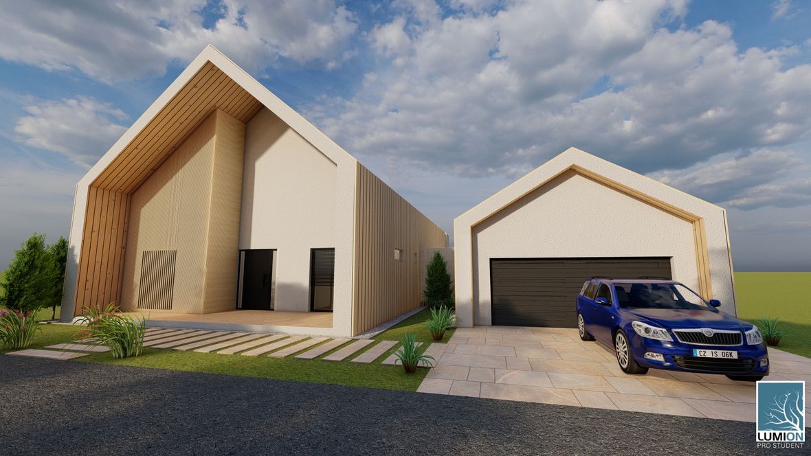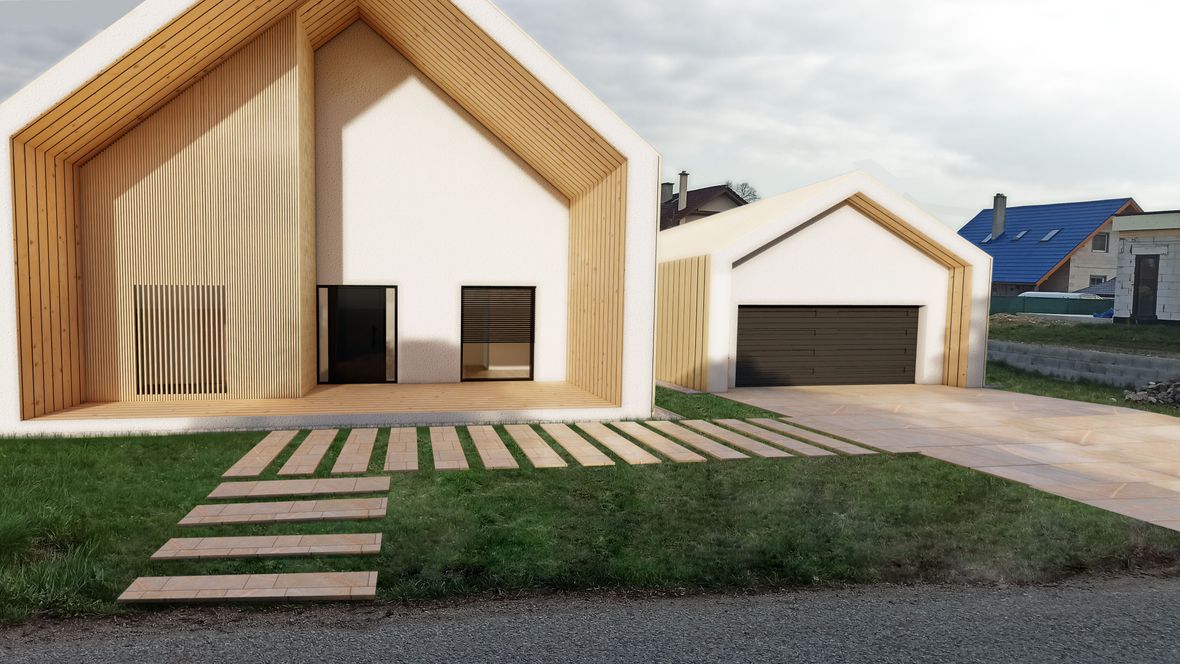 Rodinný dom MODERN(K)ING ktorý je navrhnutý v zastavanom území malej obce Jazernica s prevládajúcimi sedlovými strechami, ktorým sa návrh prispôsobil. Dom ponúka bývanie pre 3-4 členné rodiny. Objekt je navrhnutý tak, aby poskytoval príjemnú atmosféru a súkromie všetkým členom rodiny. Fasádu domu tvorí drevené obloženie, zo svetlého dubu, ktoré je nielen ekologické k prírode, ale aj estetické. Vstupné priečelie domu je orientované na sever a obytné miestnosti sú orientované na juh a východ. Tým sa zabezpečuje dostatočné presvetlenie každej miestnosti v dome. O presvetlenie sa starajú aj strešné okná zo systému VELUX INTEGRA®. Hlavnou časťou domu je obývacia izba spojená s kuchyňou, nad ktorou je situovaná galéria, sprístupnená schodiskom. Dominantou stavby je sklenená stena na južnom priečelí domu odkiaľ je nádherný výhľad na záhradu domu. Presklenie ponúka prísun svetla do zadnej časti stavby. Presklením je presvetlená aj rodičovská spálňa, ktorá je dispozične oddelená od hlavnej časti objektu. Jednotlivé hmoty spája chodba, ktorej strecha je pokrytá zeleňou. Južné priečelie je doplnené terasou, ktoré je čiastočne prestrešené a tienené svetlolamom zo svetlého dubu.