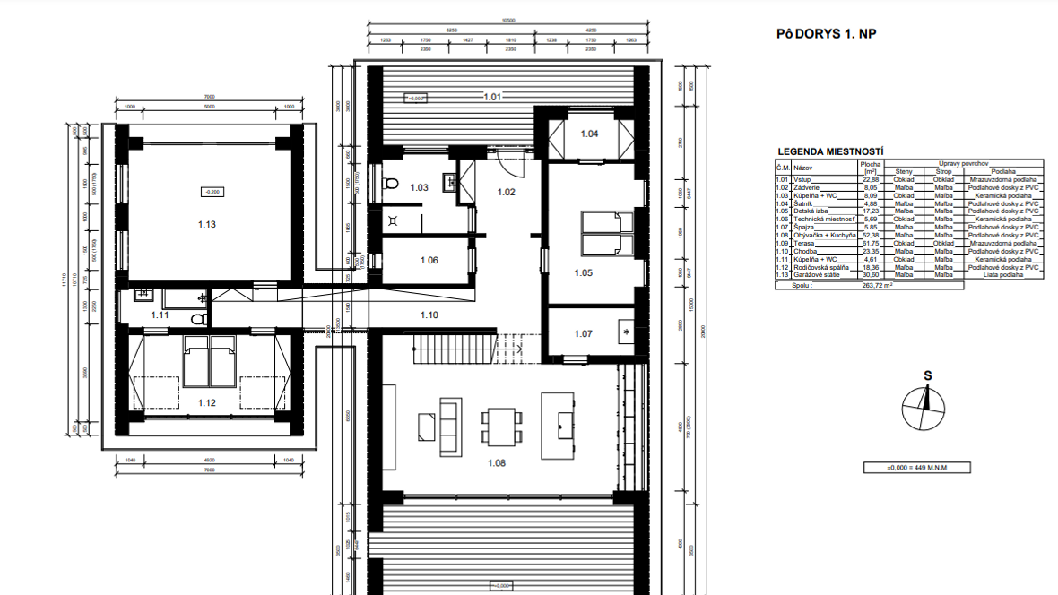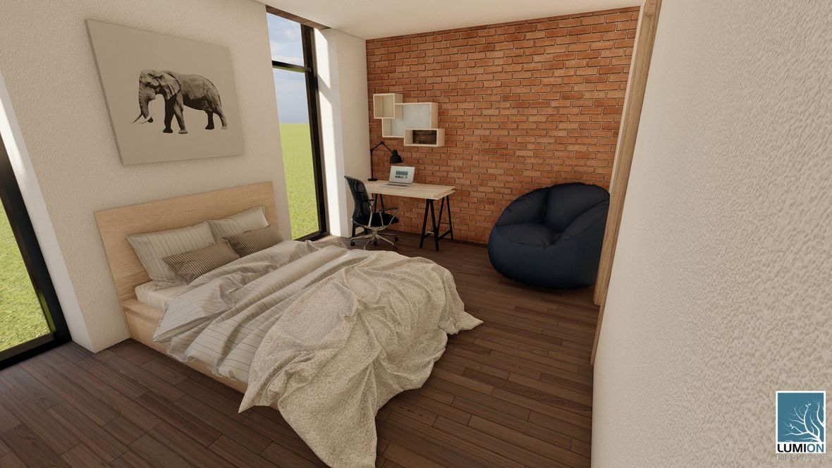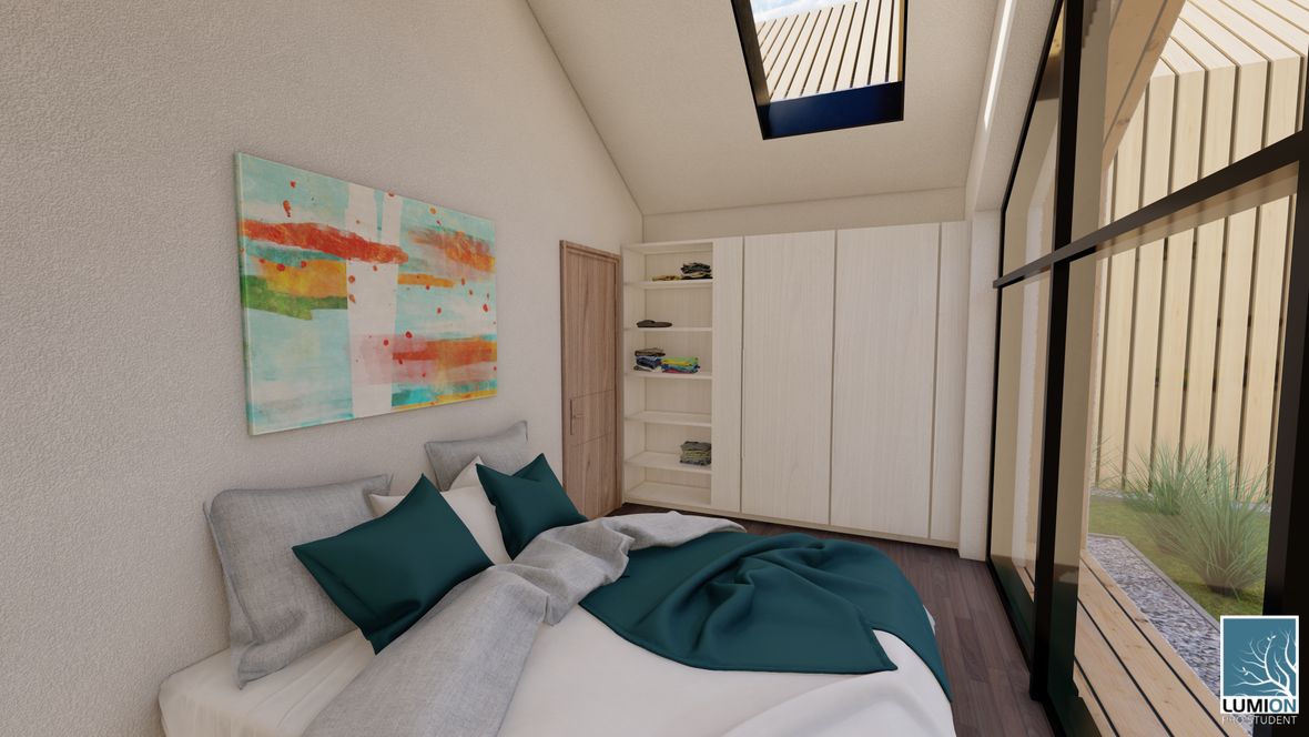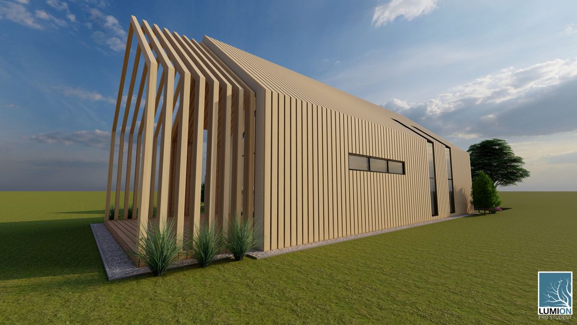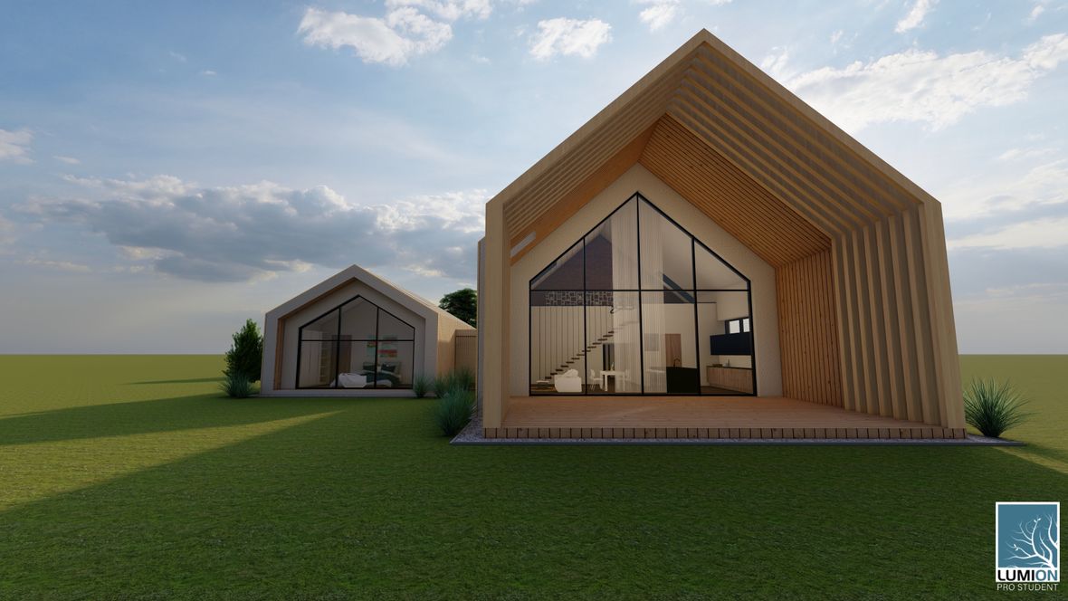 Rodinný dom MODERN(K)ING ktorý je navrhnutý v zastavanom území malej obce Jazernica s prevládajúcimi sedlovými strechami, ktorým sa návrh prispôsobil. Dom ponúka bývanie pre 3-4 členné rodiny. Objekt je navrhnutý tak, aby poskytoval príjemnú atmosféru a súkromie všetkým členom rodiny. Fasádu domu tvorí drevené obloženie, zo svetlého dubu, ktoré je nielen ekologické k prírode, ale aj estetické. Vstupné priečelie domu je orientované na sever a obytné miestnosti sú orientované na juh a východ. Tým sa zabezpečuje dostatočné presvetlenie každej miestnosti v dome. O presvetlenie sa starajú aj strešné okná zo systému VELUX INTEGRA®. Hlavnou časťou domu je obývacia izba spojená s kuchyňou, nad ktorou je situovaná galéria, sprístupnená schodiskom. Dominantou stavby je sklenená stena na južnom priečelí domu odkiaľ je nádherný výhľad na záhradu domu. Presklenie ponúka prísun svetla do zadnej časti stavby. Presklením je presvetlená aj rodičovská spálňa, ktorá je dispozične oddelená od hlavnej časti objektu. Jednotlivé hmoty spája chodba, ktorej strecha je pokrytá zeleňou. Južné priečelie je doplnené terasou, ktoré je čiastočne prestrešené a tienené svetlolamom zo svetlého dubu.