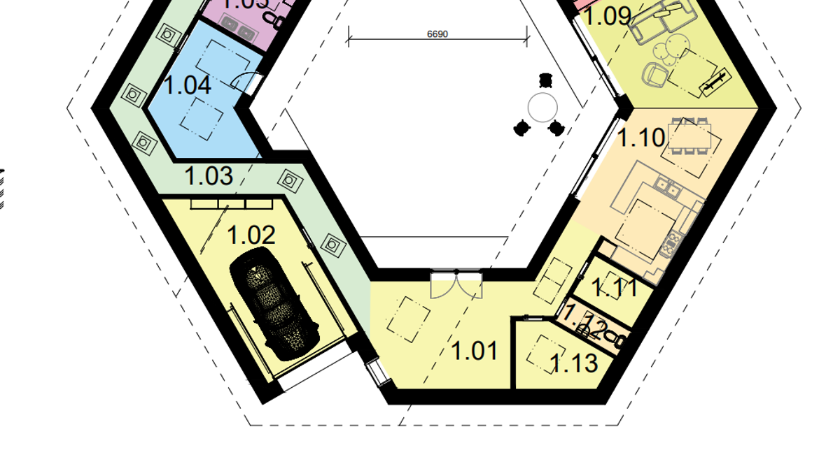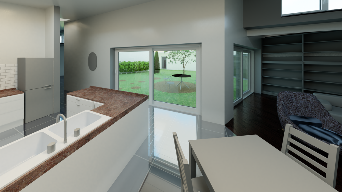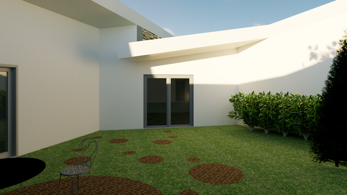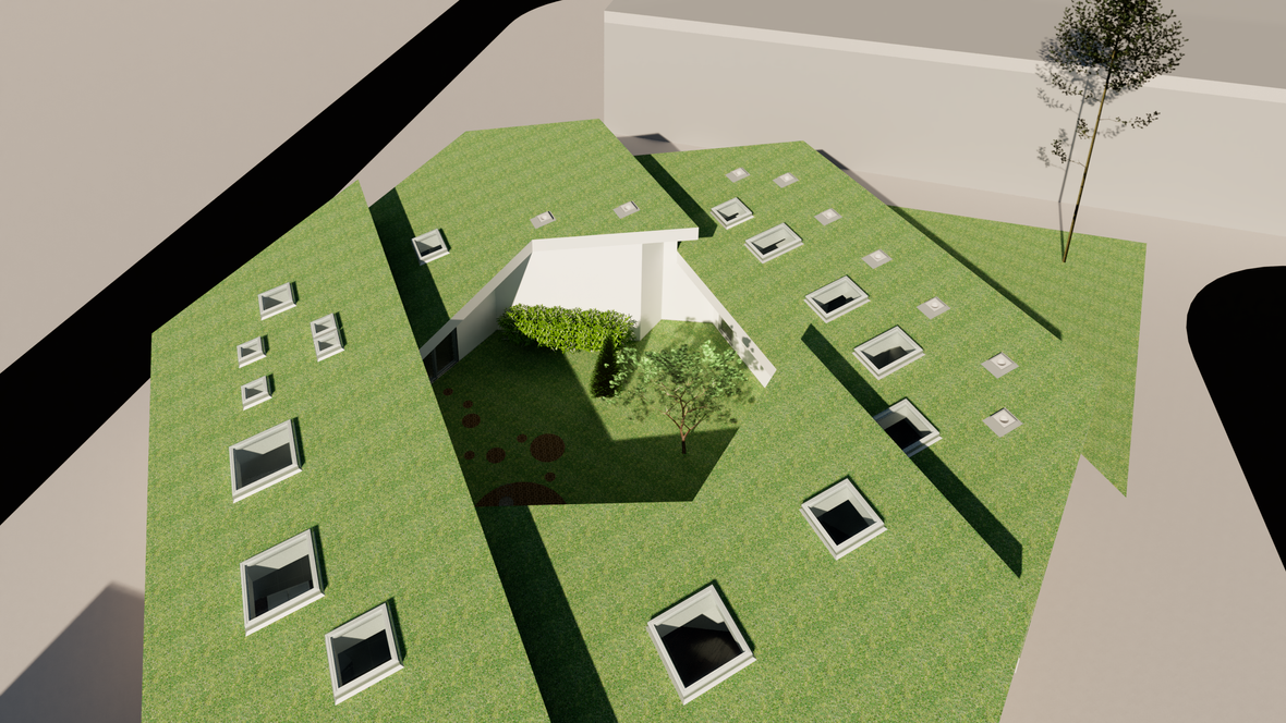 Bungalov s átriom je určený pre štvorčlennú rodinu. Jeho cieľom je odizolovať všetky vonkajšie vplyvy od objektu a tak vytvoriť tiché miesto aj uprostred mesta. Keďže sa vo vonkajších obvodových stenách nenachádzajú žiadne okná, hlavné osvetlenie prichádza cez strešné okná a svetlovody od VELUX. Malý priestor nad knižnicou priamo pod strešným oknom vytvára sen každého knihomoľa. Pre dokonalé pohodlie chýbajú len obľúbené knihy, šálka čaju, deka a veľa vankúšov.