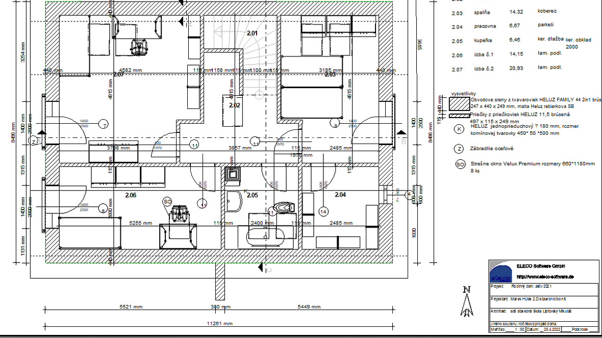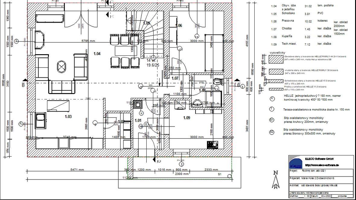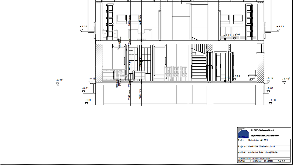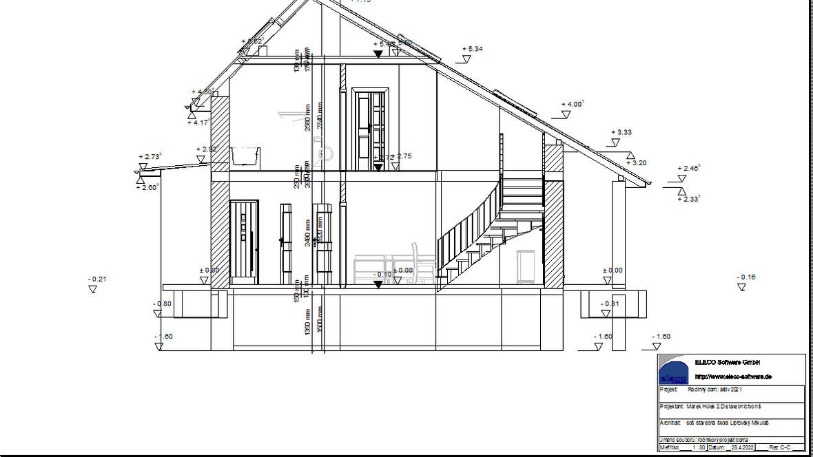 Objekt rodinného domu je situovaný v časti obce Liptovský Mikuláš na pozemku investora. Terén pozemku je členený , pôvodne orná pôda. Pozemok s parcelným číslom 1140 patrí do katastrálneho územia kraj Žilinský okres Liptovský Mikuláš obec Liptovský Mikuláš Katastrálne územie k.ú. Palúdzka Prístup na pozemok je priamy z obecnej komunikácie. Vstup do domu je riešený z východnej strany. Prehľad súhrnných údajov: Zastavaná plocha : 125,52 m2 Obostavaný priestor : 706.15 m3 Úžitková plocha : 149,85 m2 Základy pod zvislými nosnými konštrukciami sú navrhnuté základové plošné pásy šírka 400, 540 mm, 200 z prostého betónu C 12/15. V hornej časti sú spriahnuté základovou doskou hrúbka 150mm z oceľobetónu C 20/25. Základová škára je navrhnutá v týchto hĺbkach -1,600 a -0,810m od nulového bodu objektu, ktorým je úroveň podlahy prízemia. Základové pásy v rôznych hĺbkach sú od dilatovanie asfaltovými pásmi. Konštrukčne je rodinný dom navrhnutý ako murovaný z obvodových tvaroviek HELUZ FAMILY 44 2in1 brúsená 247 x 440 x 249 mm . Vnútorné nosné steny tvorí murivo z tvaroviek HELUZ 17,5 brúsená 497 x 175 x 249 mm a HELUZ FAMILY 30 brúsená 247 x 300 x 249 mm. Priečky sú navrhnuté z priečkoviek HELUZ 11,5 brúsená 497 x 115 x 249 mm. Na prízemí sú navrhnuté 3 stĺpy - stĺp oceľobetónový monoliticky prierez kruhový 200mm, omietnutý – 1 ks a Stĺp oceľobetónový monoliticky prierez štorcový 300x300 mm, omietnutý – 2 ks. V objekte je navrhnutý 1 komín: HELUZ jedno prieduchový priemeru 180 mm, rozmer komínovej tvarovky 450* 50 *500 mm. Objekt je zastrešený je nepravidelnou sedlovou strechou so sklonmi 30° a 45° stupňov. Konštrukcia strechy je tvorená hambálkovým krovom s upraveným podhľadom. Vstup do objektu je chránený drevenou pultovou strieškou zo sklonom 5°. Navrhnutá je strešná krytina betónová škridla Bramac štandard pálená čierna. Podkrovie je zastrešené strešnými oknami Velux Premium rozmermi 660*1180 mm a 8ks. Odkvapový systém je navrhnutí Bramac – oceľový pozinkovaný plech.