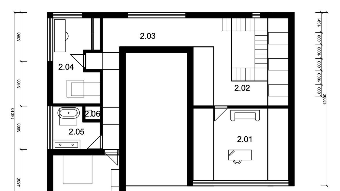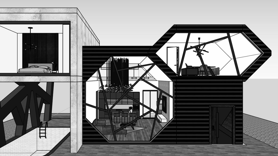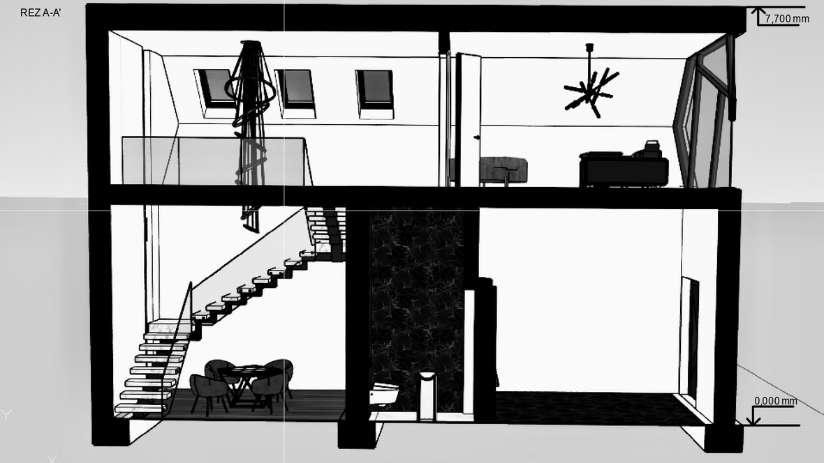 Rodinný dom “Lost in the Angles” je vhodný pre trojčlennú rodinu. Na prvom nadzemnom podlaží sa nachádza obytná časť, technická miestnosť, samostatné WC. Schody sú vyrobené z prírodného materiálu - z mramoru, na druhom nadzemnom podlaží sa delí na dve “lode”. V prvej lodi sa nachádza veľká pracovňa, v druhej lodi nájdeme detskú izbu, kde je umiestnený svetlík VELUX s otváravou základňou CVU na elektrický pohon, kúpeľňu, kde je nad vaňou Velux svetlík CVU ISU 1093, samostatnú toaletu a spálnu. Izby sú presvetlené veľkými oknami. Rodinný dom má plechovú strešnú krytinu.