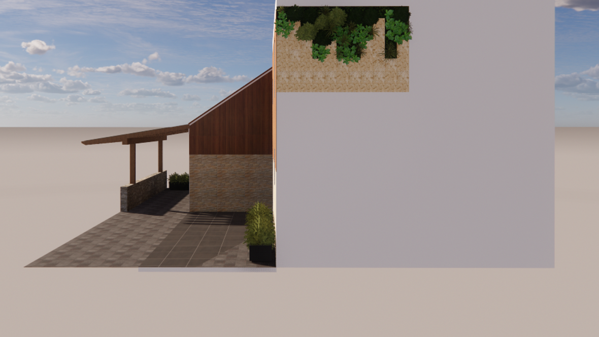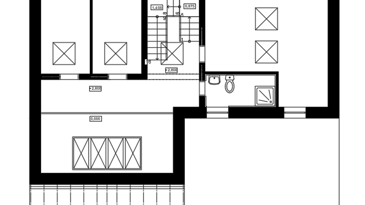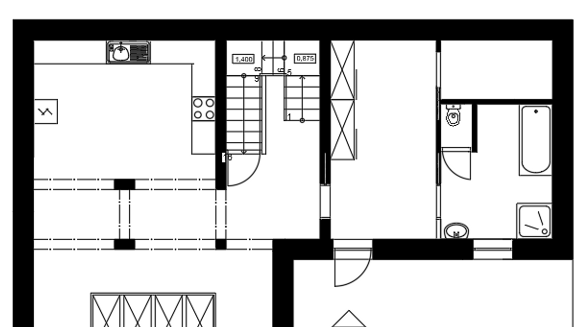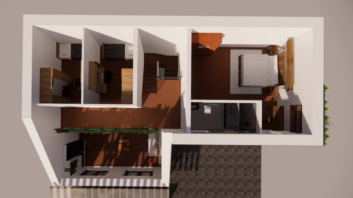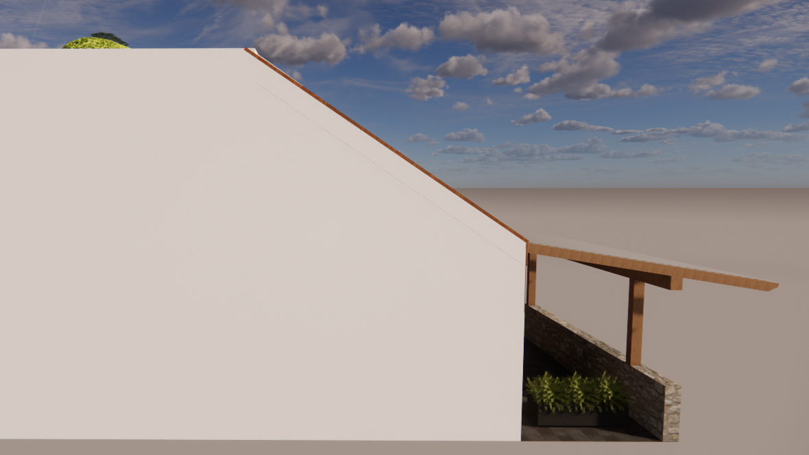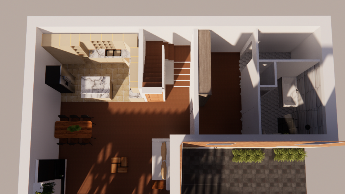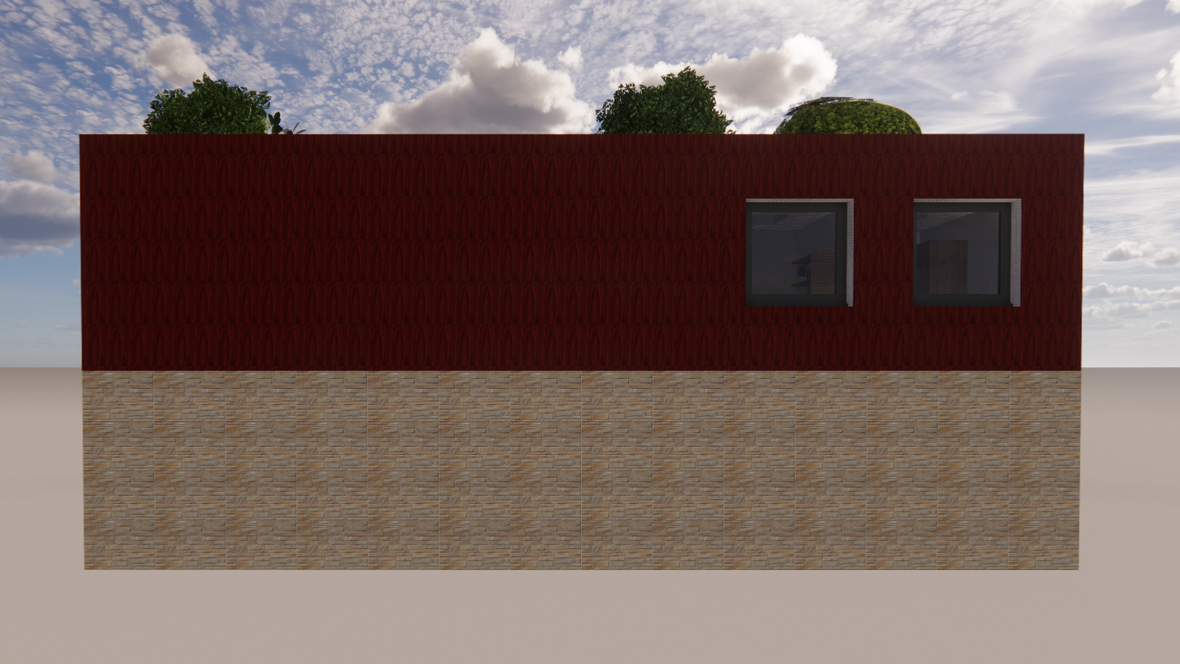 Dom je menšej veľkostnej kategórie a je obývateľný pre 3-4 člennú rodinu. Na priečelí domu sa nachádza menšia terasa a spevnená plochu pre automobil. Celá časť je ohraničená živím plotom a okrasnými rastlinami. Vstup do domu máme umiestnený za spevnenou plochou. Na prvom podlaží sa nachádza vstupná chodba. Na jej pravej strane je umiestnená kúpeľňa s WC. V zadnej časti chodby je technická miestnosť s tepelným čerpadlom. Po ľavej strane od vstupu sa nachádza schodisko a špajza. V zadnej časti po pravej strane je vytvorený kuchynský kút a po ľavej strane priestranná obývacia izba. Po výstupe na druhé poschodie je po ľavej strane rodičovská izba a vedľa nej kúpeľňa. Oproti schodisku je chodba s galériou na ľavej strane steny a oproti nej sa nachádzajú dve detské izby.