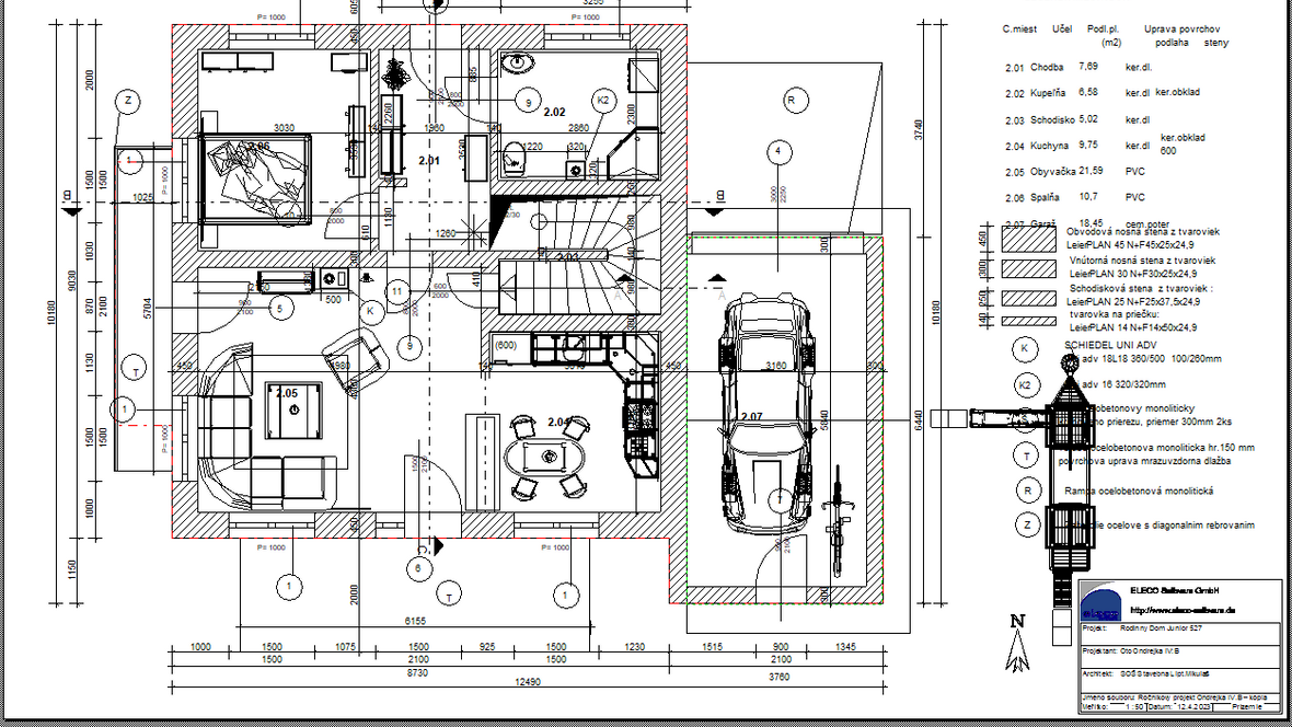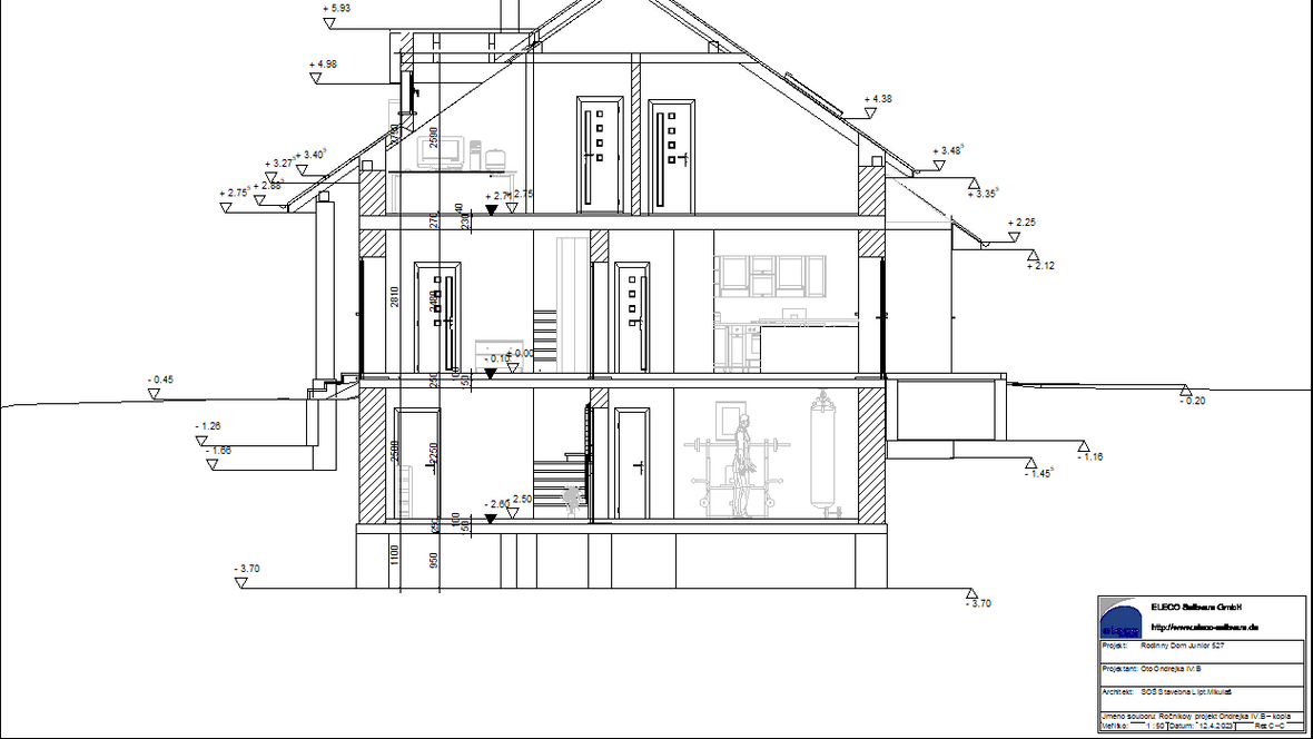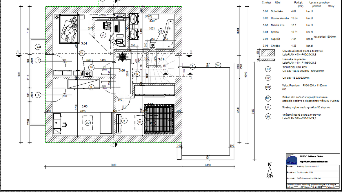 Základne informácie o rodinnom dome Ondrejka. Je to trojpodlažný , jednogeneračný dom v svahovitom teréne s pôdorysnými rozmermi 9,03m*12,43m. Je navrhnutý z tehlového stavebného systému Leier tak, aby vyhovoval súčasným tepelnotechnickým požiadavkám nízkoenergetickej budovy na bývanie. Má sedlovú strechu so sklonom 35°. Strešný plášť je zateplený tromi vrstvami tepelnej izolácie Isover, zakončený je strešnou krytinou Blachotrapez z plechovej škridle. Podkrovie je presvetlené a prevetrané strešnými oknami Velux Premium FK06 660 x 1180mm v počte 3ks a balkónovými dverami plastovými v počte 2ks.