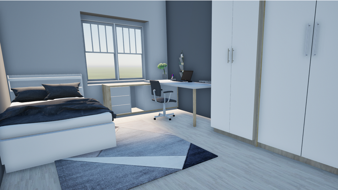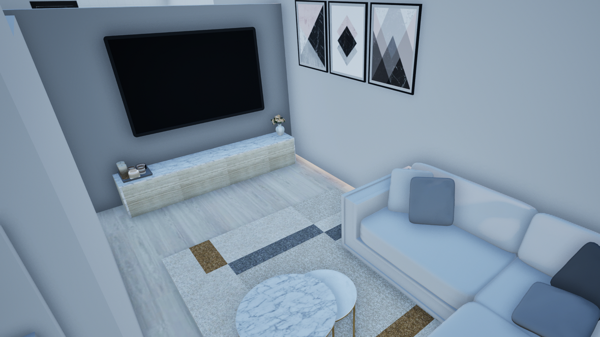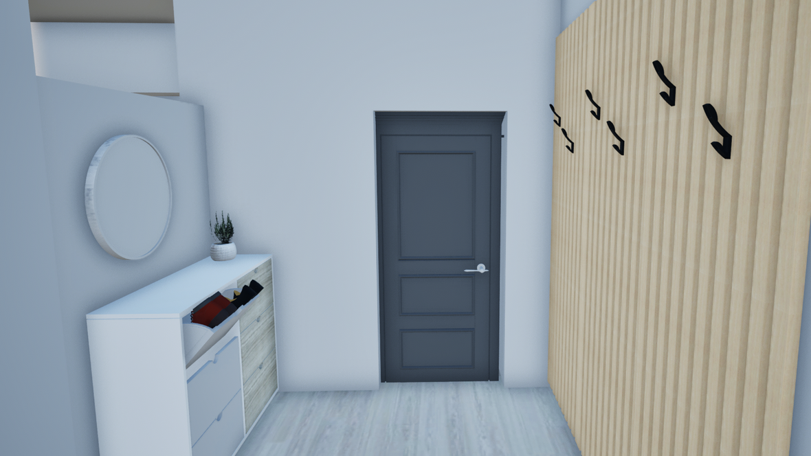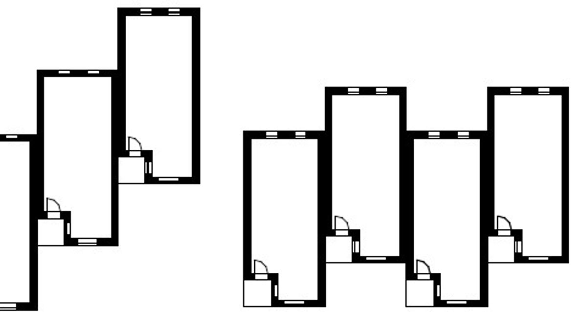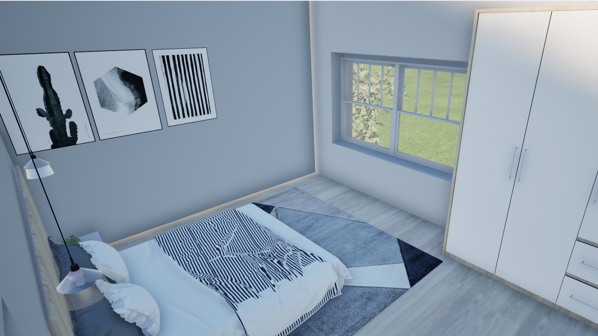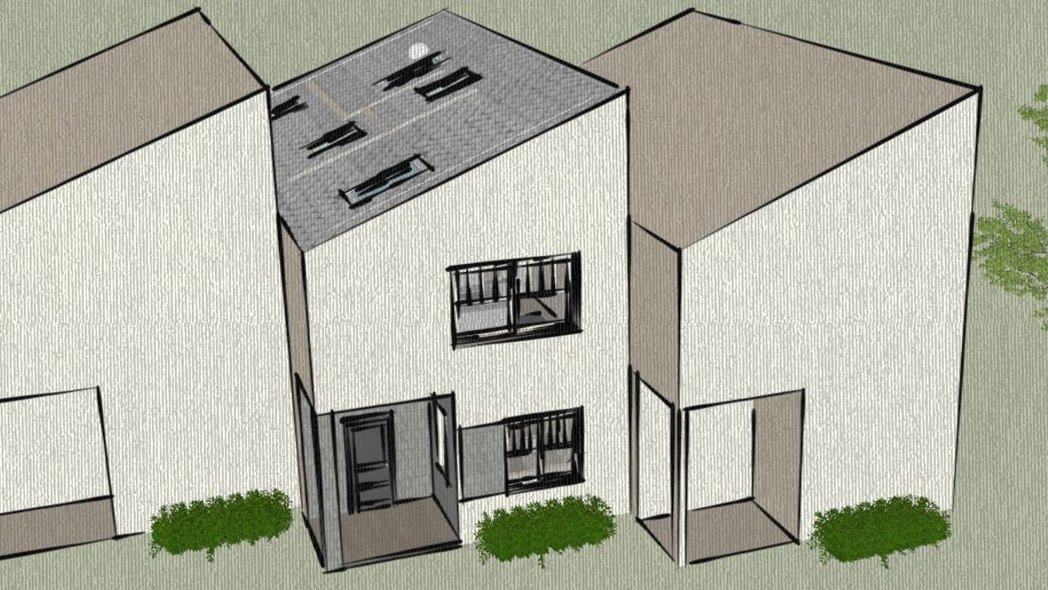 Novostavba 3-izbového domu môže stáť ako samostatný rodinný dom alebo môže byť súčasťou v radovej zástavbe s rôznym uskočením. Pri dispozícii je zohľadnená možná pozícia, ako budú domy zoradené k sebe. Uskočeným odsadením sú domy odklonené od seba a obyvatelia domov majú výhľad len na svoj pozemok, čo zabezpečuje istú úroveň súkromia. Zoskupením jedného druhu uskočenia na oboch stranách zrkadlovo vieme medzi oboma stranami, v širšej časti ulice, vytvoriť malé "nádvorie" pre komunitné stretávanie obyvateľov danej lokality. Mojim cieľom bolo vytvorenie komunitného "centra" pre určitú skupinu obyvateľov s deťmi, ktorý zdieľajú spoločné záujmy. Dom je riešený s pultovou strechou, je 2-podlažný. V I.NP sa nachádza denná časť - vstup, obývacia izba, kuchyňa s jedálňou, WC a kúpeľňa. II. NP pozostáva z detskej izby, kúpeľne a spálne. Vonkajší vzhľad je minimalistický v čistých, jemných líniách; vstup je krytý uskočením podlažia v rohu. Na dom sa hodí svetlá omietka aj svetlá krytina. Domu dodávajú denné svetlo aj strešné okná Velux. Lokalita je vhodná pre mestskú zástavbu.