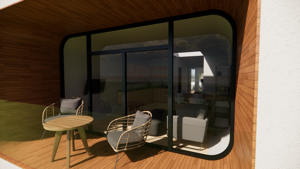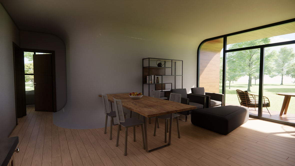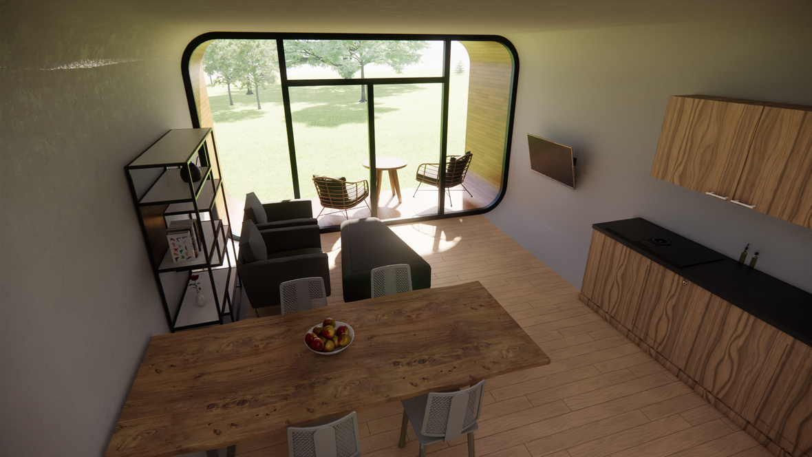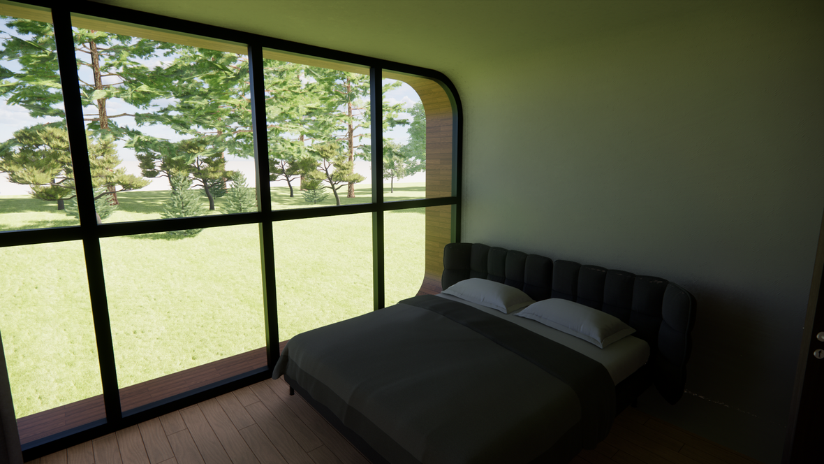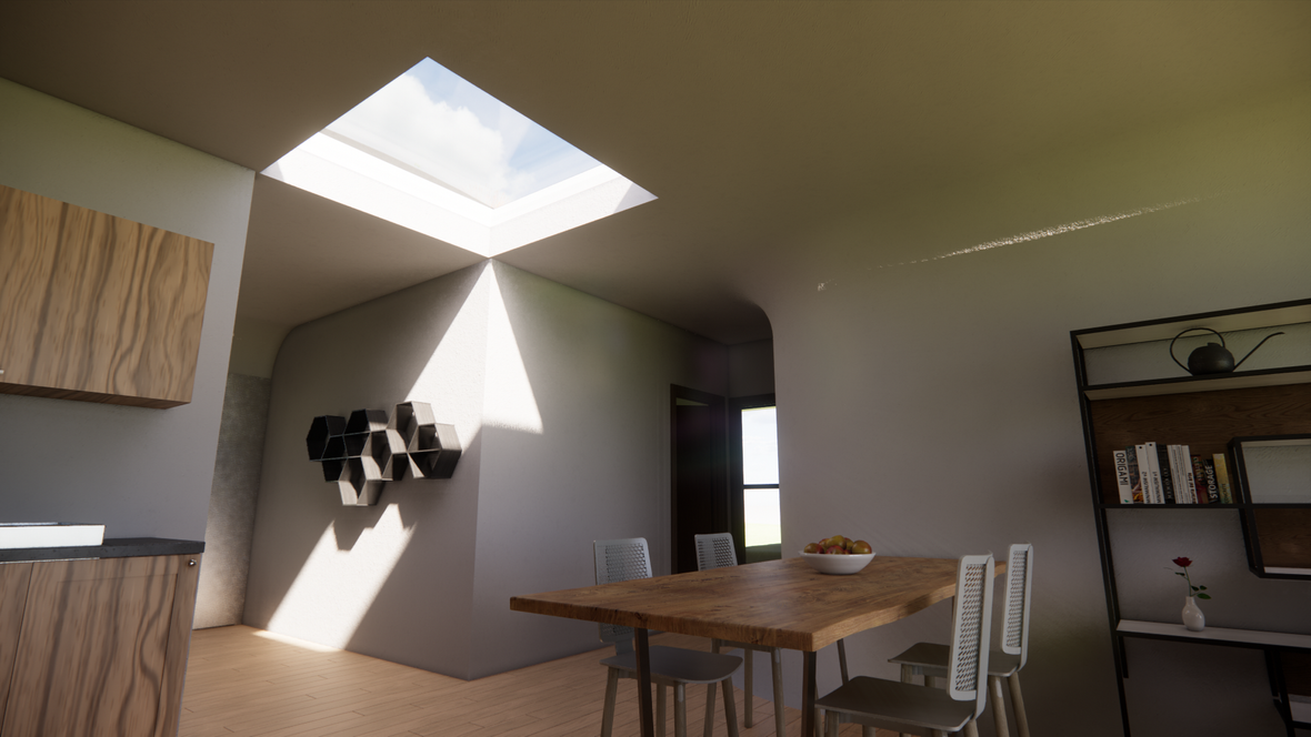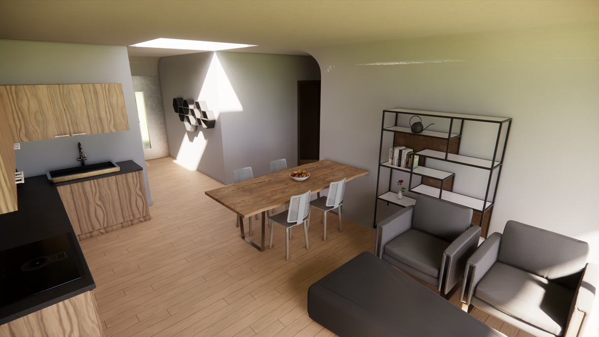 Môj návrh spočíva vo vytvorení modelového rodinného domu, v tomto prípade s pôdorysným tvarom písmena L. Jeho umiestnenie je vhodné v strmšom teréne, v úzkom kontakte s prírodou. Jeho dominantou a výhodou je jednoduchý spôsob založenia na pilíeroch v tvare hyperbolidu, v ktorom sa nachádzajú inžinierske siete. Z hľadiska vnútornej dispozície sa jedná o trojizbový byt pre maximálne štvorčlennú rodinu, pridaním modulu je možné kapacitu zvýšiť. Dom je z hľadiska energetického sebestačný vďaka fotovoltaických panelom, prirodzené presvetlenie vnútorných priestorov zebezpečujú svetlíky VELUX.