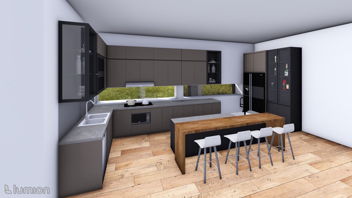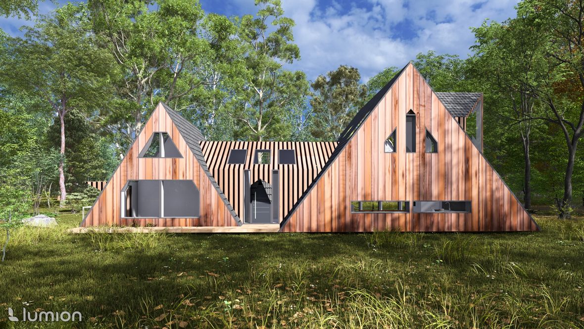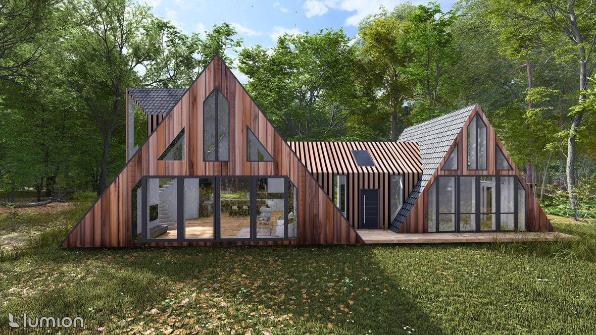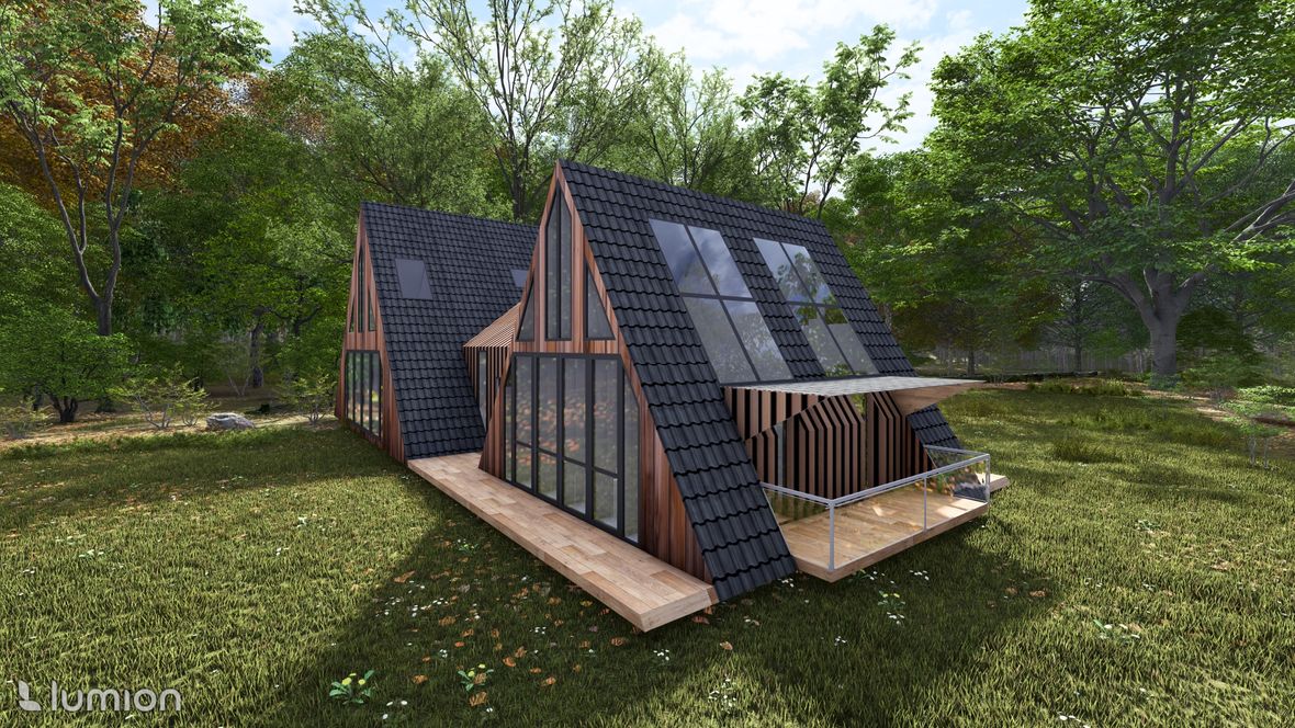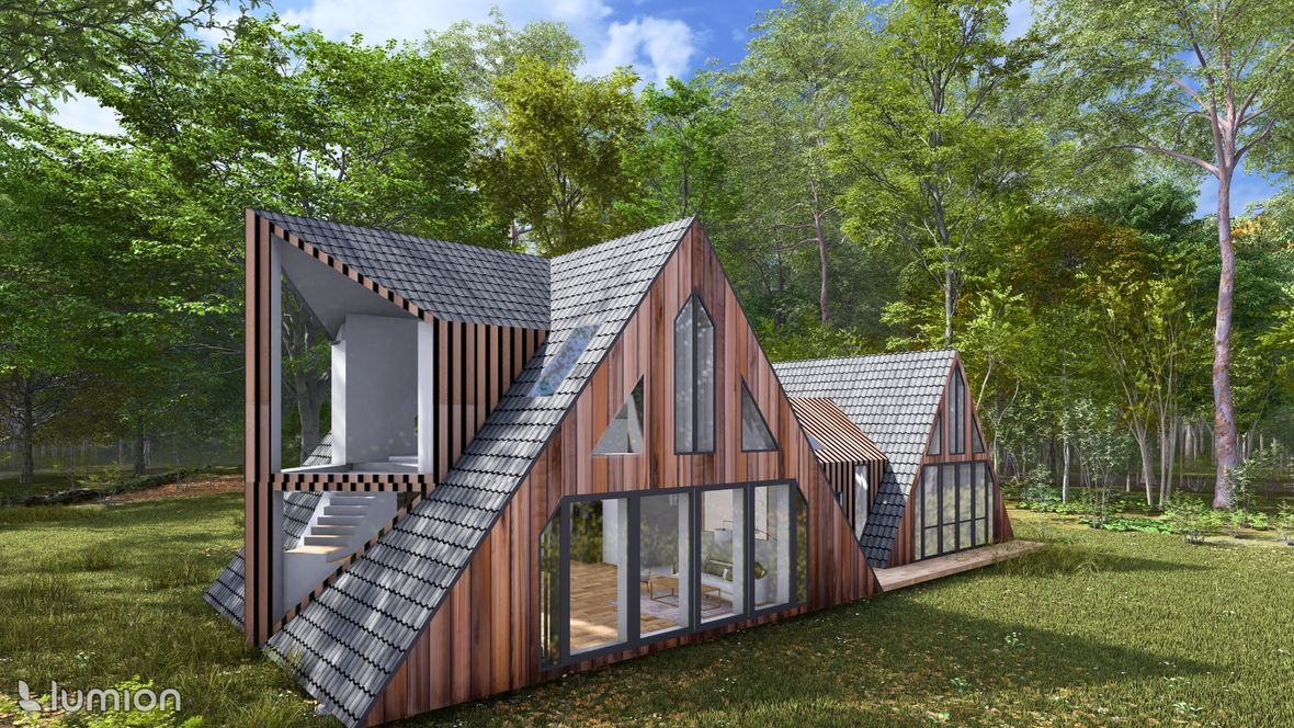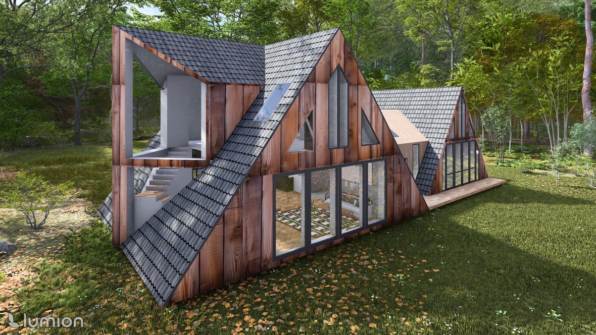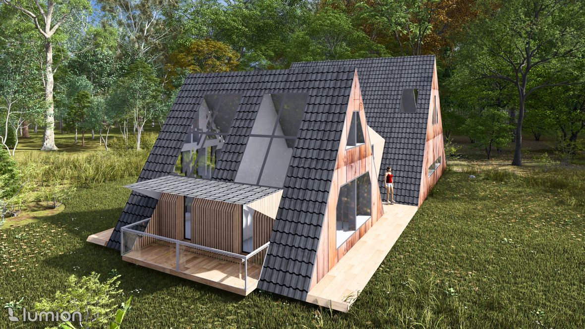 „Na samotě u lesa“ je moderný rodinný dom, ktorý má využitie aj ako chata a je určený do lesného prostredia. Tvar domu je založený na rovnostranných trojuholníkoch, ktoré dodávajú tomuto objektu neobvyklý tvar. Pôdorys objektu má tvar obdĺžnikov, jedného veľkého/hlavného a druhého menšieho. Tieto obdĺžniky sú prepojené chodbou, v ktorej sa nachádza priestor na odkladanie topánok a oblečenia, východ na terasu a jedno spoločné WC. Vstup do domu je situovaný na sever. V hlavnom obytnom priestore sa nachádza denná časť domu, tvorená obývačkou s kuchyňou. Schodiskom sa dostaneme z obývačky do 2.NP kde nájdeme spálňu, kúpeľňu a pracovňu. Na východnej strane domu sa nachádza nočná časť tvorená dvomi spálňami a samostatnými WC. Strechy objektu sú sedlového tvaru s prevismi až k terénu. Západná strana objektu je dominantná svojimi atypickými trojuholníkovými oknami, ktoré dodávajú domu zaujímavý a pútavý vzhľad. Taktiež zabezpečujú dostatok denného osvetlenia a panoramatický výhľad na les. Fasáda domu je navrhnutá v orechovom dekore, ktorý dodáva tajomstvo tomuto objektu tak, aby dom splynul s prostredím. Denné svetlo do domu zabezpečujú taktiež strešné okná velux a v izbách poskytujú aj výhľad na hviezdy priamo z postele.