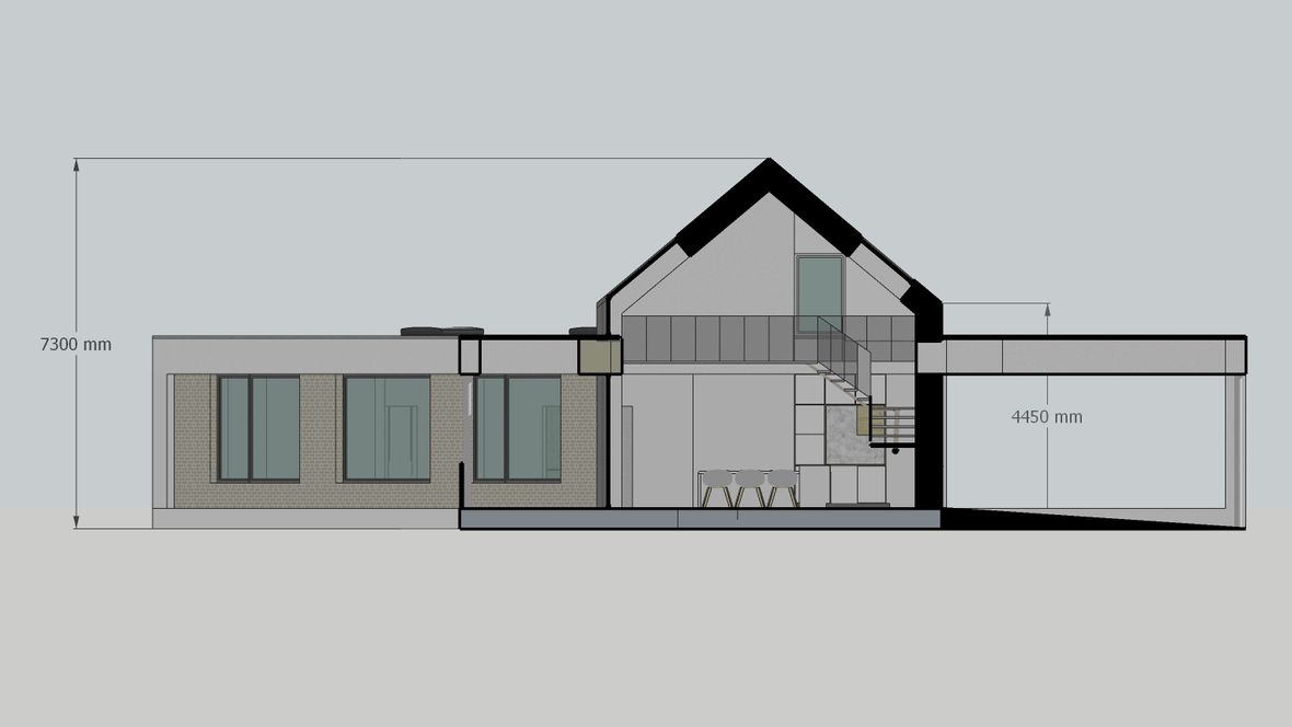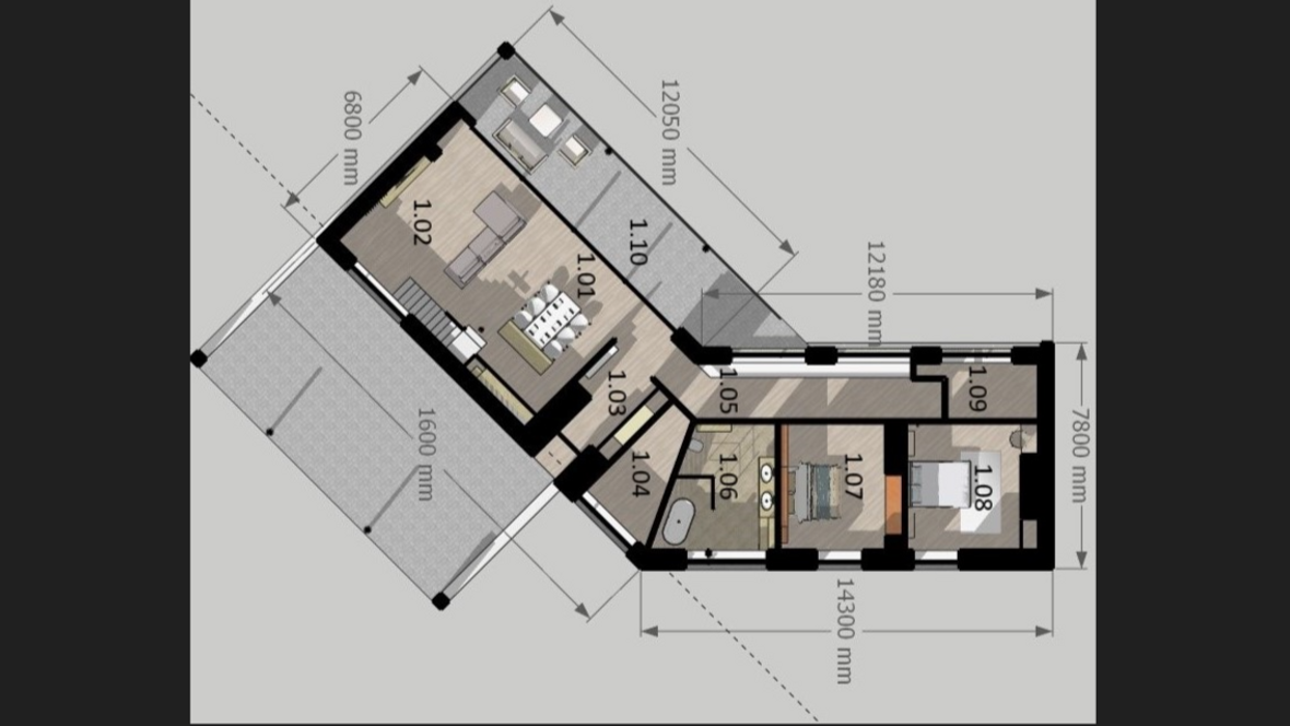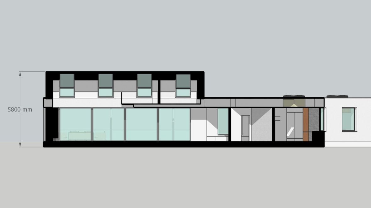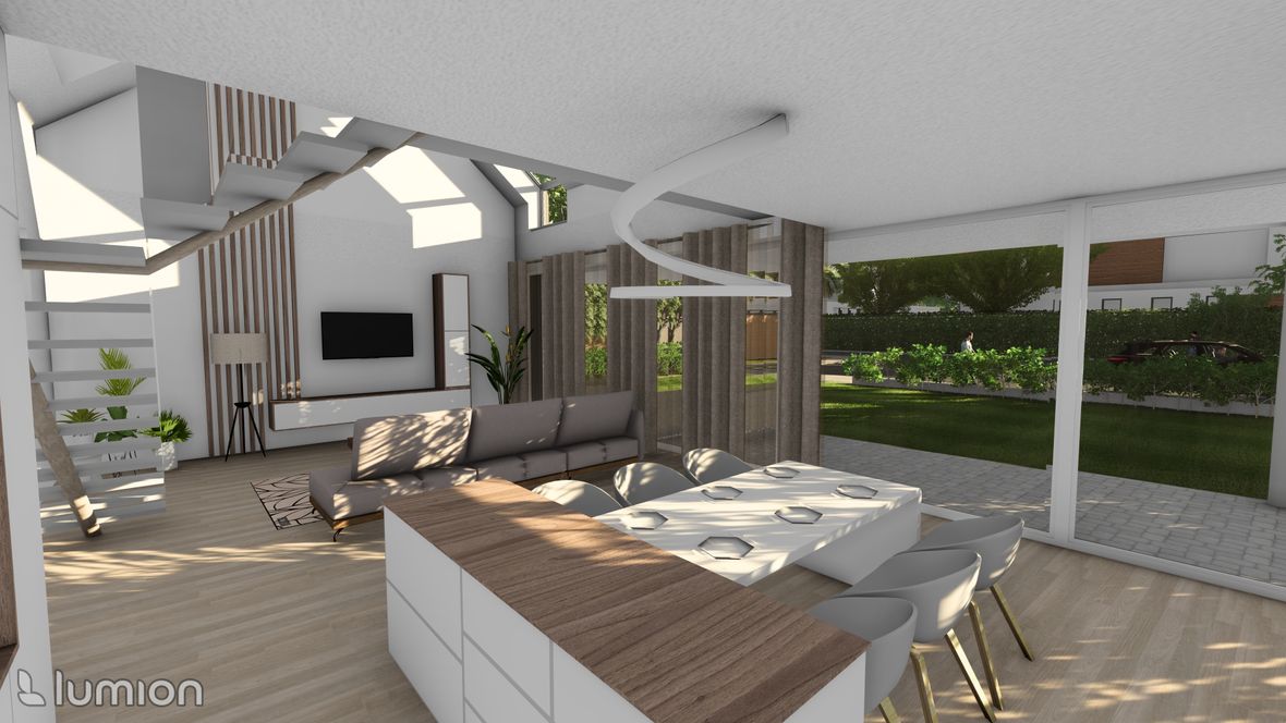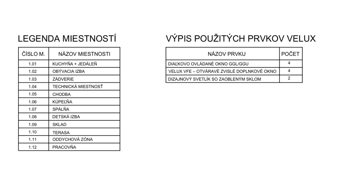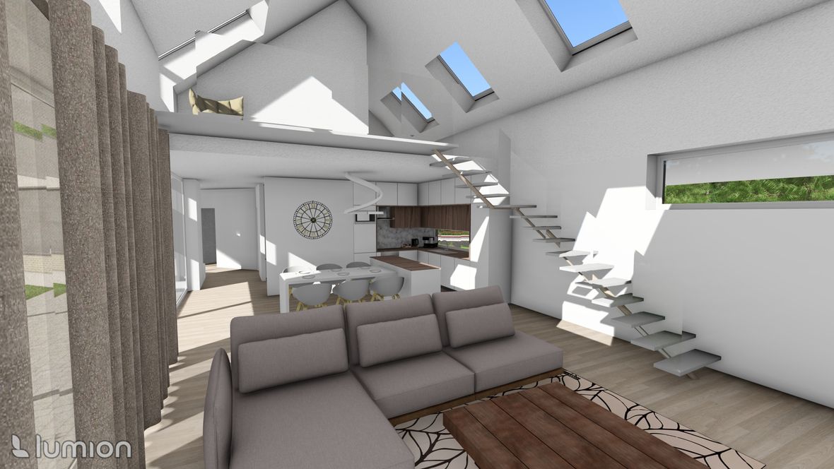 Rodinný dom je moderný a svojimi vnútornými priestormi uspokojí nároky na bývanie pre trojčlennú rodinu. Vstupné dvere do domu vás privedú do predsiene, z ktorej sa dostaneme na začiatok chodby. Tá voľne prechádza do nočnej časti domu, kde sa nachádza spálňa, detská izba a kúpeľňa s WC. V dennej časti sa nachádza spojená obývacia izba s kuchyňou, ktorá je riešená veľkopriestorovo. Priestor v dennej časti je určený na posedenia s rodinou a hosťami pri jedle, taktiež umožňuje aj výstup na terasu.