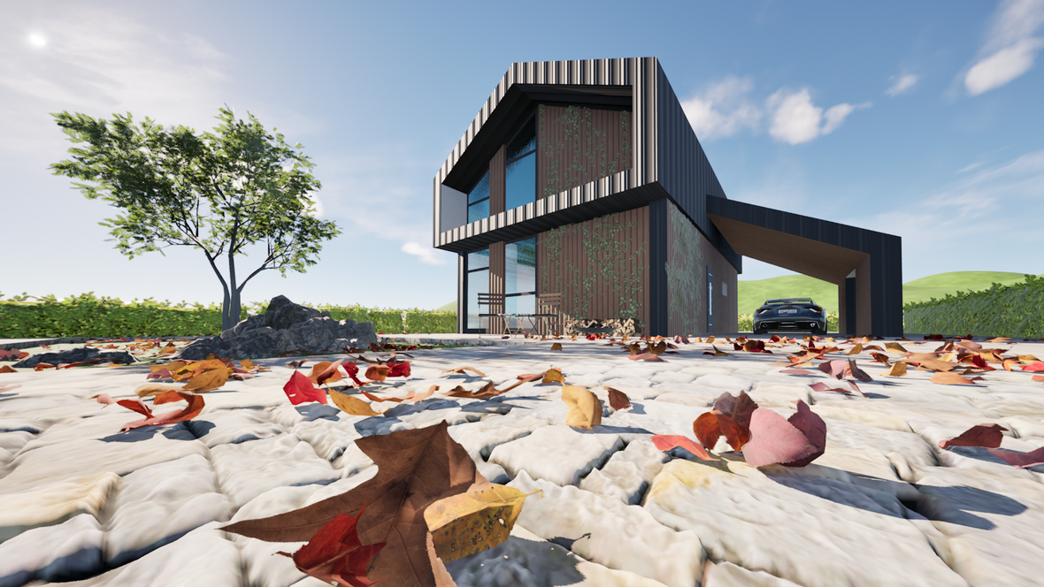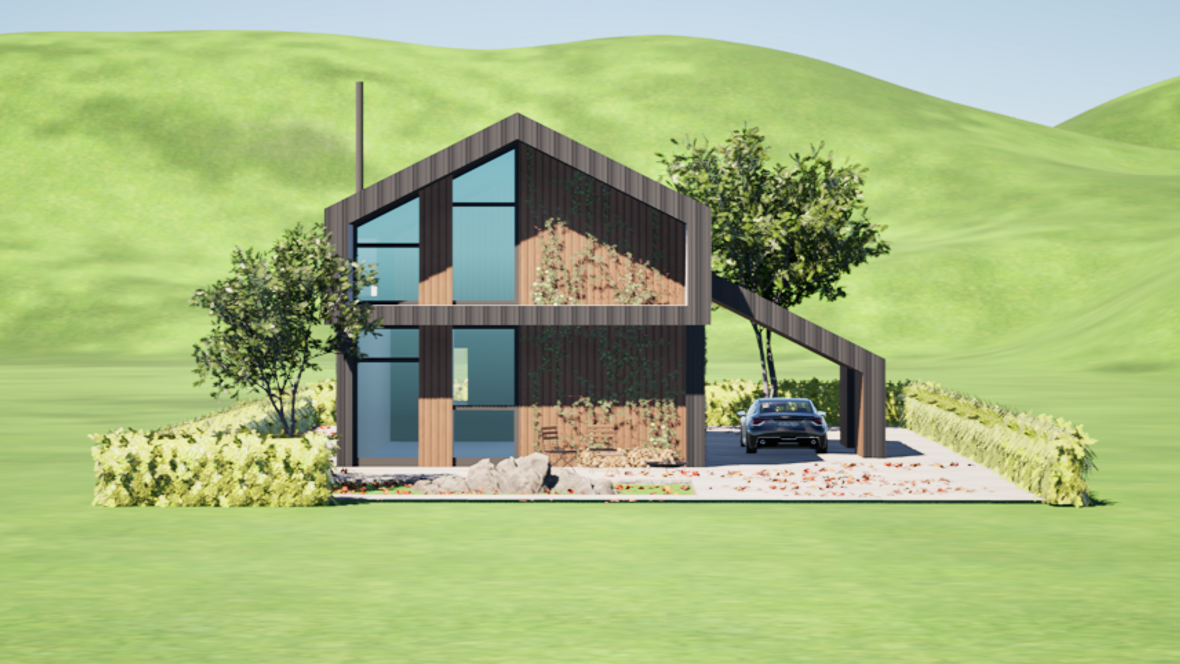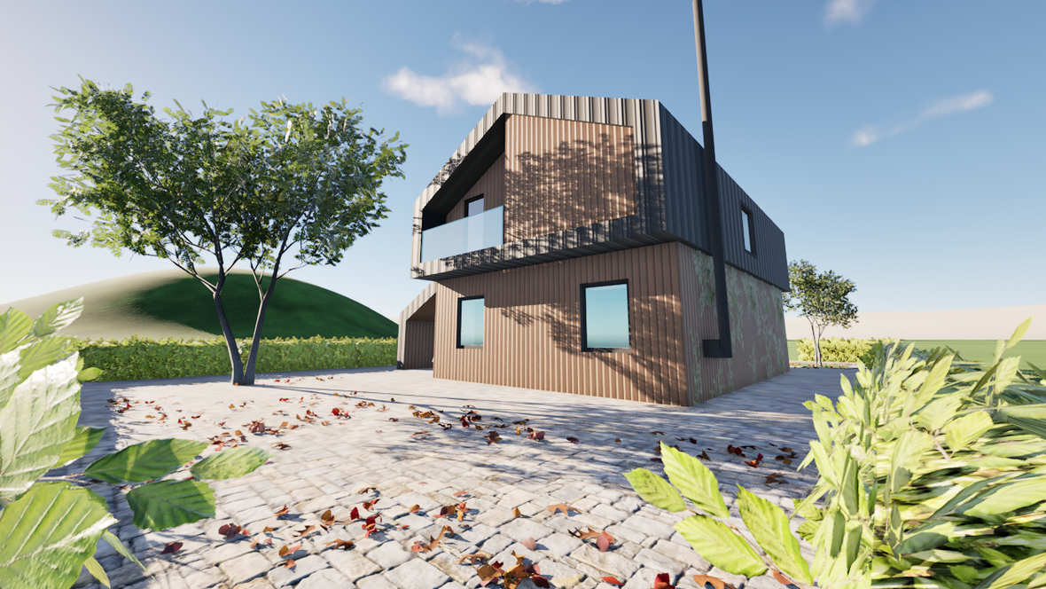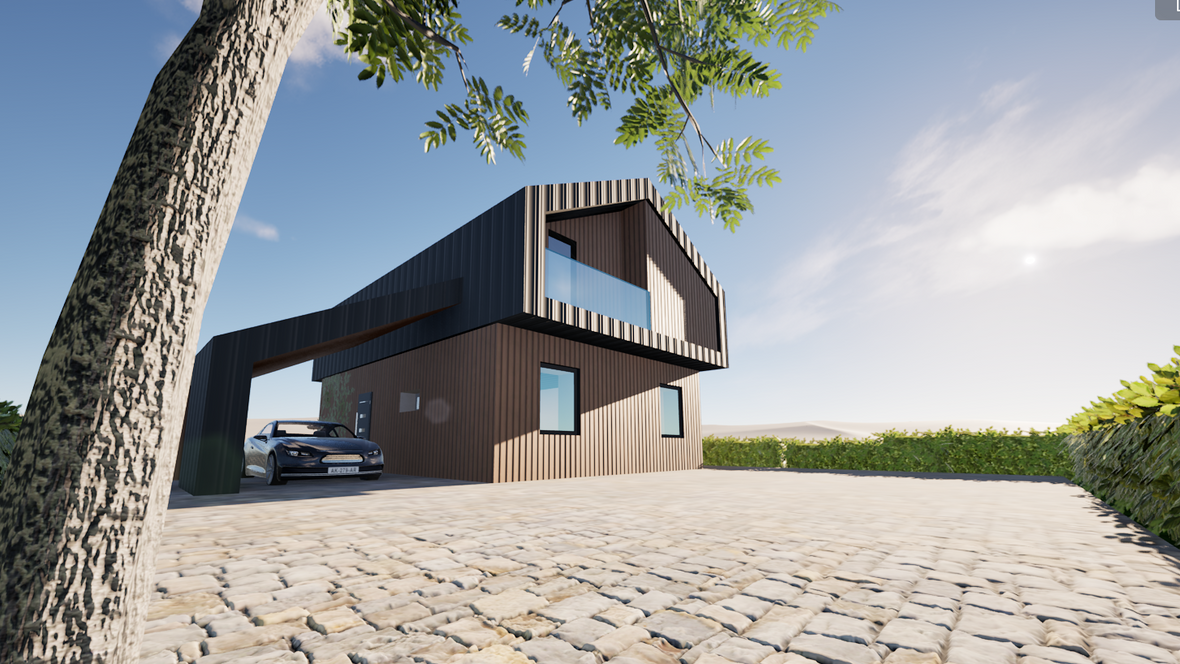 Moderný dvojpodlažný rodinný dom s čistými líniami a výraznou architektúrou je navrhnutý s dôrazom na funkčnosť a estetiku. Dominantným prvkom exteriéru je fasáda z falcovaného plechu, ktorá dodáva domu industriálny, no zároveň elegantný vzhľad a zaručuje dlhú životnosť aj minimálnu údržbu. Na fasáde sa taktiež nachádzajú prvky z dreveného obkladu, ktoré prinášajú teplejší kontrast k tmavému plechu. Dom disponuje šikmou strechou so strešnými oknami VELUX, ktoré zabezpečujú dostatok prirodzeného svetla v horných priestoroch, a prispievajú k energetickej efektívnosti domu. Prízemie ponúka priamy výstup na terasu, zatiaľ čo horné poschodie zahŕňa loggiu s výhľadom na pozemok. Vedľa domu sa nachádza praktický prístrešok pre auto, ktorý je súčasťou celkovej hmoty objektu. Oplotený pozemok je upravený zeleňou, pričom súčasťou záhrady je aj menší prírodný prvok v podobe kameňov a okrasného stromu.