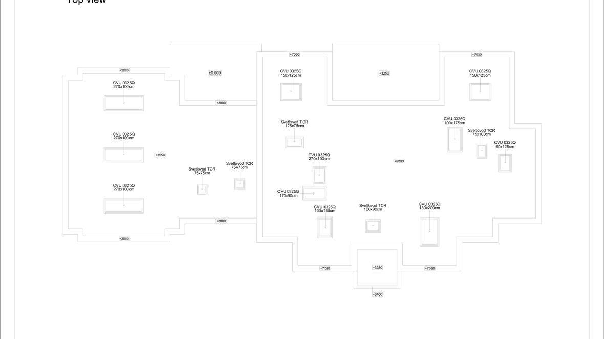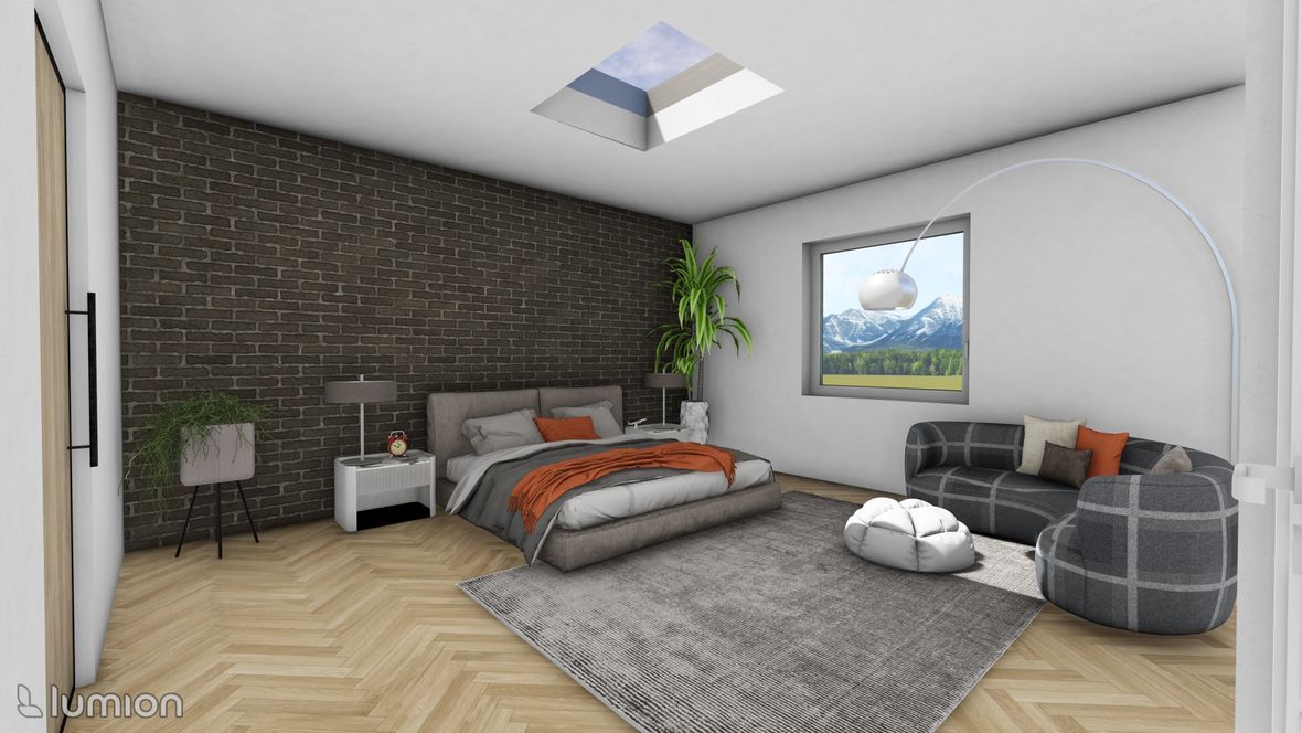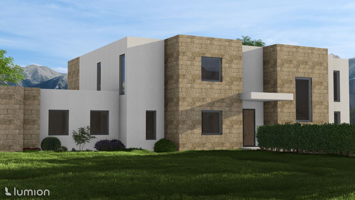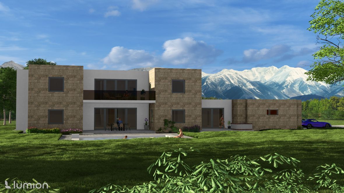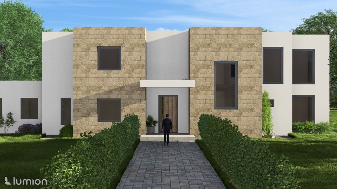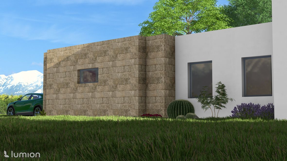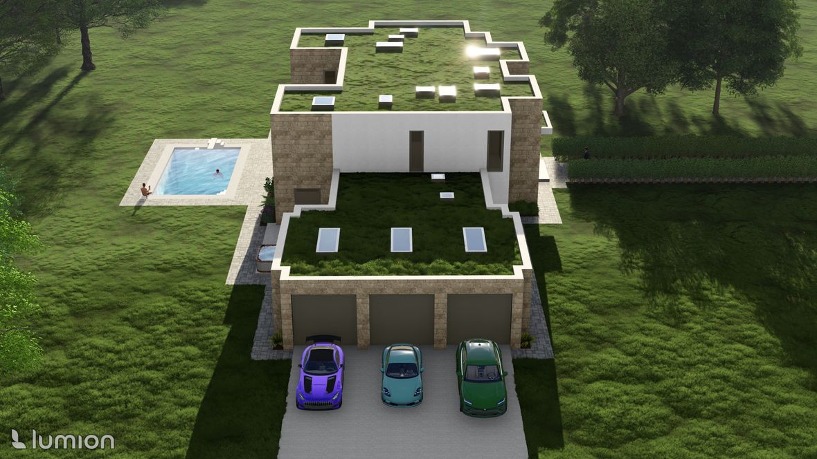 Tento súčasný rezidenčný návrh spája minimalizmus s udržateľnosťou a vytvára dom, ktorý je zároveň funkčný aj elegantný. Stavba sa vyznačuje výraznou geometrickou formou s čistými líniami a premyslenou kombináciou prírodného kamenného obkladu a bielej omietky. Fasádu prepichujú veľkoformátové okná od podlahy po strop, ktoré zaplavujú interiér prirodzeným svetlom a zároveň posilňujú vizuálne prepojenie s okolím. Kľúčovým prvkom je rozsiahle použitie strešných okien – strategicky umiestnených na zelených strechách – ktoré zabezpečujú maximálne presvetlenie vnútorných priestorov v súlade s víziou spoločnosti Velux o zdravom vnútornom prostredí. Tieto okná nielen znižujú potrebu umelého osvetlenia, ale podporujú aj pasívne solárne vykurovanie. Zelená strecha je dôkazom záväzku k ekologickému prístupu – zlepšuje tepelnoizolačné vlastnosti budovy, zadržiava dažďovú vodu a zároveň vizuálne obohacuje objekt. Zadná časť domu sa otvára do záhrady s bazénom, čím podporuje plynulý prechod medzi interiérom a exteriérom. Vstup orientovaný na sever je lemovaný živým plotom, ktorý zaisťuje súkromie a príjemné privítanie. Tento návrh ukazuje, ako môže byť moderná architektúra hlboko zakorenená v udržateľnosti bez kompromisov v oblasti luxusu či komfortu.
