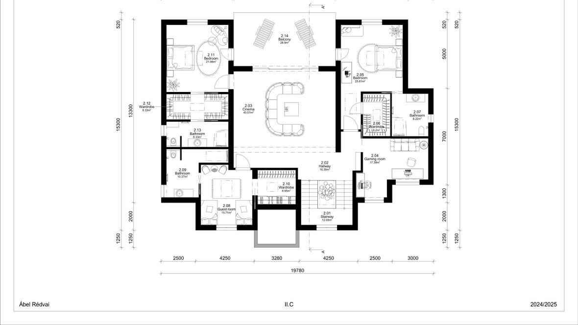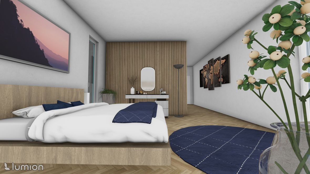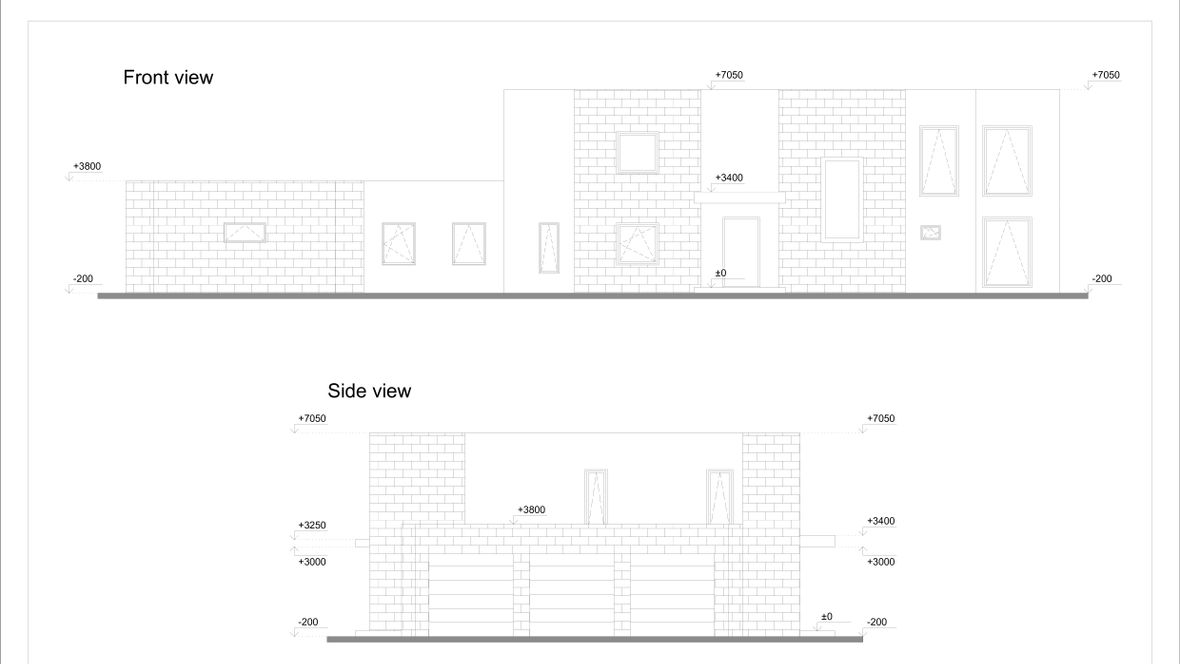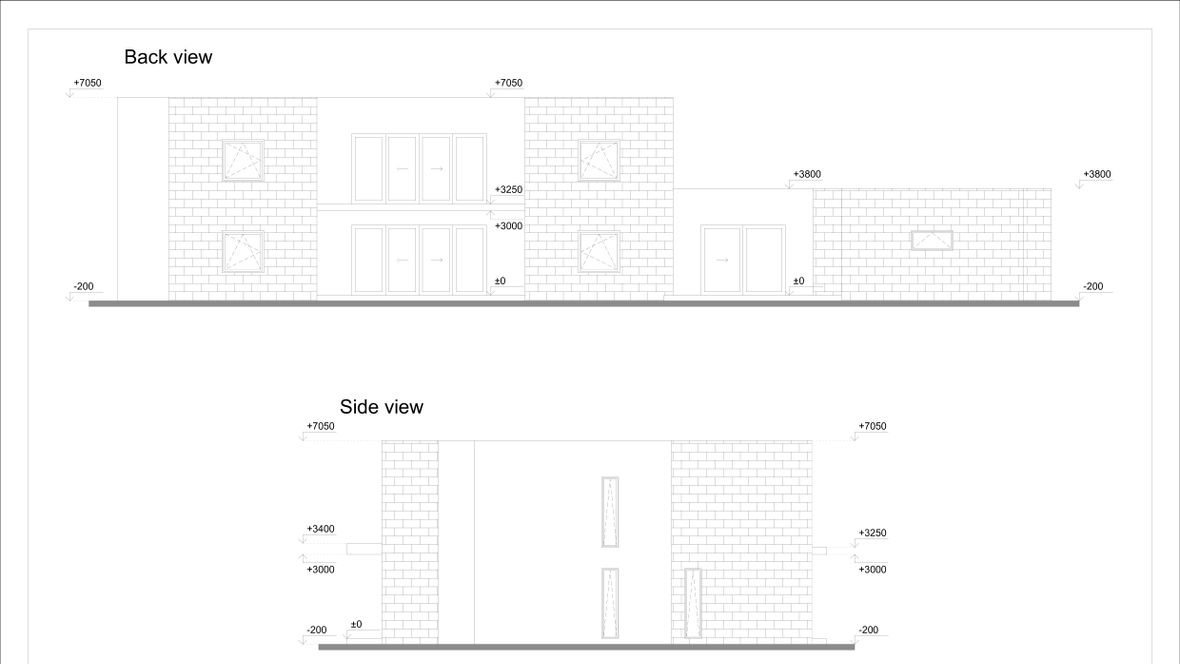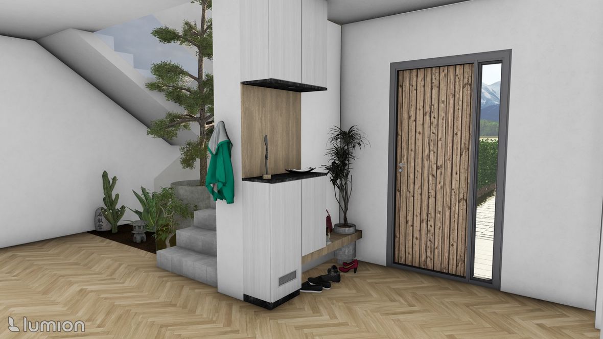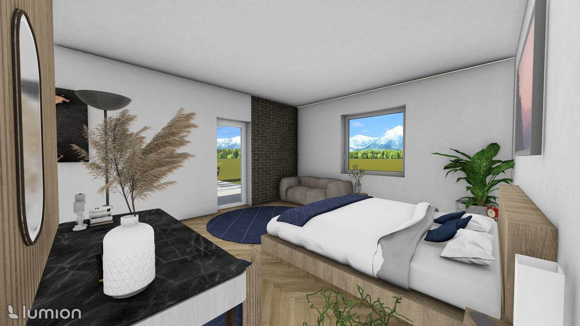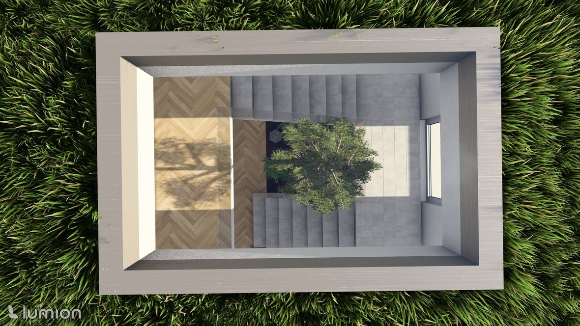 Tento súčasný rezidenčný návrh spája minimalizmus s udržateľnosťou a vytvára dom, ktorý je zároveň funkčný aj elegantný. Stavba sa vyznačuje výraznou geometrickou formou s čistými líniami a premyslenou kombináciou prírodného kamenného obkladu a bielej omietky. Fasádu prepichujú veľkoformátové okná od podlahy po strop, ktoré zaplavujú interiér prirodzeným svetlom a zároveň posilňujú vizuálne prepojenie s okolím. Kľúčovým prvkom je rozsiahle použitie strešných okien – strategicky umiestnených na zelených strechách – ktoré zabezpečujú maximálne presvetlenie vnútorných priestorov v súlade s víziou spoločnosti Velux o zdravom vnútornom prostredí. Tieto okná nielen znižujú potrebu umelého osvetlenia, ale podporujú aj pasívne solárne vykurovanie. Zelená strecha je dôkazom záväzku k ekologickému prístupu – zlepšuje tepelnoizolačné vlastnosti budovy, zadržiava dažďovú vodu a zároveň vizuálne obohacuje objekt. Zadná časť domu sa otvára do záhrady s bazénom, čím podporuje plynulý prechod medzi interiérom a exteriérom. Vstup orientovaný na sever je lemovaný živým plotom, ktorý zaisťuje súkromie a príjemné privítanie. Tento návrh ukazuje, ako môže byť moderná architektúra hlboko zakorenená v udržateľnosti bez kompromisov v oblasti luxusu či komfortu.