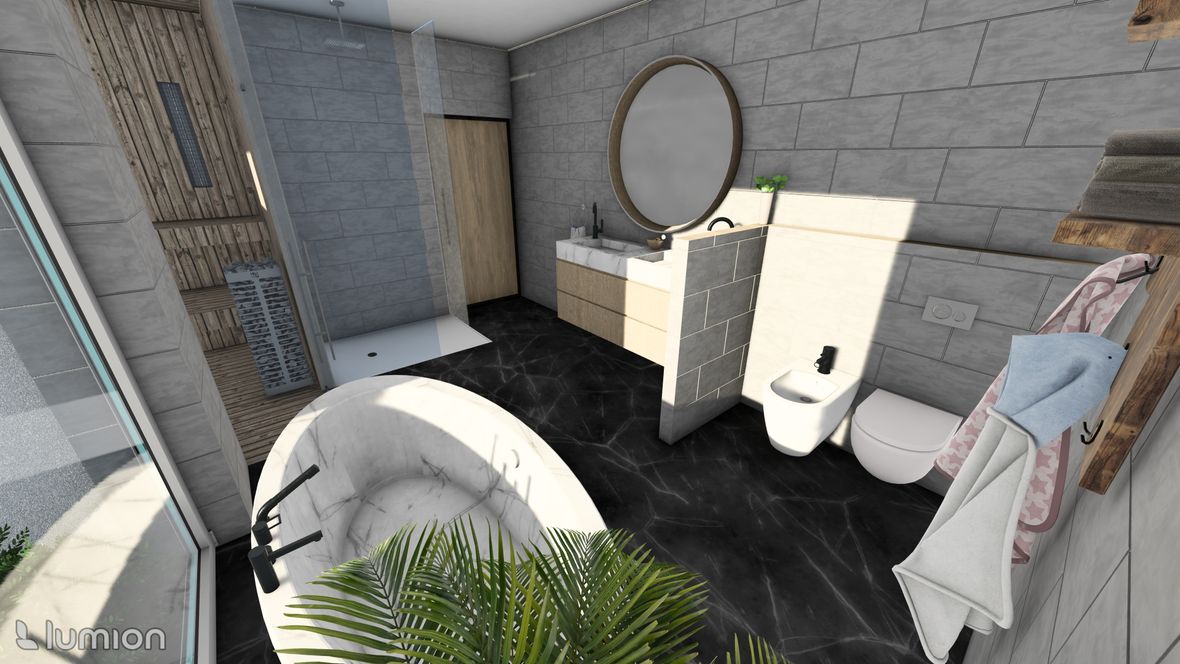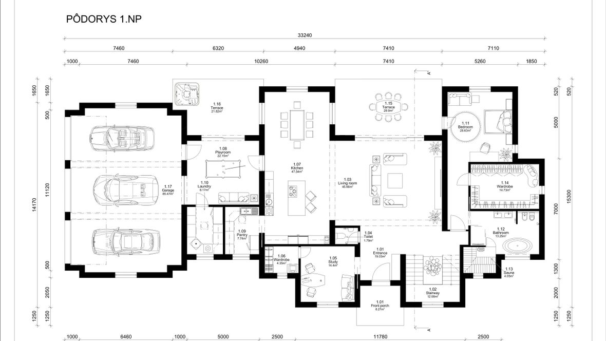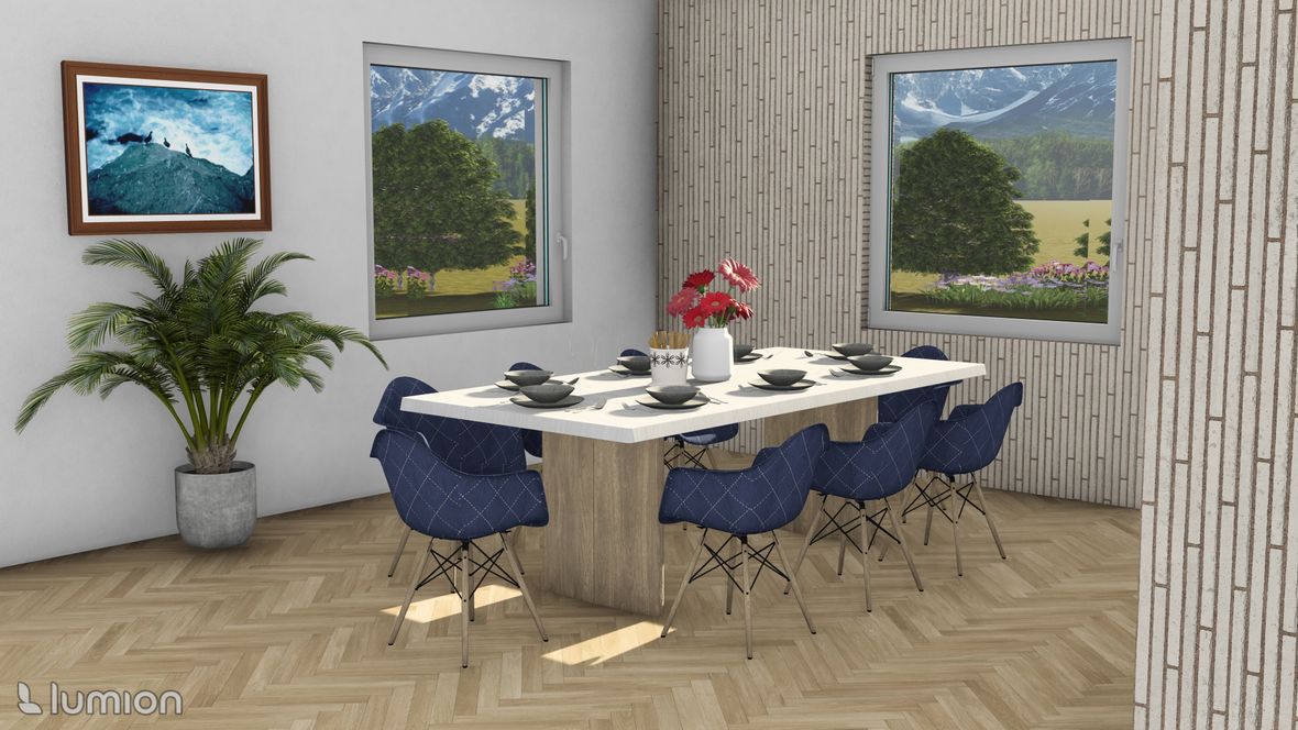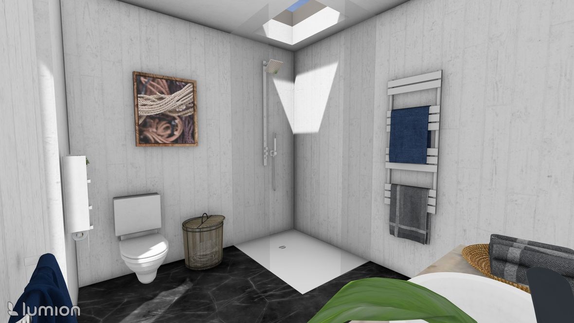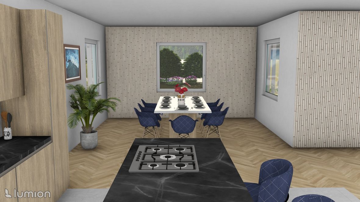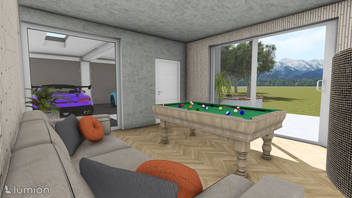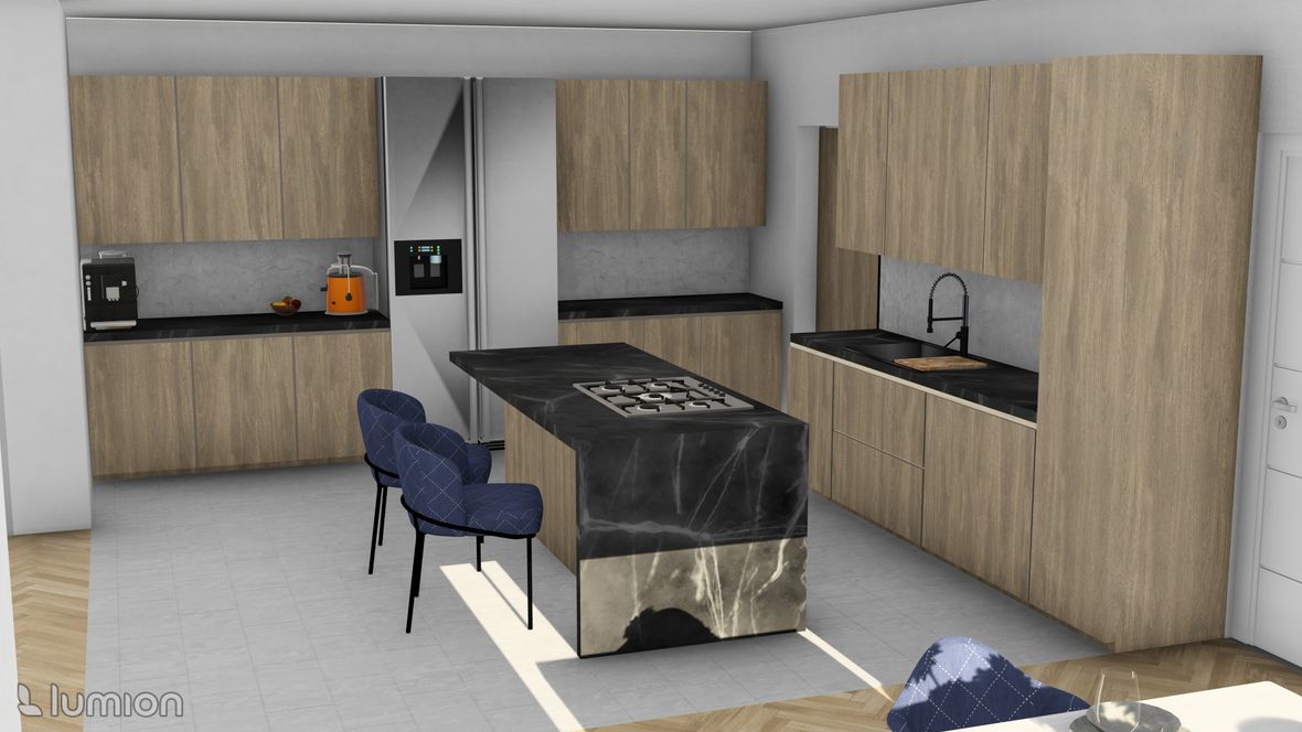Tento súčasný rezidenčný návrh spája minimalizmus s udržateľnosťou a vytvára dom, ktorý je zároveň funkčný aj elegantný. Stavba sa vyznačuje výraznou geometrickou formou s čistými líniami a premyslenou kombináciou prírodného kamenného obkladu a bielej omietky. Fasádu prepichujú veľkoformátové okná od podlahy po strop, ktoré zaplavujú interiér prirodzeným svetlom a zároveň posilňujú vizuálne prepojenie s okolím. Kľúčovým prvkom je rozsiahle použitie strešných okien – strategicky umiestnených na zelených strechách – ktoré zabezpečujú maximálne presvetlenie vnútorných priestorov v súlade s víziou spoločnosti Velux o zdravom vnútornom prostredí. Tieto okná nielen znižujú potrebu umelého osvetlenia, ale podporujú aj pasívne solárne vykurovanie. Zelená strecha je dôkazom záväzku k ekologickému prístupu – zlepšuje tepelnoizolačné vlastnosti budovy, zadržiava dažďovú vodu a zároveň vizuálne obohacuje objekt. Zadná časť domu sa otvára do záhrady s bazénom, čím podporuje plynulý prechod medzi interiérom a exteriérom. Vstup orientovaný na sever je lemovaný živým plotom, ktorý zaisťuje súkromie a príjemné privítanie. Tento návrh ukazuje, ako môže byť moderná architektúra hlboko zakorenená v udržateľnosti bez kompromisov v oblasti luxusu či komfortu.