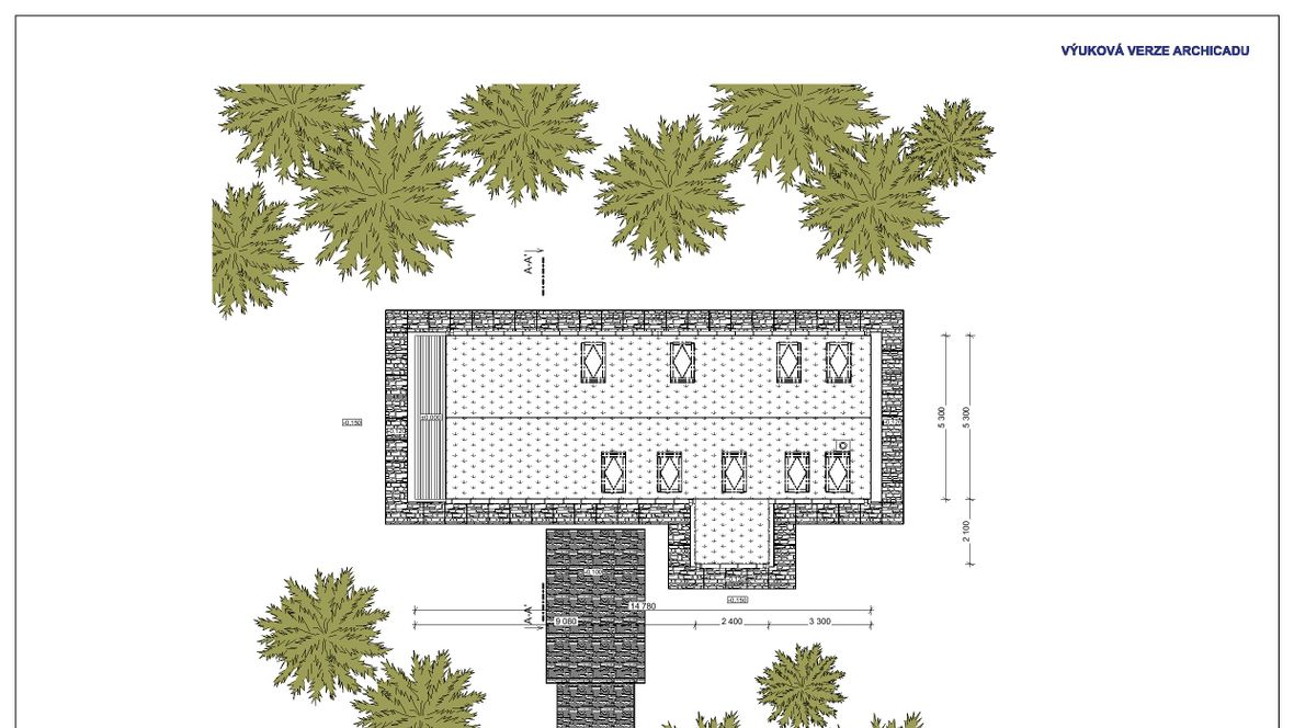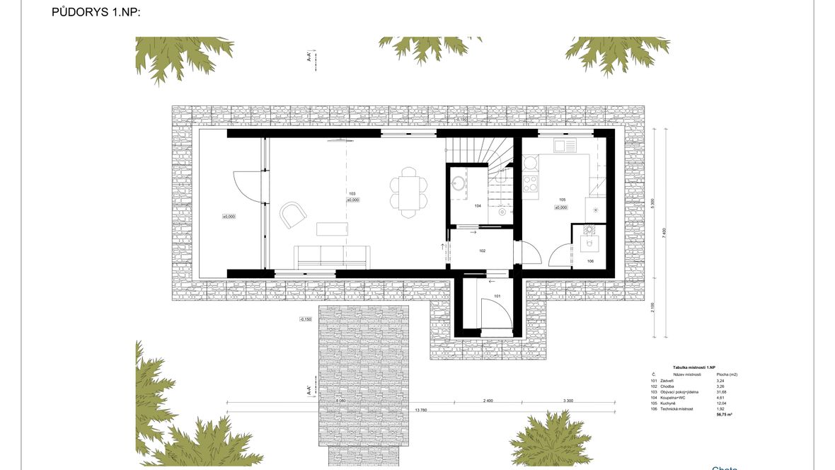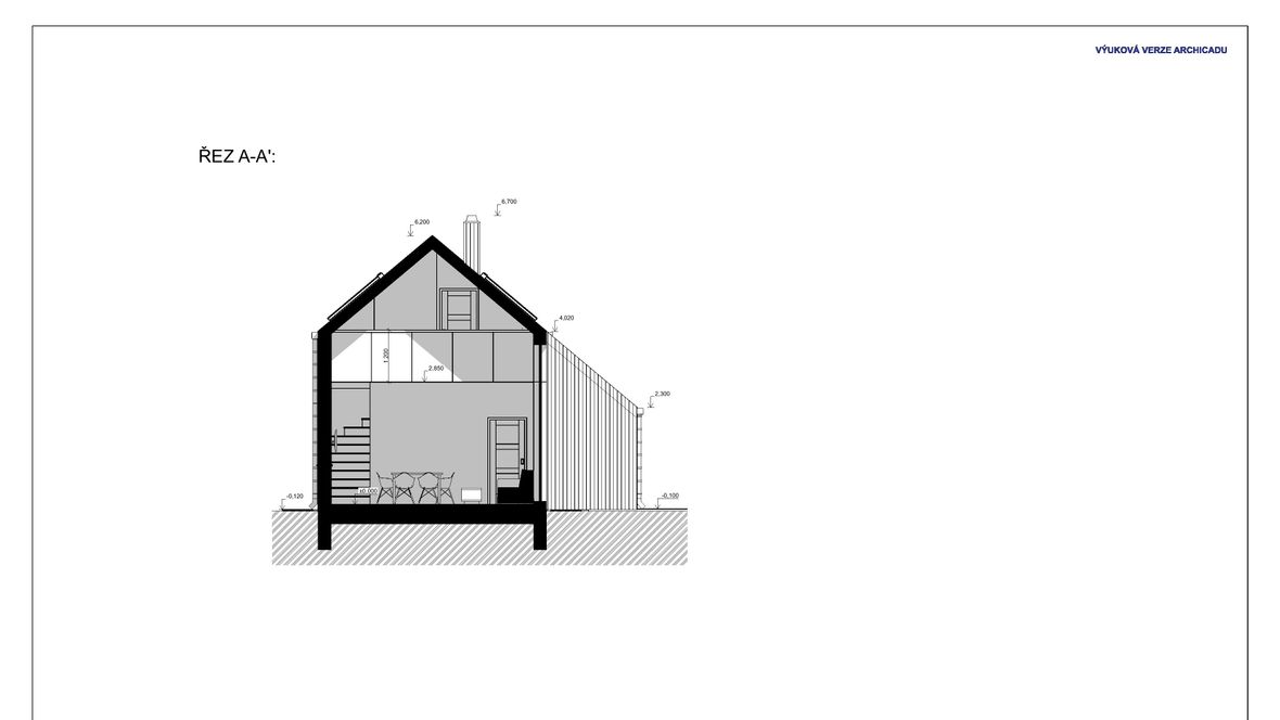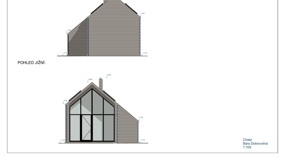 ARCHITEKTONICKÉ A DISPOZIČNÍ ŘEŠENÍ: Mým cílem bylo navrhnout útulnou horskou chatu pro pár, obklopenou přírodou a čerstvým vzduchem a určenou především k víkendovému odpočinku. Architektura objektu koresponduje s okolní přírodou. Budova svým tvarem odkazuje na tradiční obdélníkový půdorys se sedlovou střechou. Dominantními prvky jsou vysoká okna, zajišťující prosvětlení objektu a spojení s okolní přírodou. U vstupu do prostoru 1. NP je nevelké zádveří. Následuje krátký komunikační prostor se dveřmi, které umožňují přístup do dalších místností. Na jižní straně se nachází otevřená místnost obývacího pokoje spojeného s jídelním stolem a vstupem na schodiště. Celý prostor osvětlují vysoká okna se vstupem na venkovní terasu. V severní části se nachází kuchyně, technická místnost a koupelna s WC. Druhé podlaží bez podhledu nabízí netradiční řešení ložnice. Místnost je řešena jako vnitřní balkón a rozlohou sahá do středu místnosti pod ní. Lze odsud shlížet do prostoru pod ložnicí, kde se nachází již zmiňovaný obývací pokoj. Přes malou chodbu se dostaneme do dalšího pokoje, který slouží pro ubytování případné návštěvy. Pokoj i ložnice jsou osvětleny střešními okny Velux GLU. Tato střešní okna jsou umístěna tak, aby prosvětlila celou místnost a opticky tak zvětšila její prostor. TECHNICKÉ ŘEŠENÍ: Objekt stojí na betonových základových pásech. Celá budova je navržena jako dřevostavba s bezúdržbovým venkovním dřevěným obložením. Budova je zastřešena dřevěným krovem se sedlovou střechou, která je pokrytá vegetací. Vytápění je zajištěno pomocí tepelného čerpadla země / vzduch a teplo je do objektu rozváděno přes vytápěné podlahy. Součástí střešních oken jsou zatemňovací rolety.