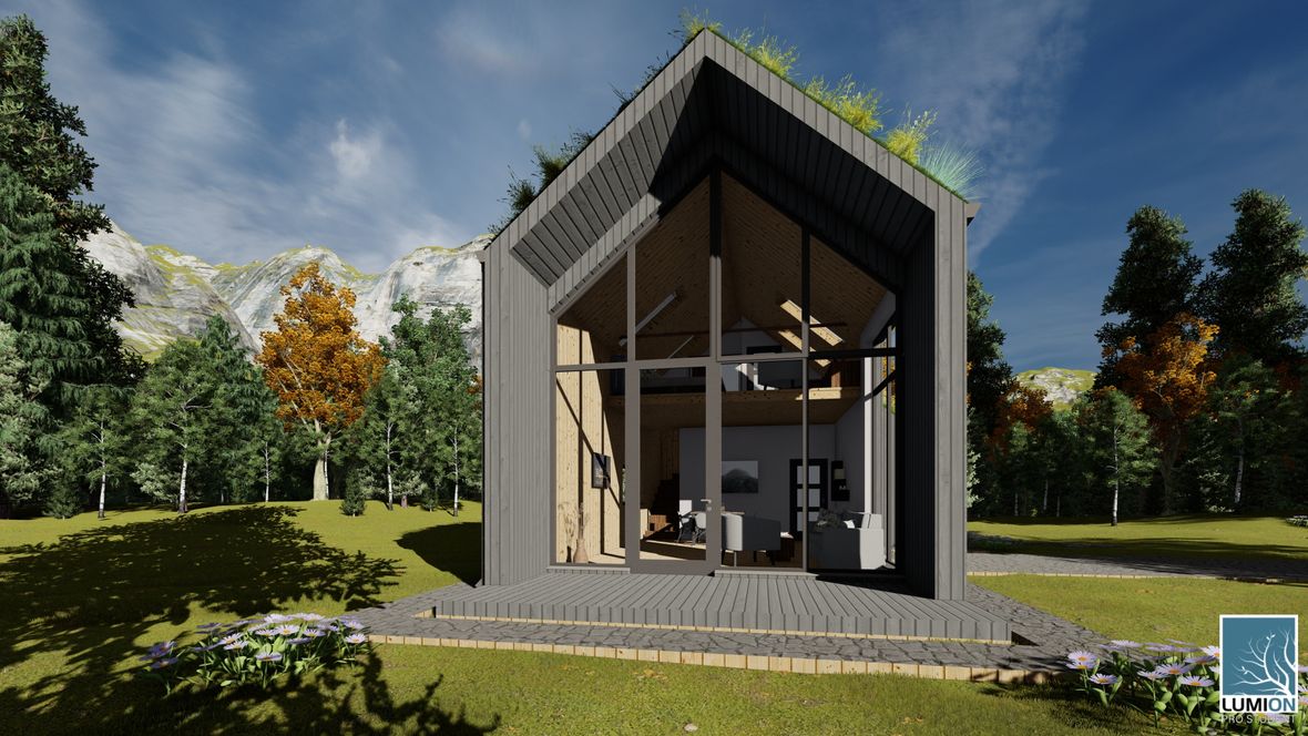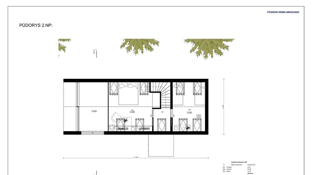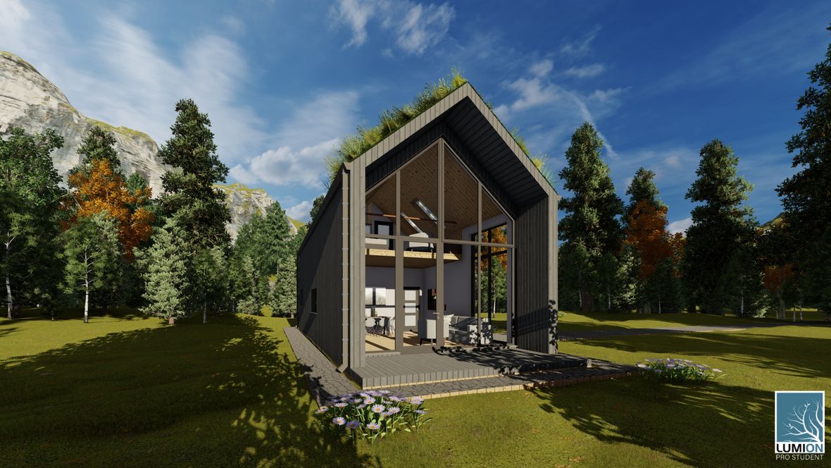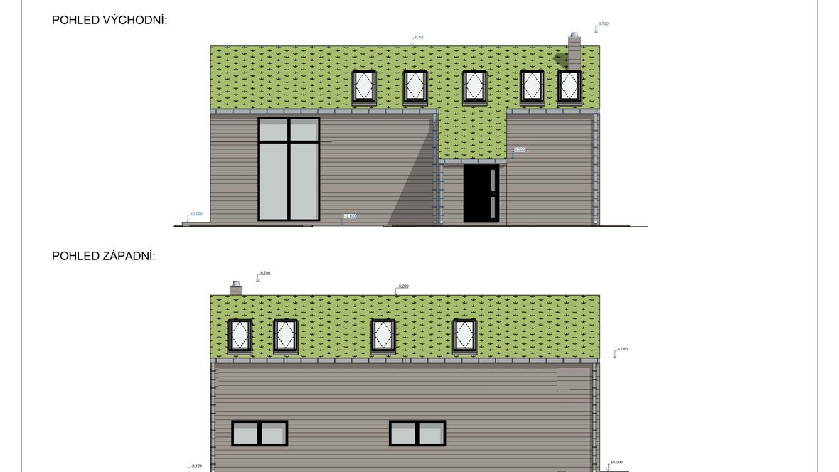ARCHITEKTONICKÉ A DISPOZIČNÍ ŘEŠENÍ: Mým cílem bylo navrhnout útulnou horskou chatu pro pár, obklopenou přírodou a čerstvým vzduchem a určenou především k víkendovému odpočinku. Architektura objektu koresponduje s okolní přírodou. Budova svým tvarem odkazuje na tradiční obdélníkový půdorys se sedlovou střechou. Dominantními prvky jsou vysoká okna, zajišťující prosvětlení objektu a spojení s okolní přírodou. U vstupu do prostoru 1. NP je nevelké zádveří. Následuje krátký komunikační prostor se dveřmi, které umožňují přístup do dalších místností. Na jižní straně se nachází otevřená místnost obývacího pokoje spojeného s jídelním stolem a vstupem na schodiště. Celý prostor osvětlují vysoká okna se vstupem na venkovní terasu. V severní části se nachází kuchyně, technická místnost a koupelna s WC. Druhé podlaží bez podhledu nabízí netradiční řešení ložnice. Místnost je řešena jako vnitřní balkón a rozlohou sahá do středu místnosti pod ní. Lze odsud shlížet do prostoru pod ložnicí, kde se nachází již zmiňovaný obývací pokoj. Přes malou chodbu se dostaneme do dalšího pokoje, který slouží pro ubytování případné návštěvy. Pokoj i ložnice jsou osvětleny střešními okny Velux GLU. Tato střešní okna jsou umístěna tak, aby prosvětlila celou místnost a opticky tak zvětšila její prostor. TECHNICKÉ ŘEŠENÍ: Objekt stojí na betonových základových pásech. Celá budova je navržena jako dřevostavba s bezúdržbovým venkovním dřevěným obložením. Budova je zastřešena dřevěným krovem se sedlovou střechou, která je pokrytá vegetací. Vytápění je zajištěno pomocí tepelného čerpadla země / vzduch a teplo je do objektu rozváděno přes vytápěné podlahy. Součástí střešních oken jsou zatemňovací rolety.