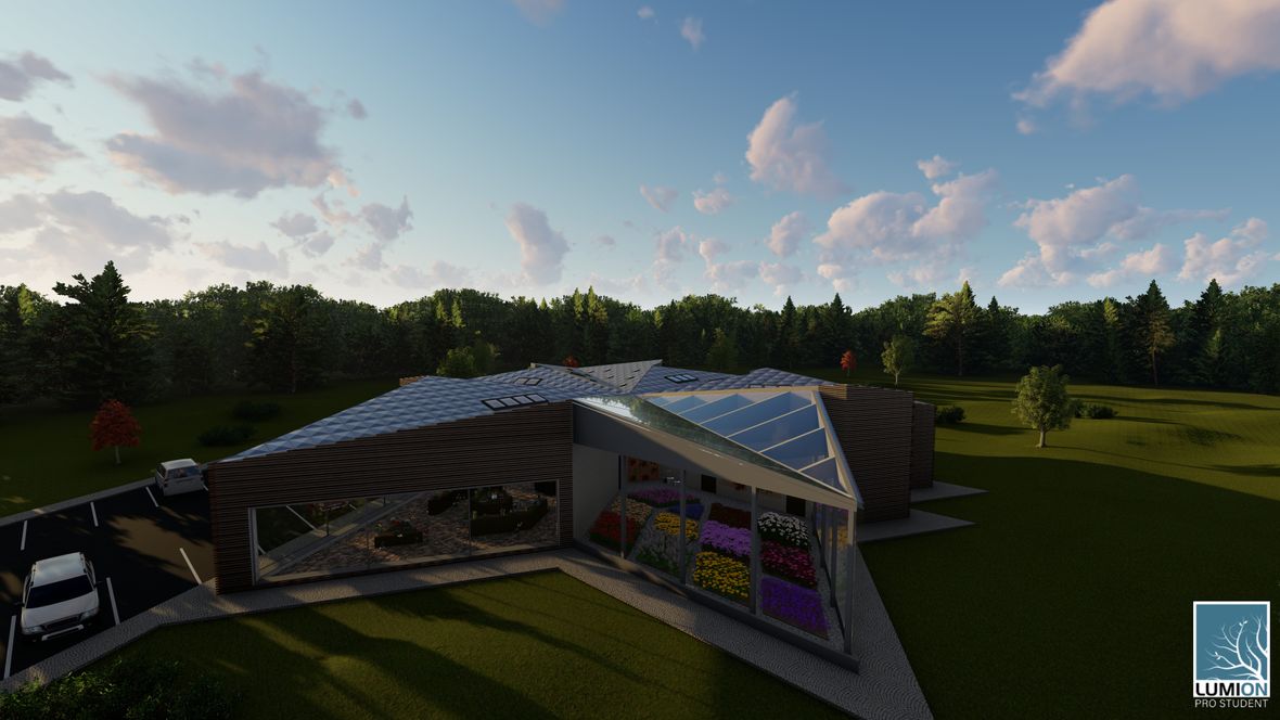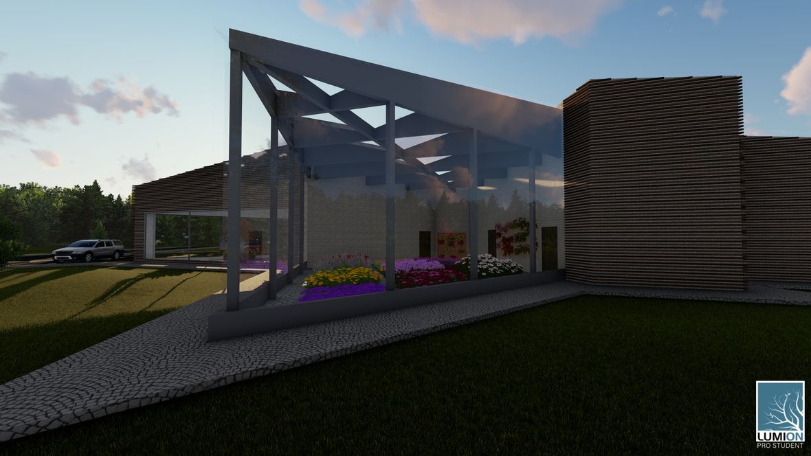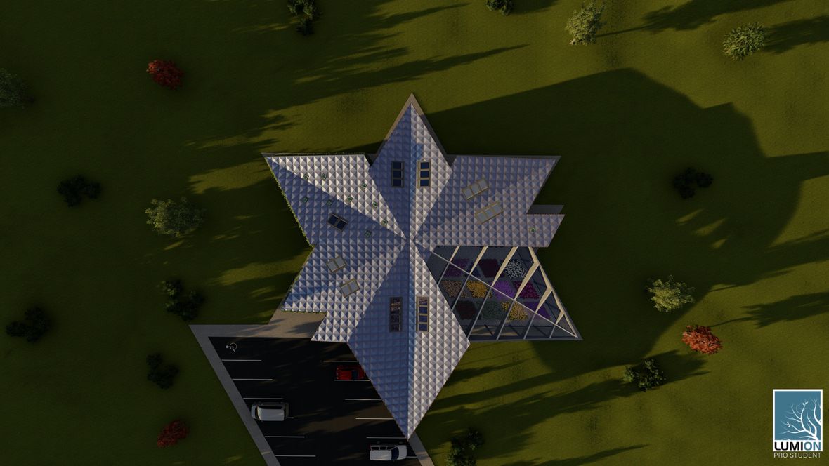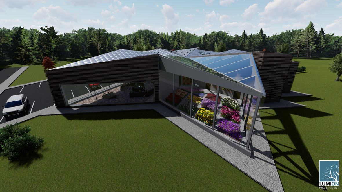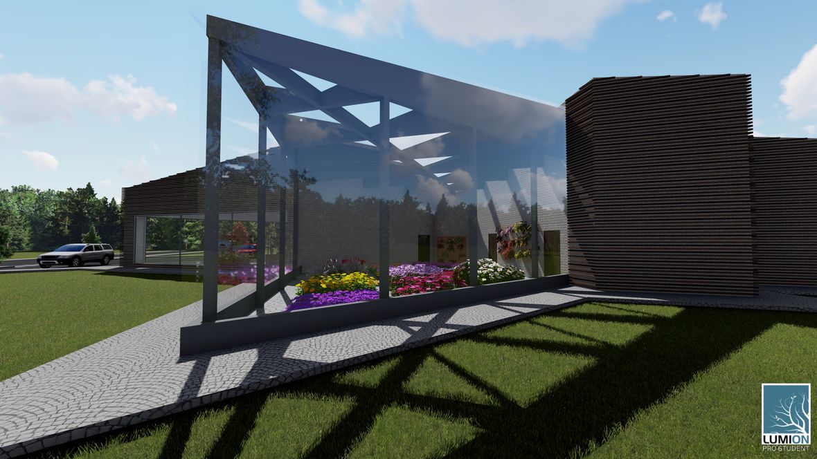 Architektonické řešení: Mým cílem bylo navrhnout vzdušné květinářství, které by mělo připomínat rozevírající se lotosový květ a dispozice by měla překvapit atypickým tvarem místností, do kterých by mělo proudit velké množství světla. Technické řešení: Díky svému specifickému tvaru střech má objekt speciální vlastnost, kterou je svod dešťové vody do samotného středu objektu, kde je voda uchována v nádrži a připravena k následnému zužitkování v podobě vody pro květiny nejen pěstované ve skleníku.