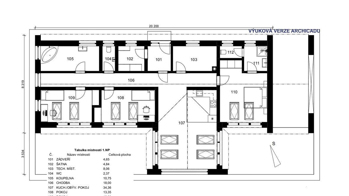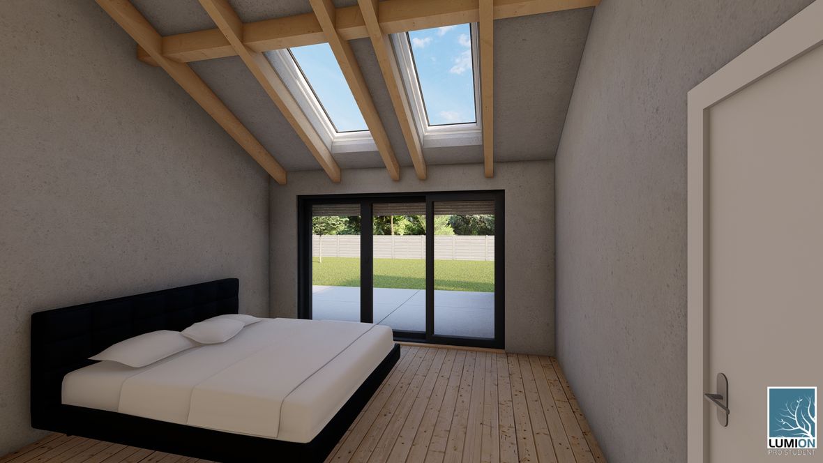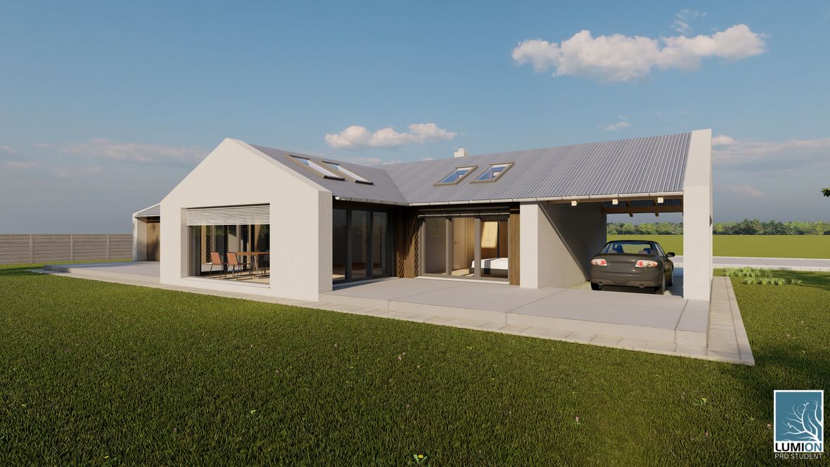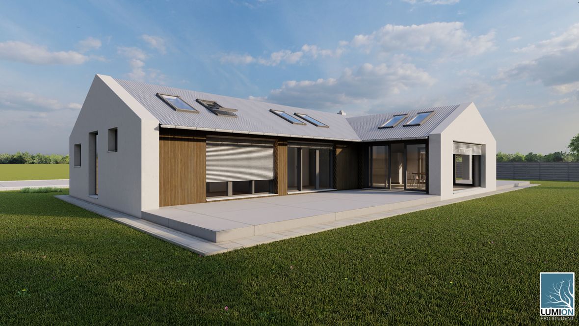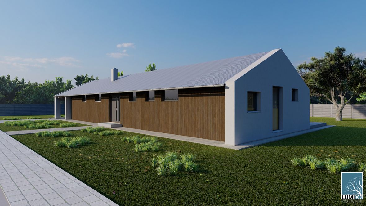 Mým záměrem bylo navrhnout jednoduchý, venkovský, rodinný dům. Výsledkem je přízemní objekt, okapově orientovaný ke komunikaci. Sedlovou střechu zakončenou atikou podpírá krov přiznaný v interiéru. Obytné místnosti jsou z jižní strany prosvětleny francouzskými a střešními okny.