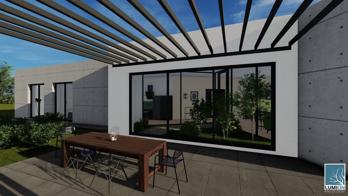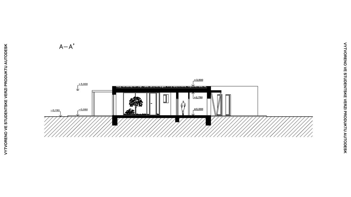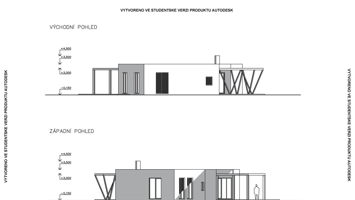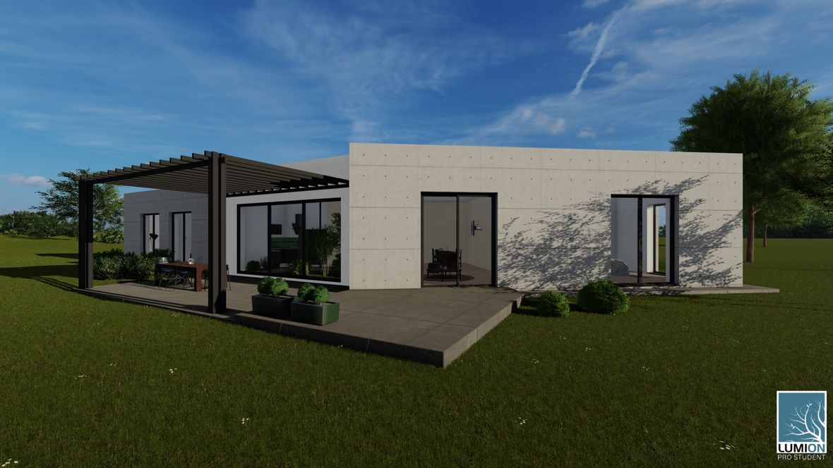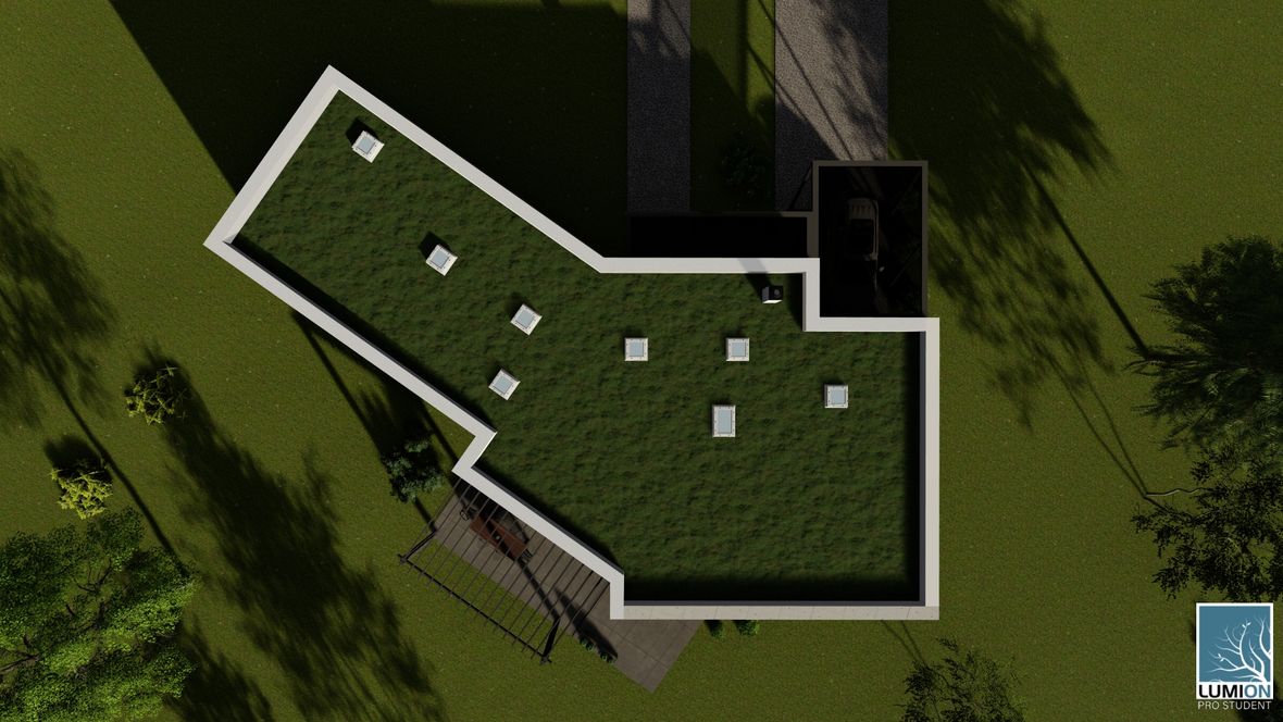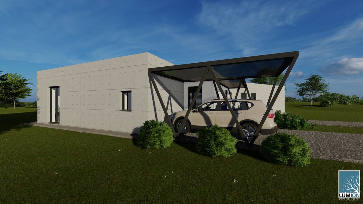 HLAVNÍ MYŠLENKA: Mým cílem bylo navrhnout rodinný dům s dostatkem přirozeného světla a maximálním propojením s okolním prostředím. Jako centrum dispozice hlavního obytného prostoru jsem zvolila prosklenou zimní zahradu, navazující na venkovní terasu. ARCHITEKTONICKÉ ŘEŠENÍ A DISPOZICE: Jedná se o jednopodlažní dům s plochou střechou, určený pro čtyřčlennou rodinu. Dominantou obytného prostoru je již zmíněná zimní zahrada, která odděluje posezení od kuchyňského koutu. Neobvyklé tvarové řešení kuchyně vzniklo díky nepravidelnému půdorysu. Všechny obytné místnosti směřují na jih. Obytný prostor směrem do zahrady rozšiřuje venkovní terasa, stíněná lehkou dřevěnou pergolou. Můžeme na ni vstoupit jak z obývacího pokoje, tak ze zimní zahrady. V severní, vstupní části je navrženo zastřešené parkovací stání se sloupky tvaru písmene V. KONSTRUKČNÍ A MATERIÁLOVÉ ŘEŠENÍ: Dům je navržen jako zděná stavba s plochou vegetační střechou. Kompozice jeho hmot je podtržena materiály fasády – obytné části jsou z pohledového betonu, vstupní část a zimní zahrada mají na fasádě hladkou bílou omítku. Materiály fasád kontrastují s dřevem terasy a pergoly.