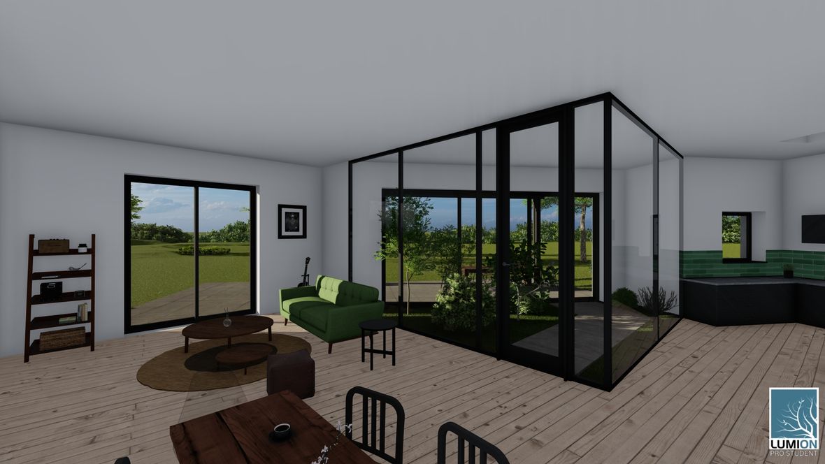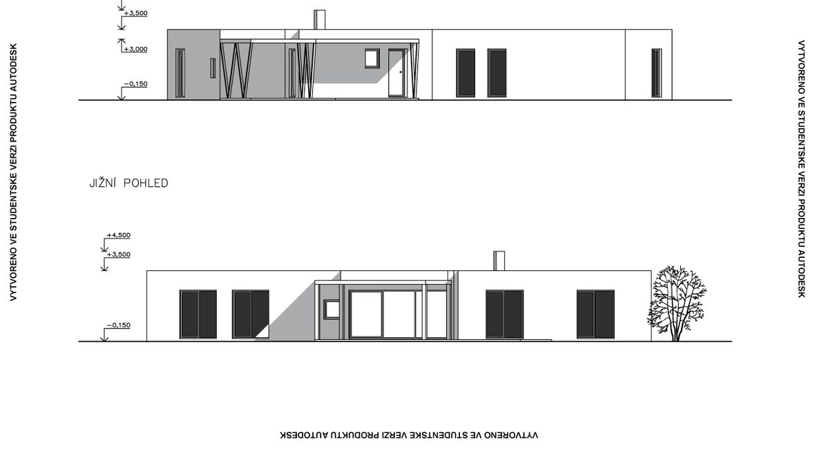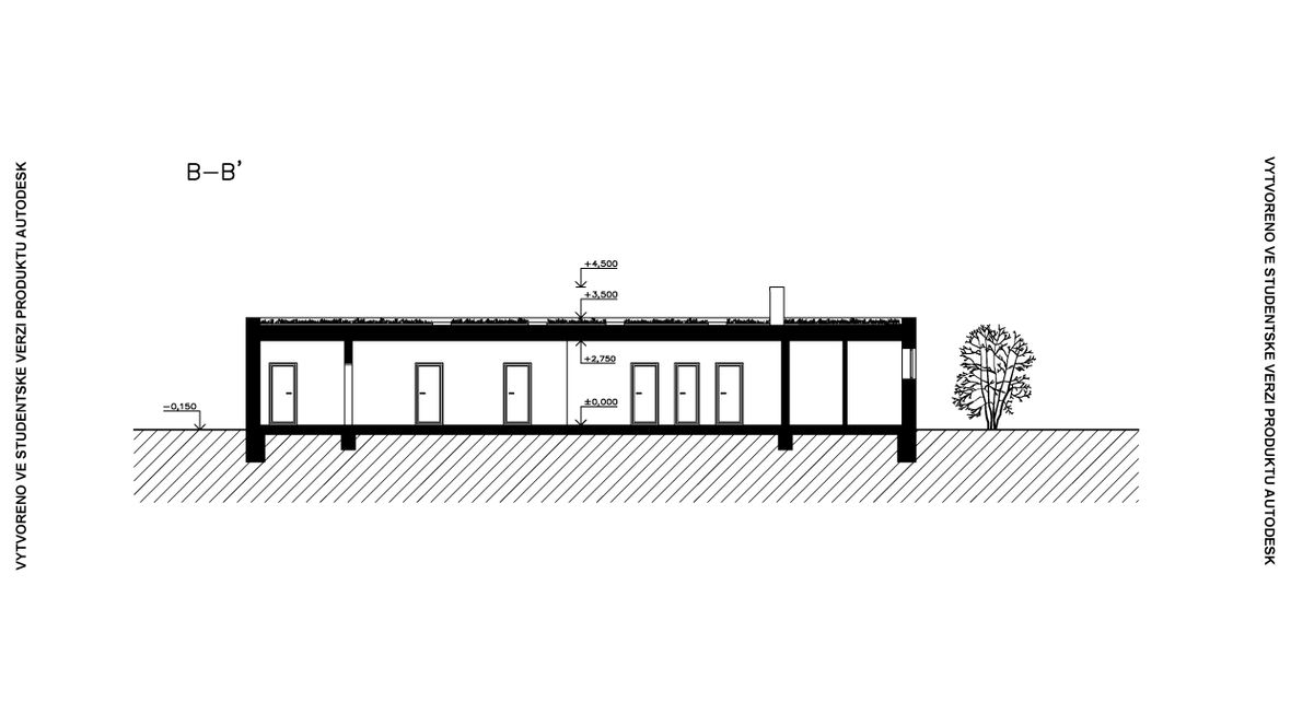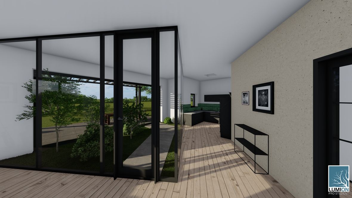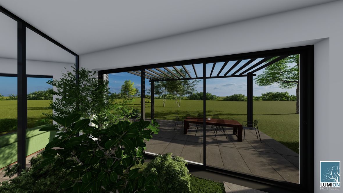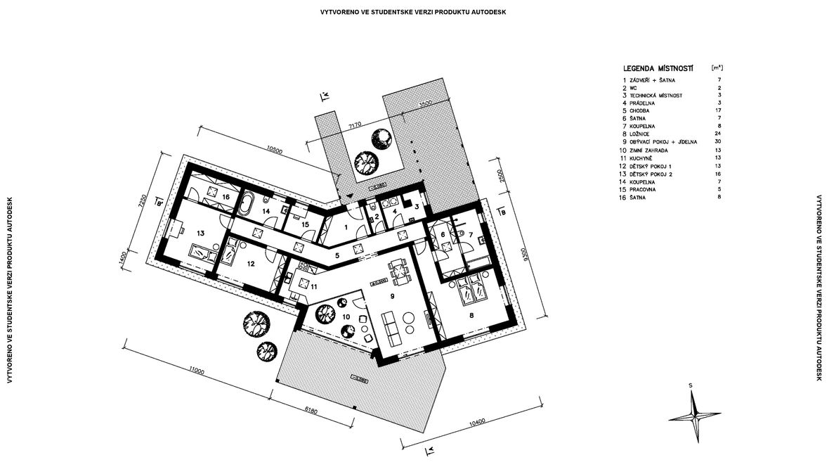 HLAVNÍ MYŠLENKA: Mým cílem bylo navrhnout rodinný dům s dostatkem přirozeného světla a maximálním propojením s okolním prostředím. Jako centrum dispozice hlavního obytného prostoru jsem zvolila prosklenou zimní zahradu, navazující na venkovní terasu. ARCHITEKTONICKÉ ŘEŠENÍ A DISPOZICE: Jedná se o jednopodlažní dům s plochou střechou, určený pro čtyřčlennou rodinu. Dominantou obytného prostoru je již zmíněná zimní zahrada, která odděluje posezení od kuchyňského koutu. Neobvyklé tvarové řešení kuchyně vzniklo díky nepravidelnému půdorysu. Všechny obytné místnosti směřují na jih. Obytný prostor směrem do zahrady rozšiřuje venkovní terasa, stíněná lehkou dřevěnou pergolou. Můžeme na ni vstoupit jak z obývacího pokoje, tak ze zimní zahrady. V severní, vstupní části je navrženo zastřešené parkovací stání se sloupky tvaru písmene V. KONSTRUKČNÍ A MATERIÁLOVÉ ŘEŠENÍ: Dům je navržen jako zděná stavba s plochou vegetační střechou. Kompozice jeho hmot je podtržena materiály fasády – obytné části jsou z pohledového betonu, vstupní část a zimní zahrada mají na fasádě hladkou bílou omítku. Materiály fasád kontrastují s dřevem terasy a pergoly.