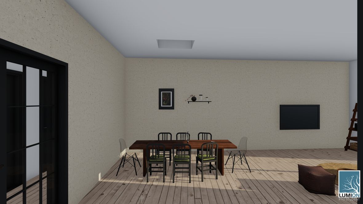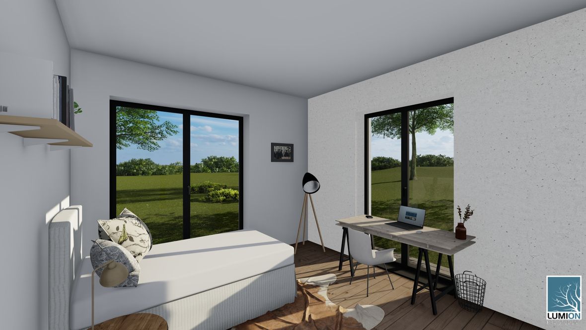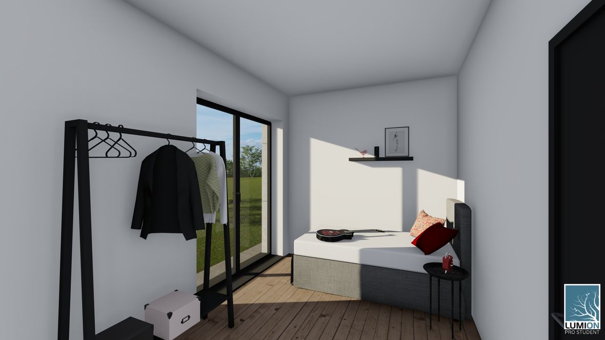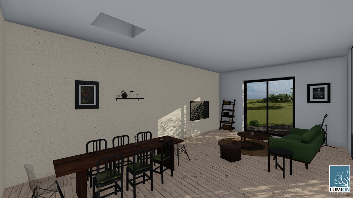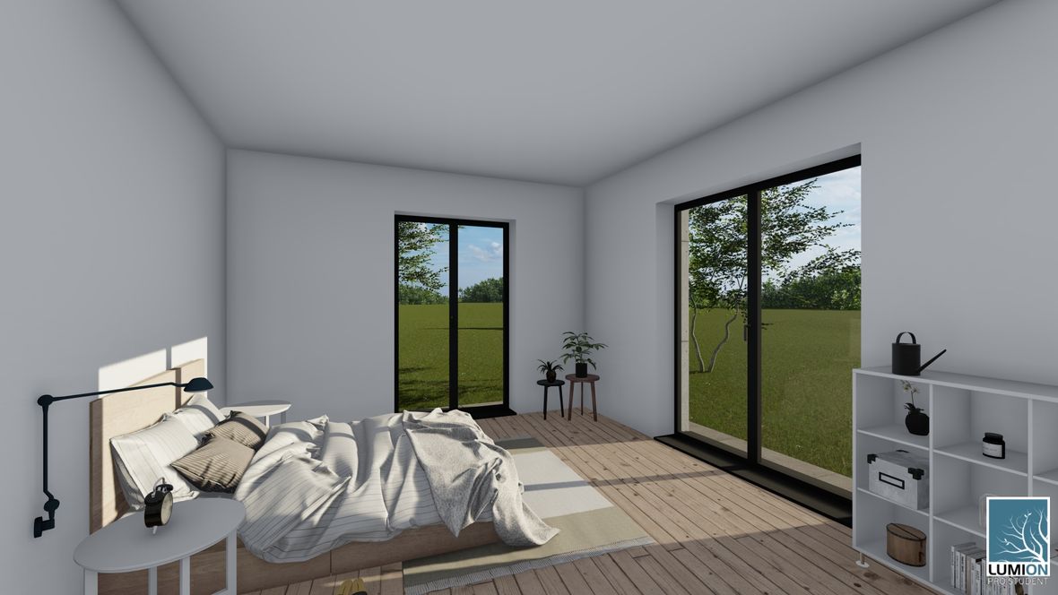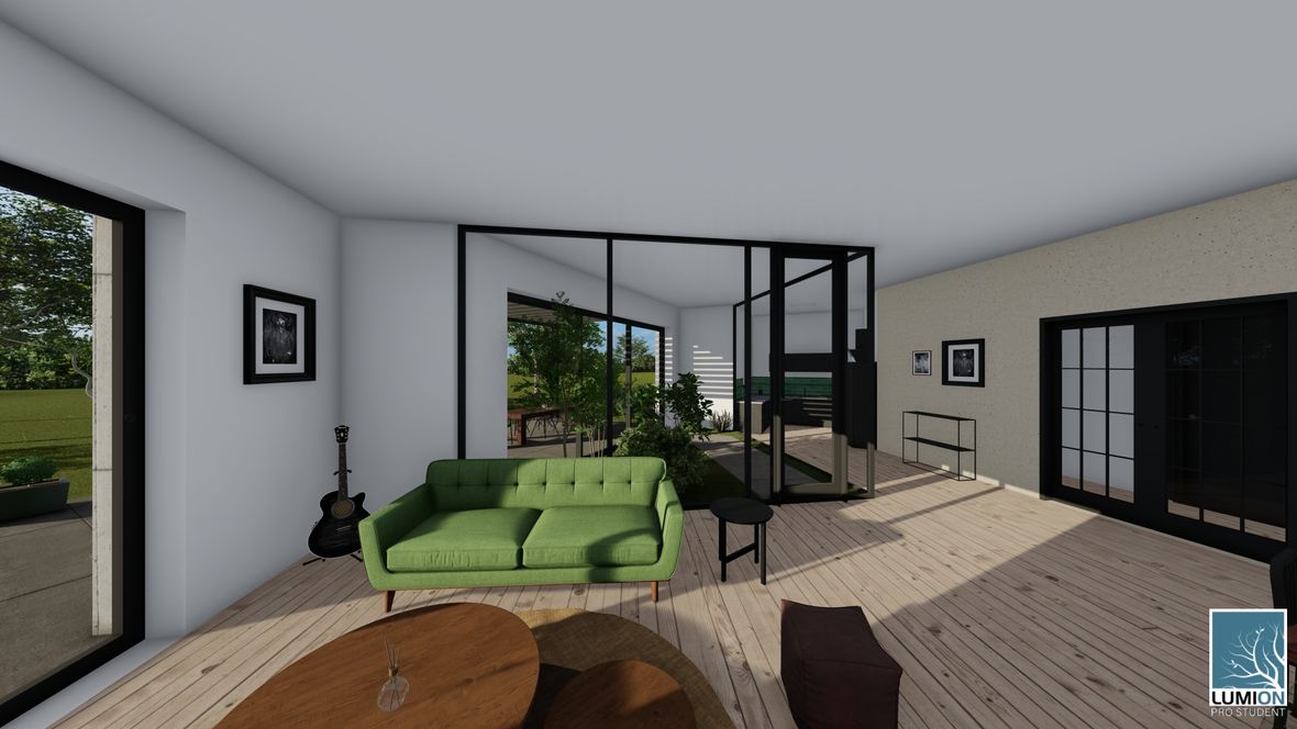HLAVNÍ MYŠLENKA: Mým cílem bylo navrhnout rodinný dům s dostatkem přirozeného světla a maximálním propojením s okolním prostředím. Jako centrum dispozice hlavního obytného prostoru jsem zvolila prosklenou zimní zahradu, navazující na venkovní terasu. ARCHITEKTONICKÉ ŘEŠENÍ A DISPOZICE: Jedná se o jednopodlažní dům s plochou střechou, určený pro čtyřčlennou rodinu. Dominantou obytného prostoru je již zmíněná zimní zahrada, která odděluje posezení od kuchyňského koutu. Neobvyklé tvarové řešení kuchyně vzniklo díky nepravidelnému půdorysu. Všechny obytné místnosti směřují na jih. Obytný prostor směrem do zahrady rozšiřuje venkovní terasa, stíněná lehkou dřevěnou pergolou. Můžeme na ni vstoupit jak z obývacího pokoje, tak ze zimní zahrady. V severní, vstupní části je navrženo zastřešené parkovací stání se sloupky tvaru písmene V. KONSTRUKČNÍ A MATERIÁLOVÉ ŘEŠENÍ: Dům je navržen jako zděná stavba s plochou vegetační střechou. Kompozice jeho hmot je podtržena materiály fasády – obytné části jsou z pohledového betonu, vstupní část a zimní zahrada mají na fasádě hladkou bílou omítku. Materiály fasád kontrastují s dřevem terasy a pergoly.