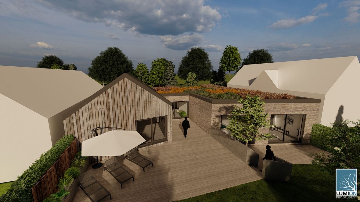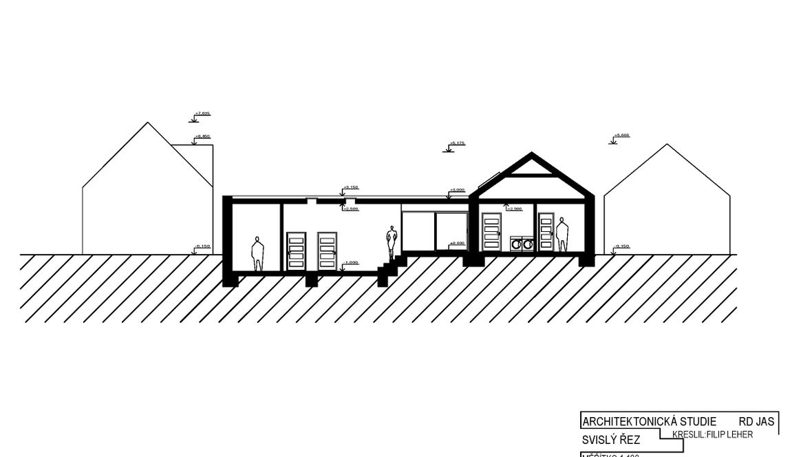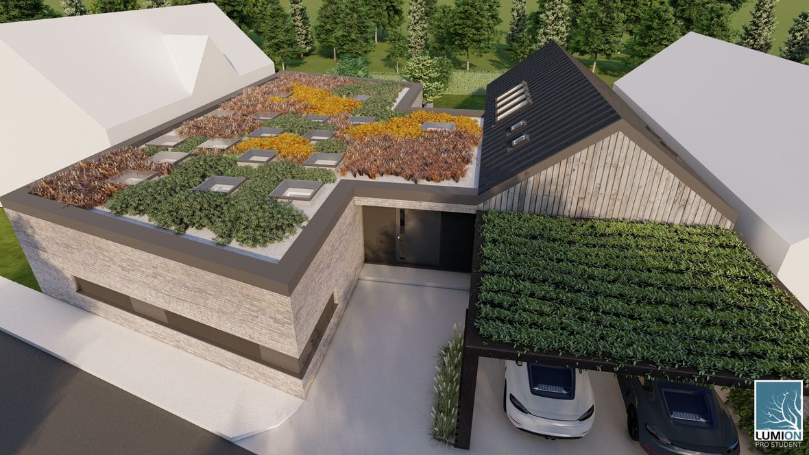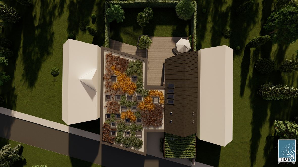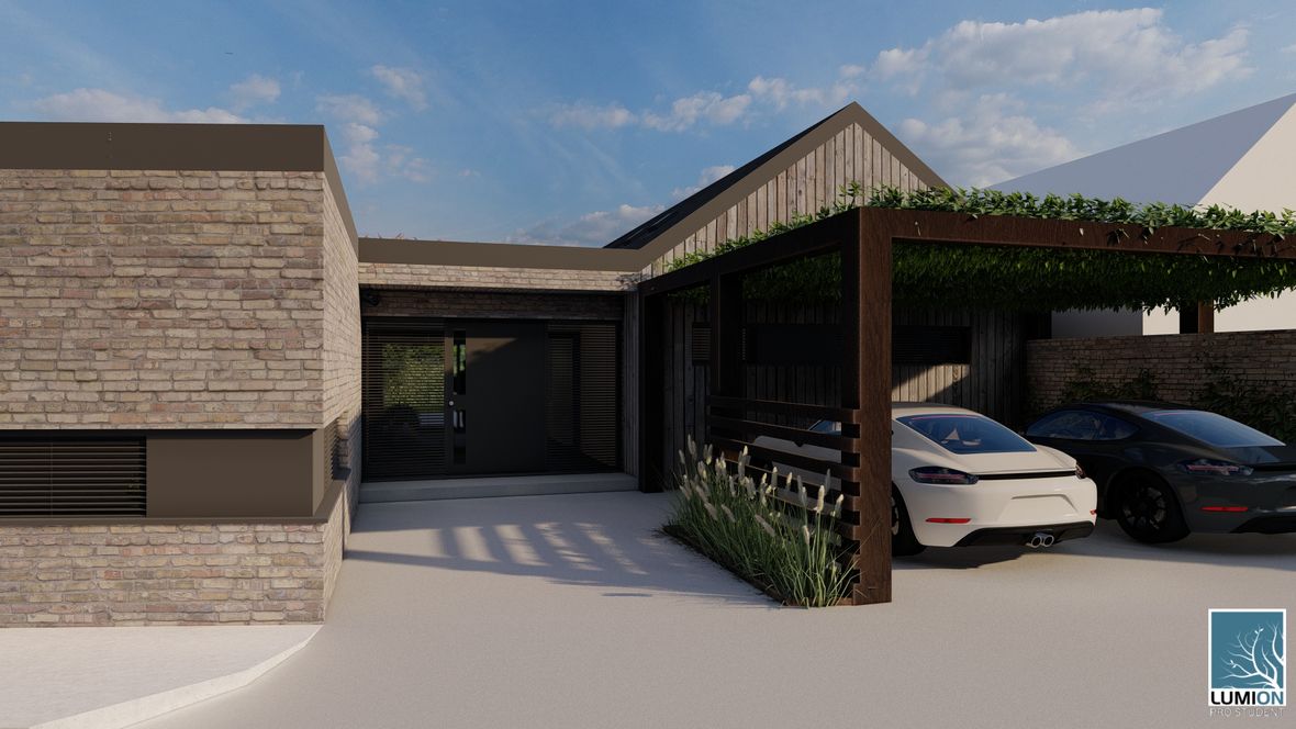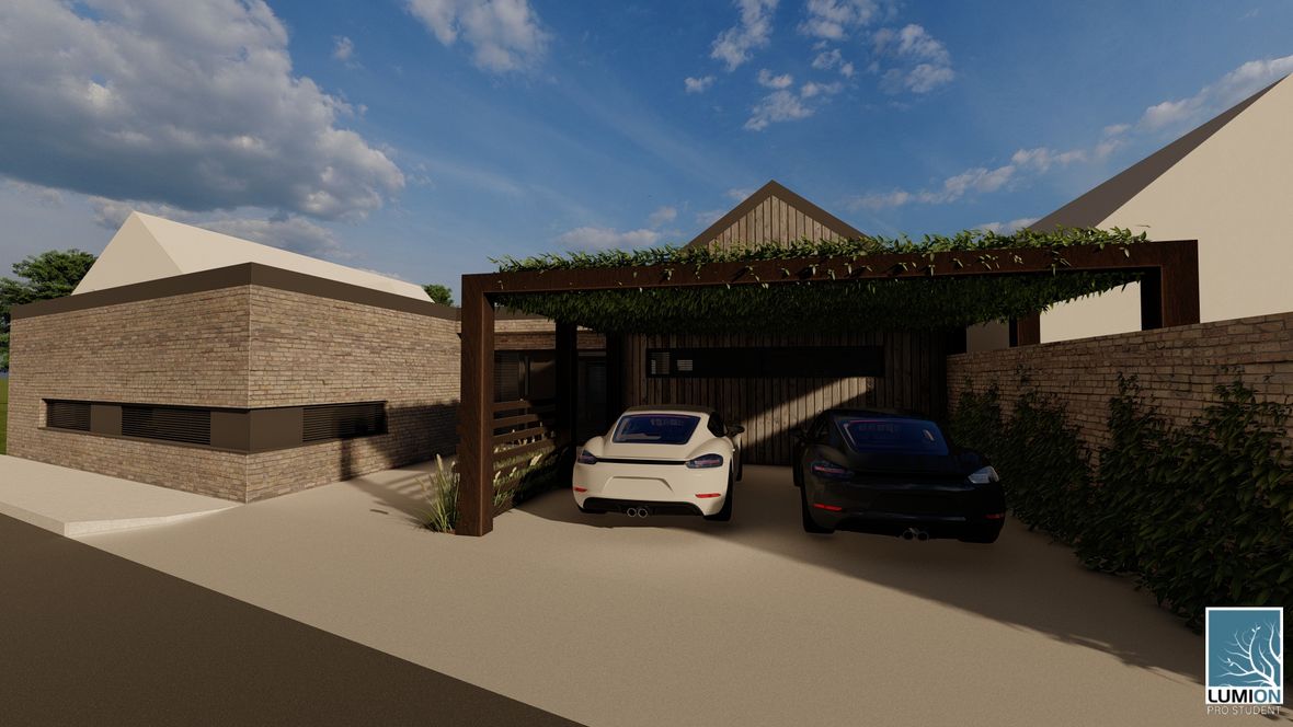 HLAVNÍ MYŠLENKA: Navrhovaný rodinný dům je situován do proluky v německé vesnici Quersa. Při návrhu jsem tak mohl využít k prosvětlením interiéru okny na fasádě jen stranu do ulice a do zahrady, čemuž jsem musel přizpůsobit také dispozici objektu. K prosvětlení problematických tmavých částí dispozice pak využívám výrobky fy VELUX. ARCHITEKTONICKÉ A DISPOZIČNÍ ŘEŠENÍ: Jednopodlažní objekt je rozdělen do dvou hmot v různých výškách s různým zastřešením, propojených přes prosklenou halu mezi nimi. Výškový rozdíl je vyrovnán malým schodištěm v nižší části. Jižní strany obou hmot jsou zkoseny tak, aby přes vysoká francouzská okna pronikalo do obytných místností co nejvíce přírodního světla. Na straně severní – vstupní - se nachází kryté stání pro dvě auta. Ve východní části domu s plochou vegetační střechou jsou umístěny dva pokoje s terasou, pracovna, ložnice, koupelna s WC a technická místnost s prostupem na střechu. V západní hmotě se sedlovou střechou jsou umístěny společenské místnosti - kuchyně, jídelna a obývací pokoj, které jsou prosvětleny francouzskými posuvnými okny s výstupem na terasu. Hladina denního světla v některých místech interiéru je zvýšena pomocí střešních oken. Nachází se zde také zázemí - spíž, koupelna, WC a malá průchozí technická místnost – světlo je zde přivedeno pomocí světlovodů. KONSTRUKČNÍ A MATERIÁLOVÉ ŘEŠENÍ:Z konstrukčního hlediska je objekt navržen jako zděná novostavba. Materiál fasády jsem zvolil v každé části jiný – kamenný v nižší a bezúdržbový dřevěný obklad v části zastřešené sedlovou střechou z falcovaného hliníku ve snaze přiblížit se materiálům okolních staveb. Prosvětlení napomáhají střešní světlíky VELUX CVU s plochým sklem na vegetační střeše a také střešní okna VELUX GLL 1064 a světlovody na střeše sedlové.