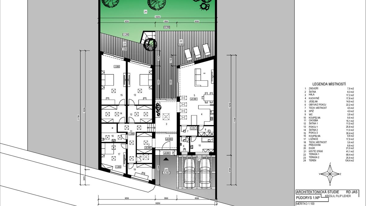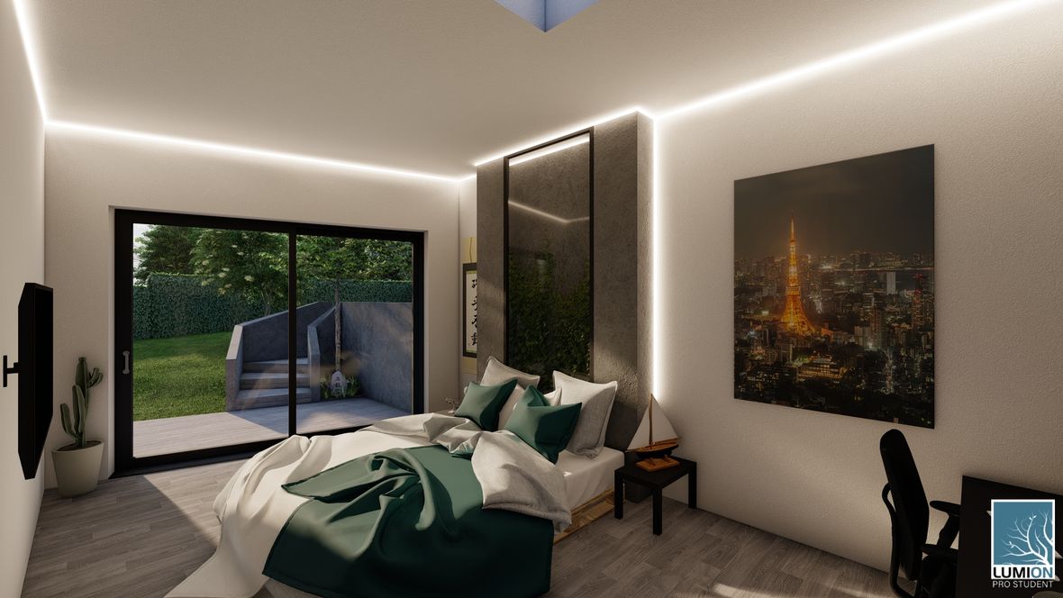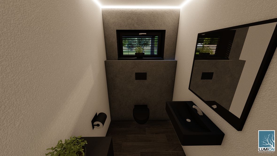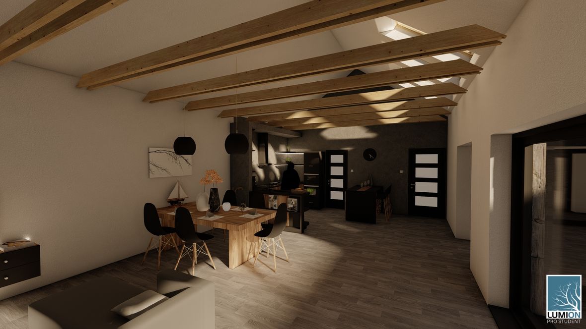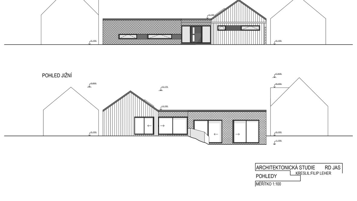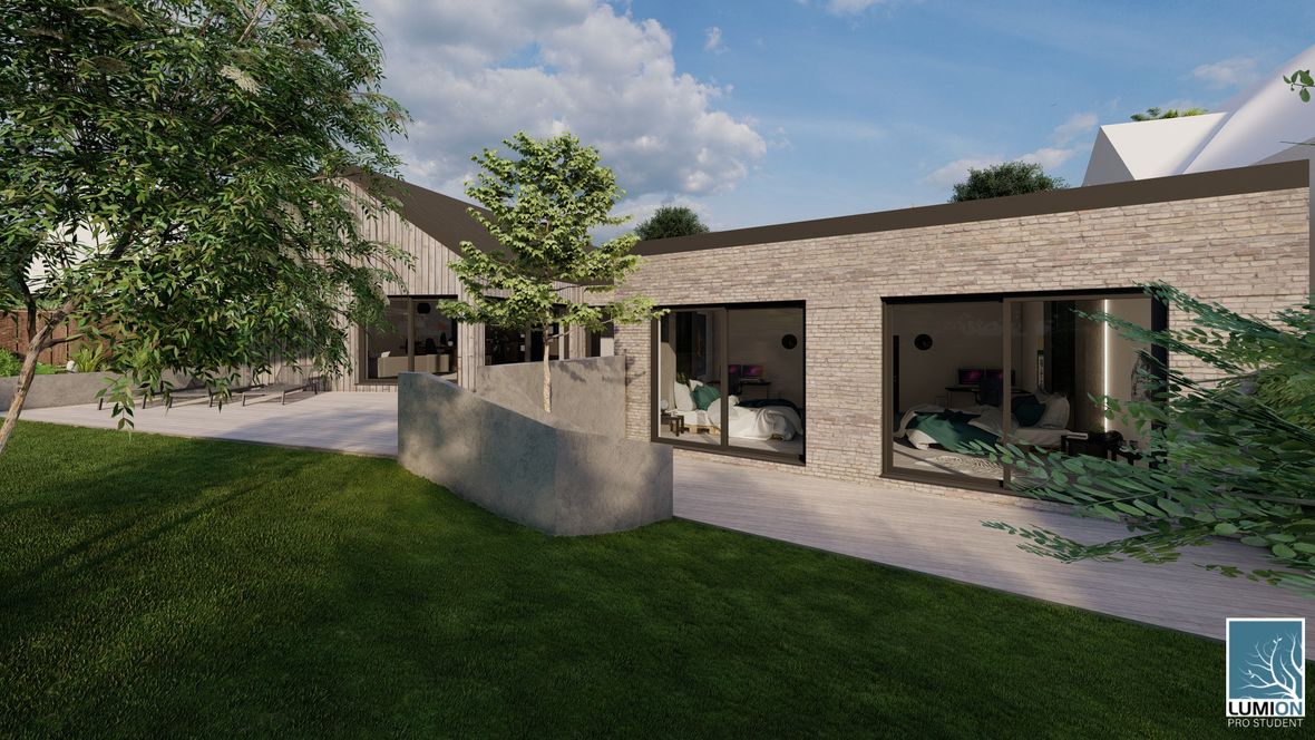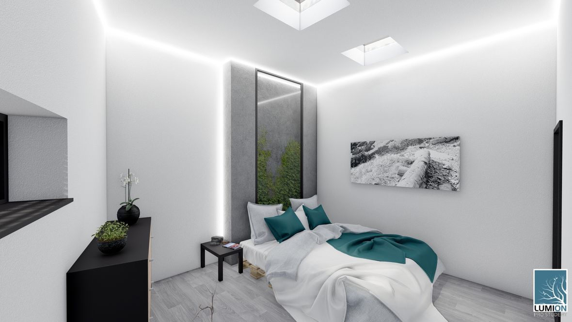 HLAVNÍ MYŠLENKA: Navrhovaný rodinný dům je situován do proluky v německé vesnici Quersa. Při návrhu jsem tak mohl využít k prosvětlením interiéru okny na fasádě jen stranu do ulice a do zahrady, čemuž jsem musel přizpůsobit také dispozici objektu. K prosvětlení problematických tmavých částí dispozice pak využívám výrobky fy VELUX. ARCHITEKTONICKÉ A DISPOZIČNÍ ŘEŠENÍ: Jednopodlažní objekt je rozdělen do dvou hmot v různých výškách s různým zastřešením, propojených přes prosklenou halu mezi nimi. Výškový rozdíl je vyrovnán malým schodištěm v nižší části. Jižní strany obou hmot jsou zkoseny tak, aby přes vysoká francouzská okna pronikalo do obytných místností co nejvíce přírodního světla. Na straně severní – vstupní - se nachází kryté stání pro dvě auta. Ve východní části domu s plochou vegetační střechou jsou umístěny dva pokoje s terasou, pracovna, ložnice, koupelna s WC a technická místnost s prostupem na střechu. V západní hmotě se sedlovou střechou jsou umístěny společenské místnosti - kuchyně, jídelna a obývací pokoj, které jsou prosvětleny francouzskými posuvnými okny s výstupem na terasu. Hladina denního světla v některých místech interiéru je zvýšena pomocí střešních oken. Nachází se zde také zázemí - spíž, koupelna, WC a malá průchozí technická místnost – světlo je zde přivedeno pomocí světlovodů. KONSTRUKČNÍ A MATERIÁLOVÉ ŘEŠENÍ:Z konstrukčního hlediska je objekt navržen jako zděná novostavba. Materiál fasády jsem zvolil v každé části jiný – kamenný v nižší a bezúdržbový dřevěný obklad v části zastřešené sedlovou střechou z falcovaného hliníku ve snaze přiblížit se materiálům okolních staveb. Prosvětlení napomáhají střešní světlíky VELUX CVU s plochým sklem na vegetační střeše a také střešní okna VELUX GLL 1064 a světlovody na střeše sedlové.