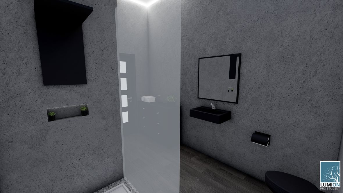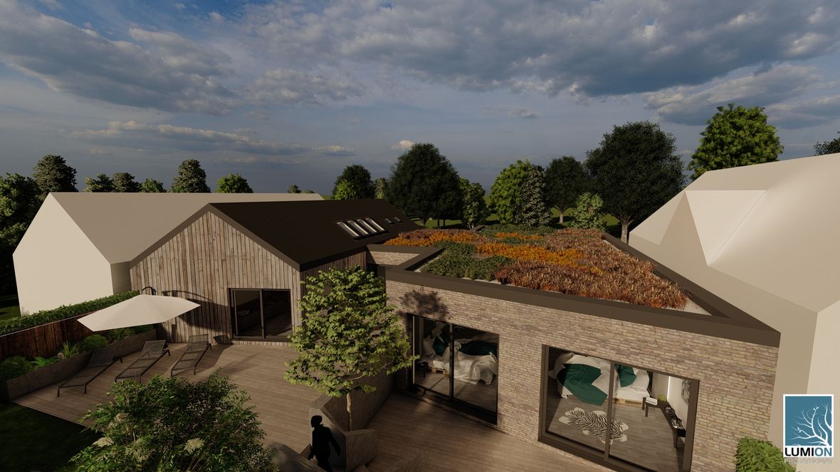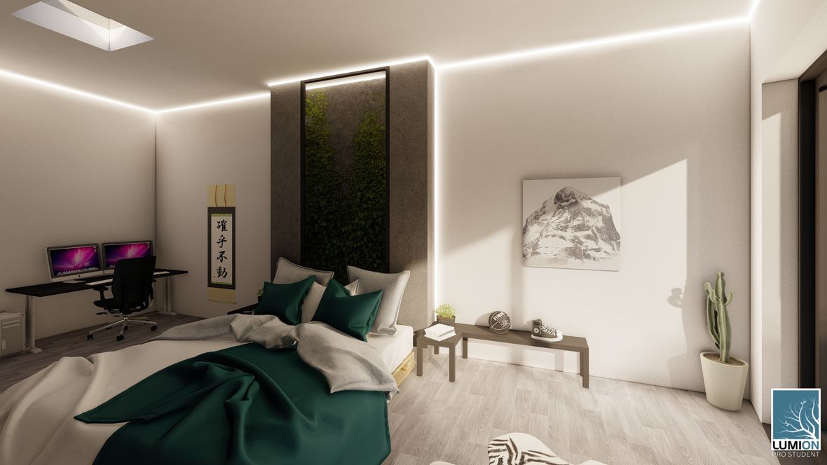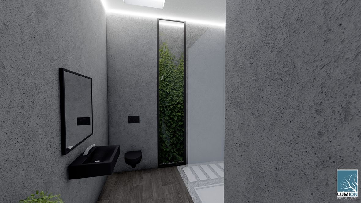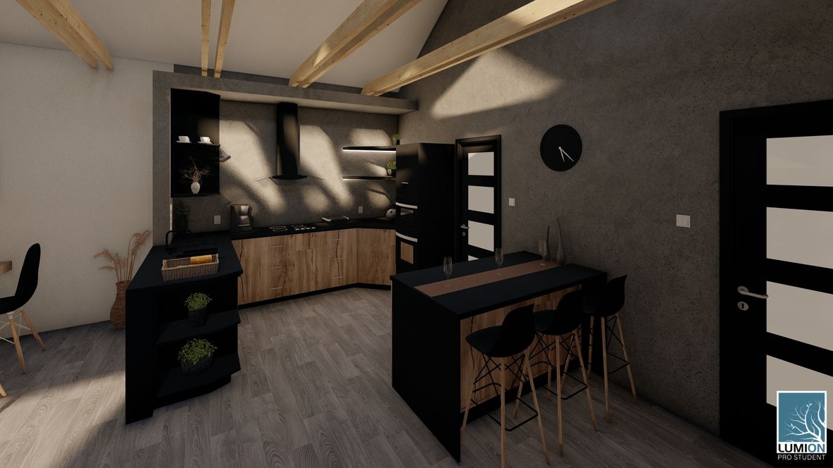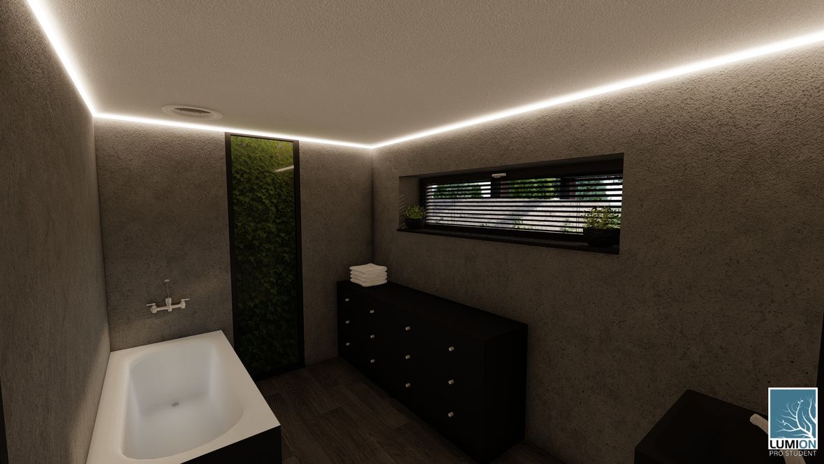HLAVNÍ MYŠLENKA: Navrhovaný rodinný dům je situován do proluky v německé vesnici Quersa. Při návrhu jsem tak mohl využít k prosvětlením interiéru okny na fasádě jen stranu do ulice a do zahrady, čemuž jsem musel přizpůsobit také dispozici objektu. K prosvětlení problematických tmavých částí dispozice pak využívám výrobky fy VELUX. ARCHITEKTONICKÉ A DISPOZIČNÍ ŘEŠENÍ: Jednopodlažní objekt je rozdělen do dvou hmot v různých výškách s různým zastřešením, propojených přes prosklenou halu mezi nimi. Výškový rozdíl je vyrovnán malým schodištěm v nižší části. Jižní strany obou hmot jsou zkoseny tak, aby přes vysoká francouzská okna pronikalo do obytných místností co nejvíce přírodního světla. Na straně severní – vstupní - se nachází kryté stání pro dvě auta. Ve východní části domu s plochou vegetační střechou jsou umístěny dva pokoje s terasou, pracovna, ložnice, koupelna s WC a technická místnost s prostupem na střechu. V západní hmotě se sedlovou střechou jsou umístěny společenské místnosti - kuchyně, jídelna a obývací pokoj, které jsou prosvětleny francouzskými posuvnými okny s výstupem na terasu. Hladina denního světla v některých místech interiéru je zvýšena pomocí střešních oken. Nachází se zde také zázemí - spíž, koupelna, WC a malá průchozí technická místnost – světlo je zde přivedeno pomocí světlovodů. KONSTRUKČNÍ A MATERIÁLOVÉ ŘEŠENÍ:Z konstrukčního hlediska je objekt navržen jako zděná novostavba. Materiál fasády jsem zvolil v každé části jiný – kamenný v nižší a bezúdržbový dřevěný obklad v části zastřešené sedlovou střechou z falcovaného hliníku ve snaze přiblížit se materiálům okolních staveb. Prosvětlení napomáhají střešní světlíky VELUX CVU s plochým sklem na vegetační střeše a také střešní okna VELUX GLL 1064 a světlovody na střeše sedlové.