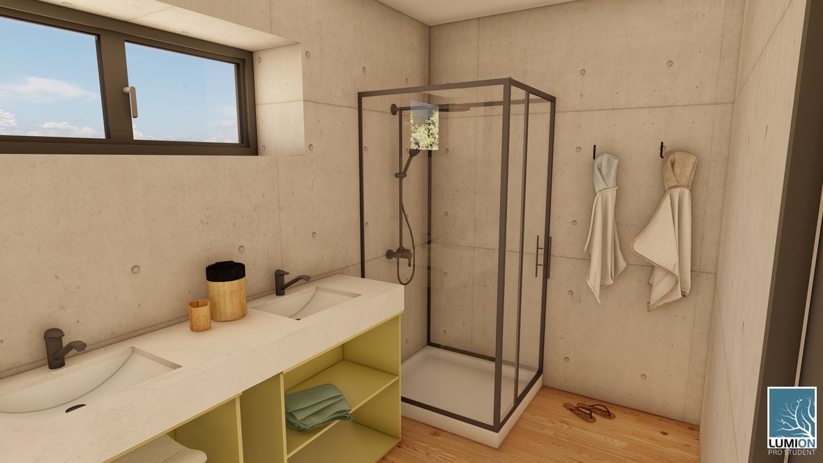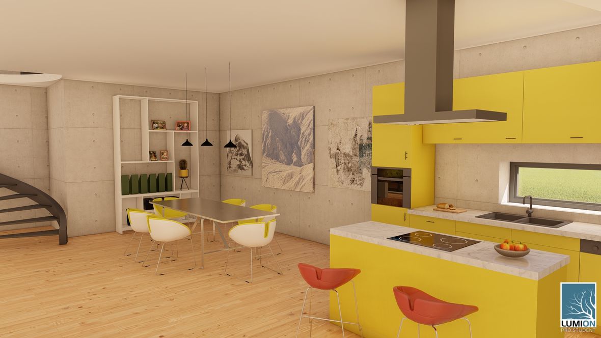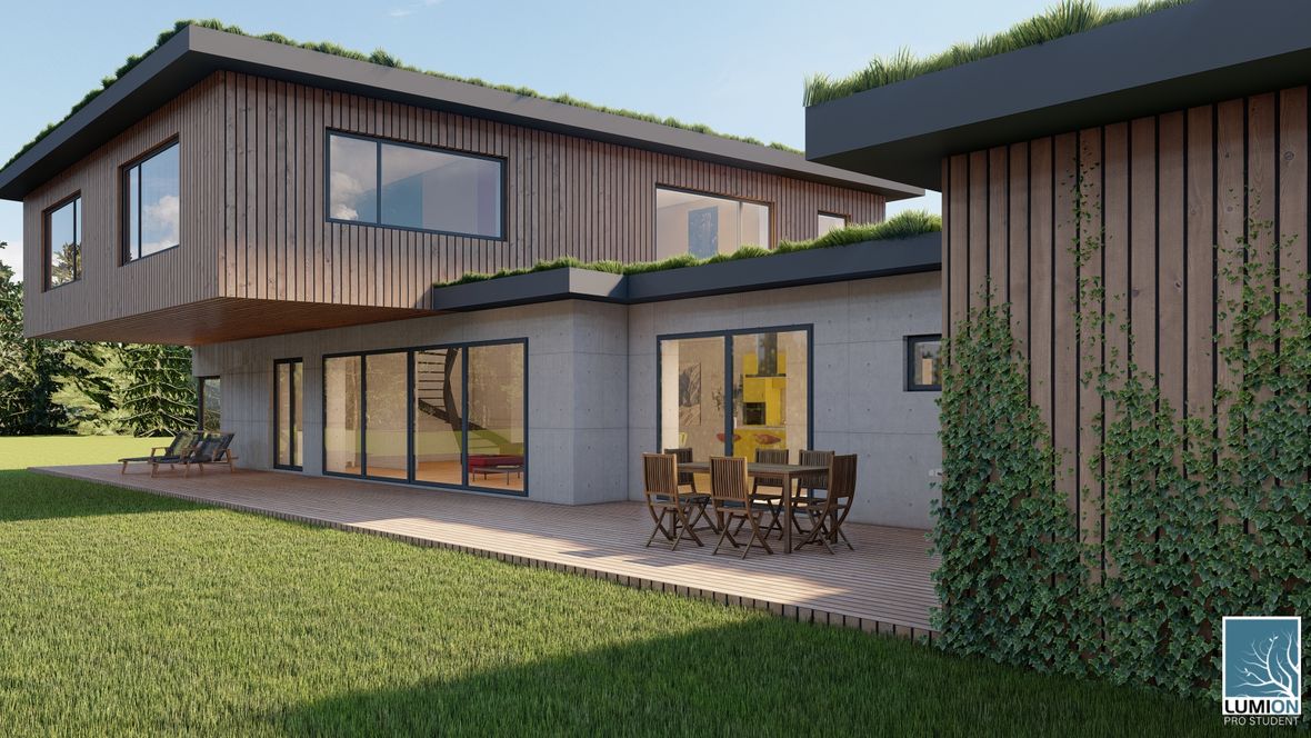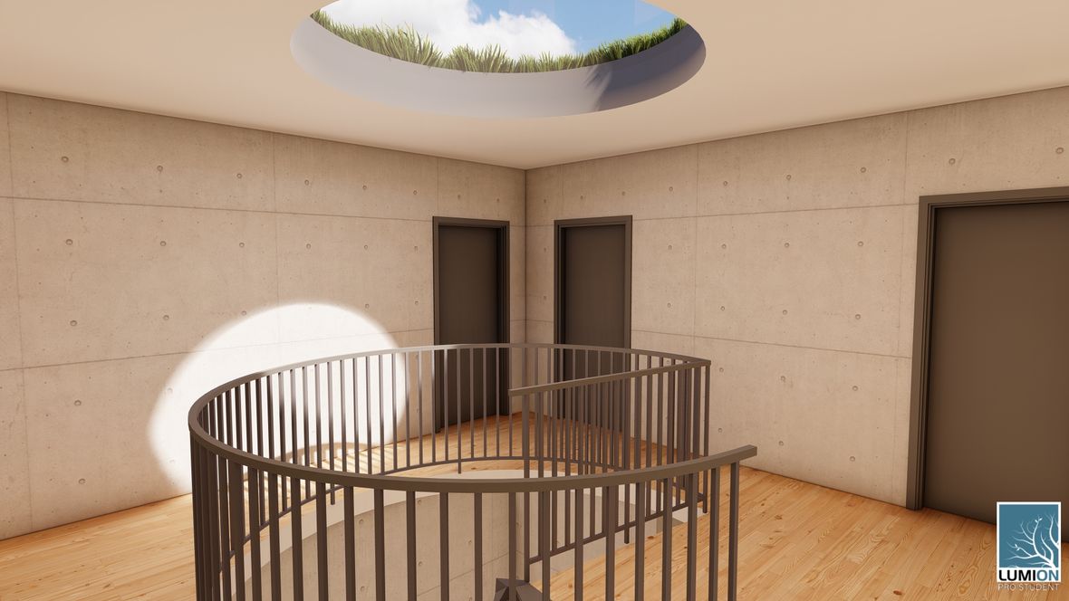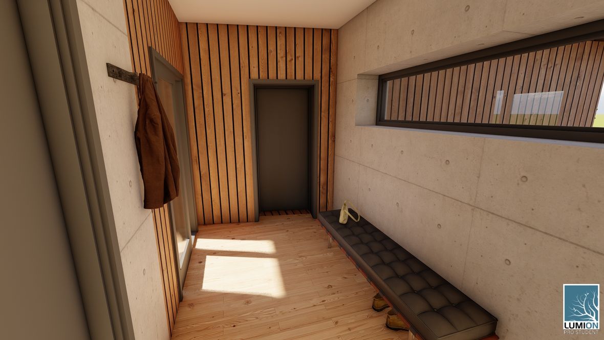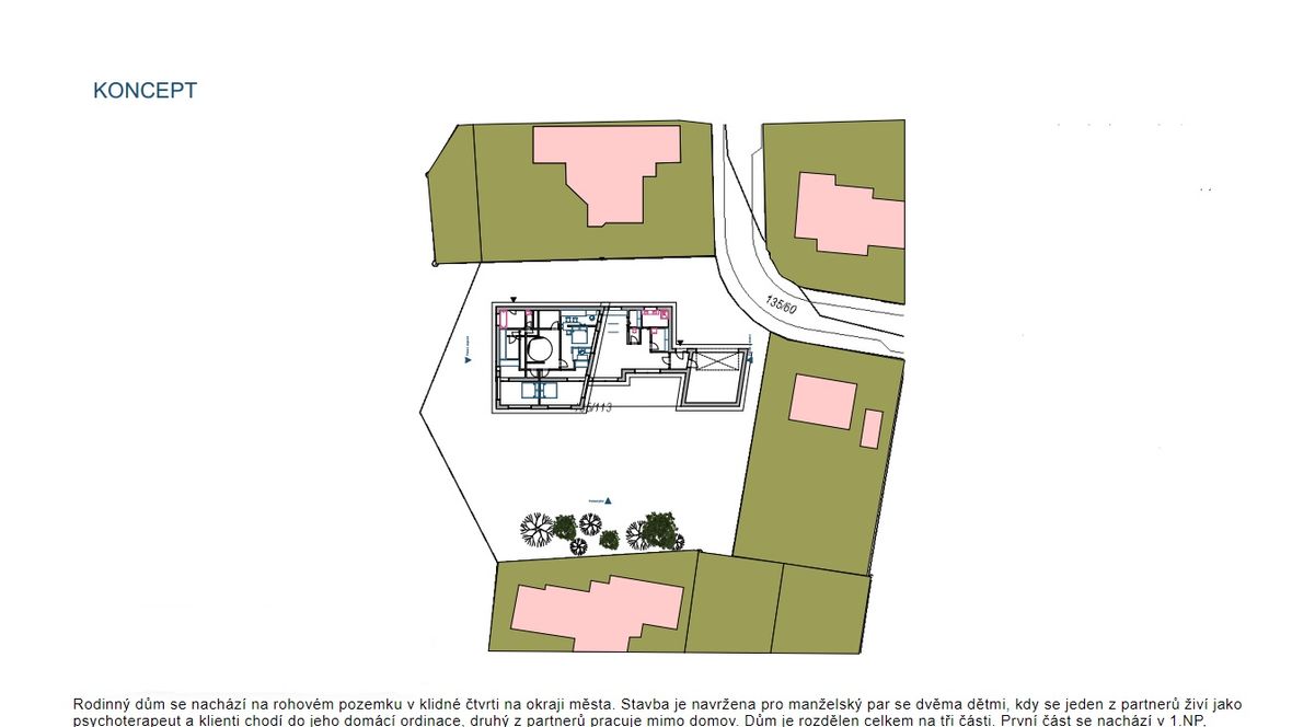 Rodinný dům se nachází na rohovém pozemku v klidné čtvrti na okraji města. Stavba je navržena pro manželský pár se dvěma dětmi, kdy se jeden z partnerů živí jako psychoterapeut a klienti chodí do jeho domácí ordinace, druhý z partnerů pracuje mimo domov. Dům je rozdělen celkem na tři části. První část se nachází v 1.NP, zahrnuje vstup do domu a frekventovanější místnosti (kuchyň, obývací pokoj, jídelna, toaleta, koupelna). Druhá část se nachází také v 1.NP, ale je navržen jako samostatně fungující jednotka s vlastním vstupem určená pro ordinaci jednoho z partnerů, od části obytné ji odděluje schodišťový prostor. Třetí část se nachází ve 2.NP, tato část by měla být klidová, jsou v ní navrženy dětské pokoje, ložnice, šatna a koupelna. Celý dům hodně pracuje se slunečním světlem, je navržen tak, aby obytná část pojímala velké procento slunečního svitu z jihu, a část klidová byla od jižního slunce spíše odstíněna a nedocházelo tak k velkému přehřívání klidových místností. Klidová část je naopak situována na východ kvůli příjemnému oslunění v ranních hodinách. Část pracovní je spíše neutrální a dostává se jí světla jak z jihu, tak ale také ze západu. Dominantním světelným prvkem v domě je využití světlíků. V domě jsou použity celkem tři, a to k prosvětlení malé chodby mezi koupelnou, WC a šatnou v 1.NP, dále v šatně ve 2.NP a poslední nad točitým schodištěm, které přináší světlo do obou nadzemních podlaží a tvoří dominantní světelný prvek interiéru, ale také hranici mezi pracovní a obytnou plochou domu.