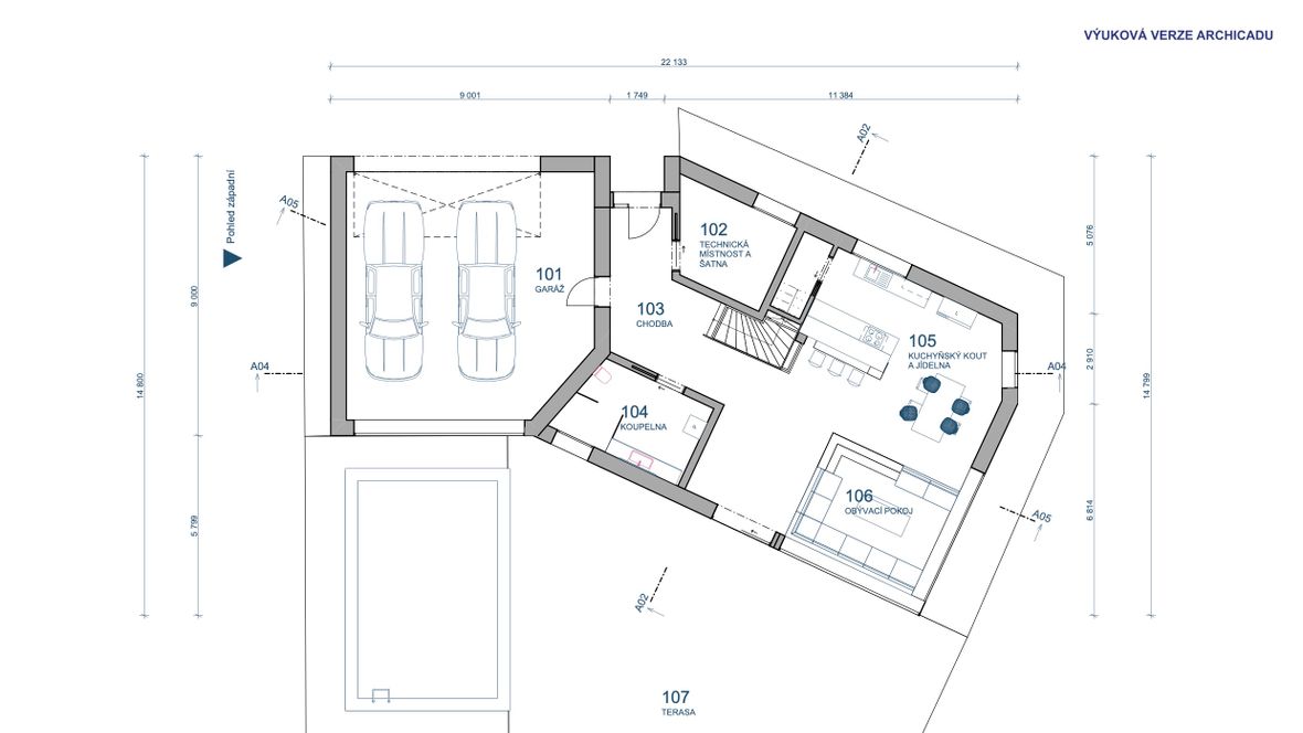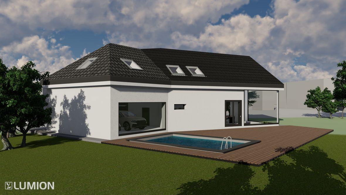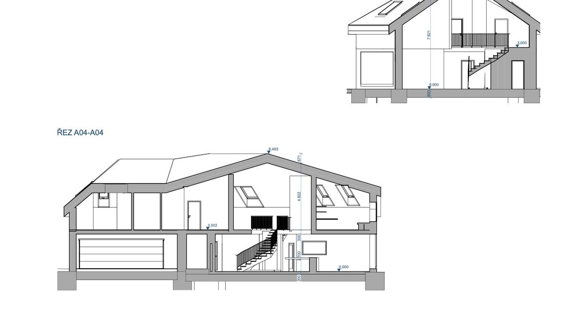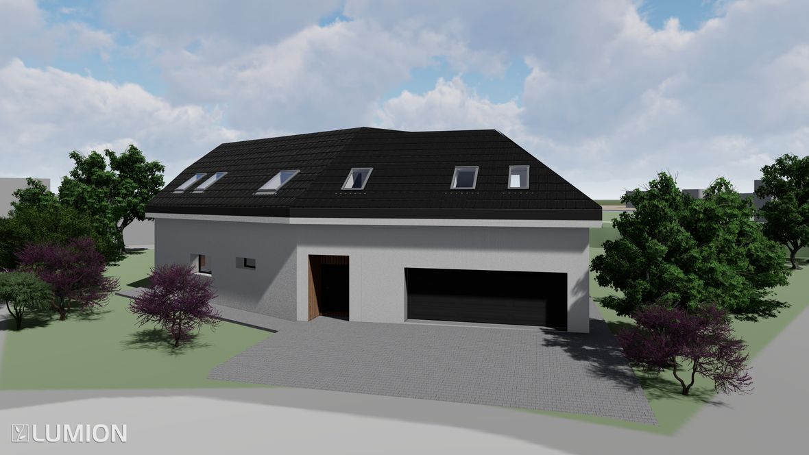 Jedná se o dvoupodlažní nepodsklepenou stavbu. Půdorys kopíruje pozemek, který je ve tvaru šestiúhelníku. Stavba slouží jako domov pro 3 člennou rodinu. Vchod je umístěn na severovýchod. Rodiče převážně pracují z domu, proto je budova vybavena prostornou kanceláří. Koníčkem obou rodičů jsou auta a marketingové meetingy. V garáži se tedy objevuje obrovská vitrína, která umožňuje každodenní výhled na auta ze zahrady. Součástí ložnice rodičů je prostorná šatna, ve které je dostatek místa pro oblečení obou podnikatelů. Dospívající dítě má zálibu ve cvičení, proto jsem před jeho pokoj umístila posilovnu. Celý dům je prosvětlen sluncem od rána do večera, díky oknům směřovaným na jihozápad a jihovýchod. I když se jedná o velké prosklené části, dům stále zajišťuje soukromí díky zeleni. Součástí zahrady je výhled na údolí, kterým protéká řeka Jihlava. Pozemek poskytuje spoustu prostoru pro denní pohodlí.