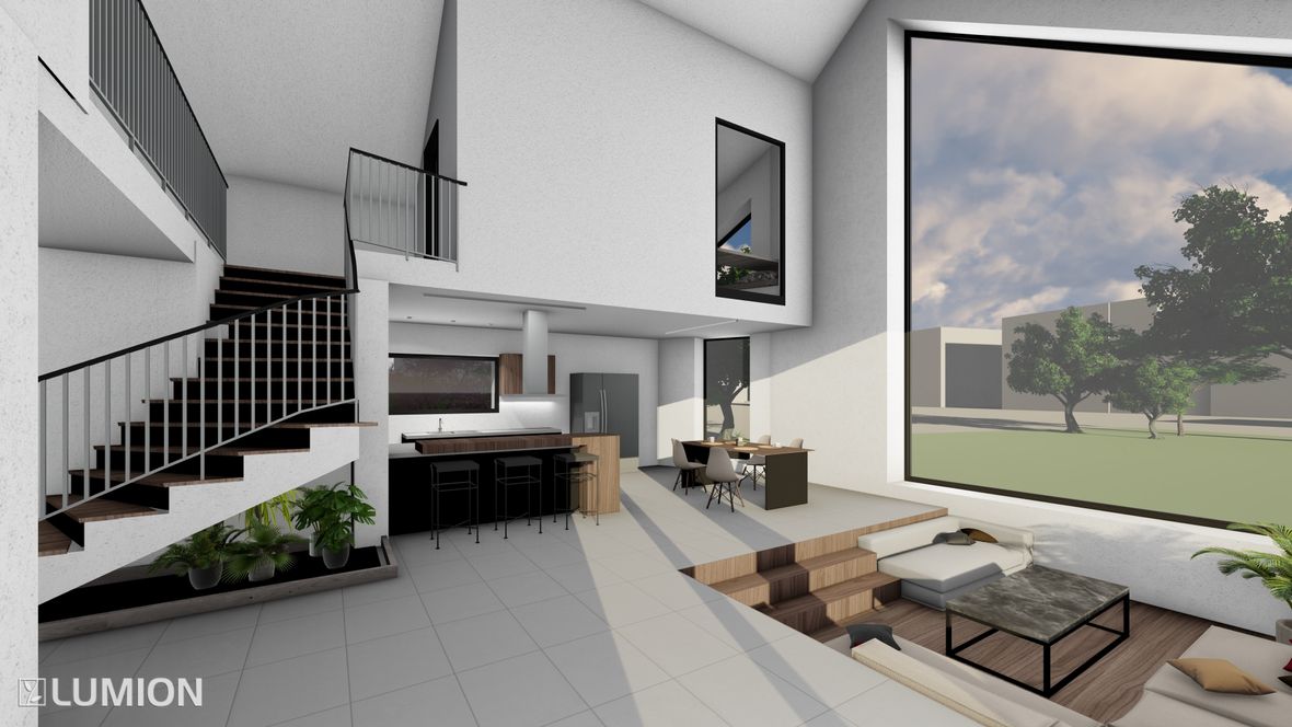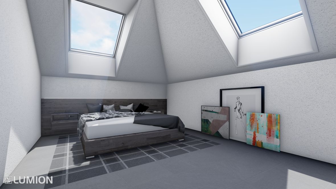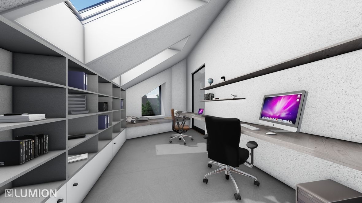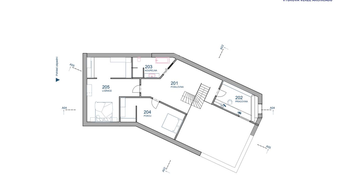 Jedná se o dvoupodlažní nepodsklepenou stavbu. Půdorys kopíruje pozemek, který je ve tvaru šestiúhelníku. Stavba slouží jako domov pro 3 člennou rodinu. Vchod je umístěn na severovýchod. Rodiče převážně pracují z domu, proto je budova vybavena prostornou kanceláří. Koníčkem obou rodičů jsou auta a marketingové meetingy. V garáži se tedy objevuje obrovská vitrína, která umožňuje každodenní výhled na auta ze zahrady. Součástí ložnice rodičů je prostorná šatna, ve které je dostatek místa pro oblečení obou podnikatelů. Dospívající dítě má zálibu ve cvičení, proto jsem před jeho pokoj umístila posilovnu. Celý dům je prosvětlen sluncem od rána do večera, díky oknům směřovaným na jihozápad a jihovýchod. I když se jedná o velké prosklené části, dům stále zajišťuje soukromí díky zeleni. Součástí zahrady je výhled na údolí, kterým protéká řeka Jihlava. Pozemek poskytuje spoustu prostoru pro denní pohodlí.