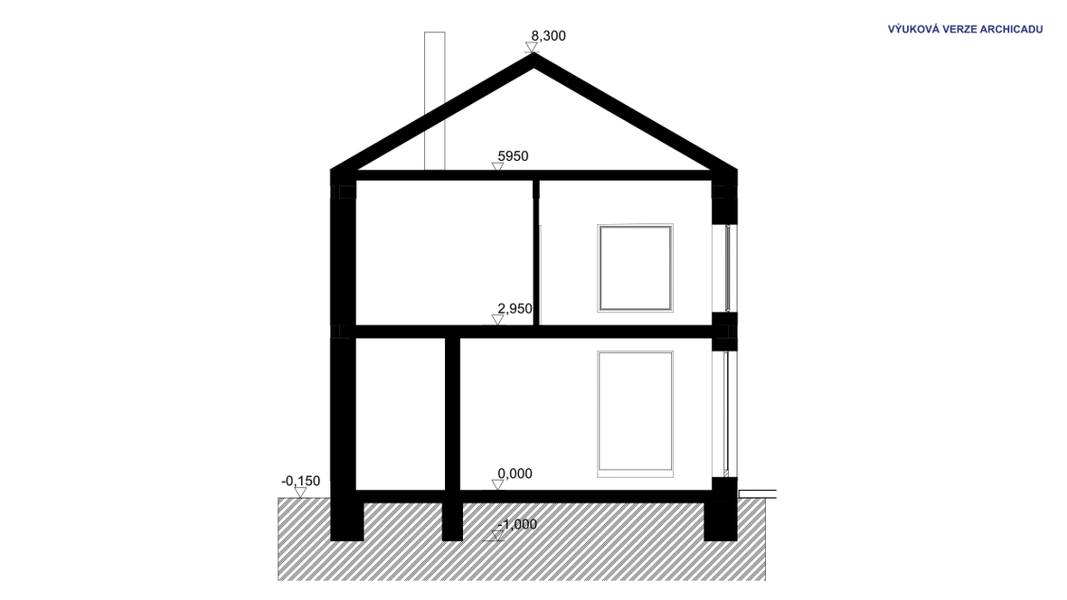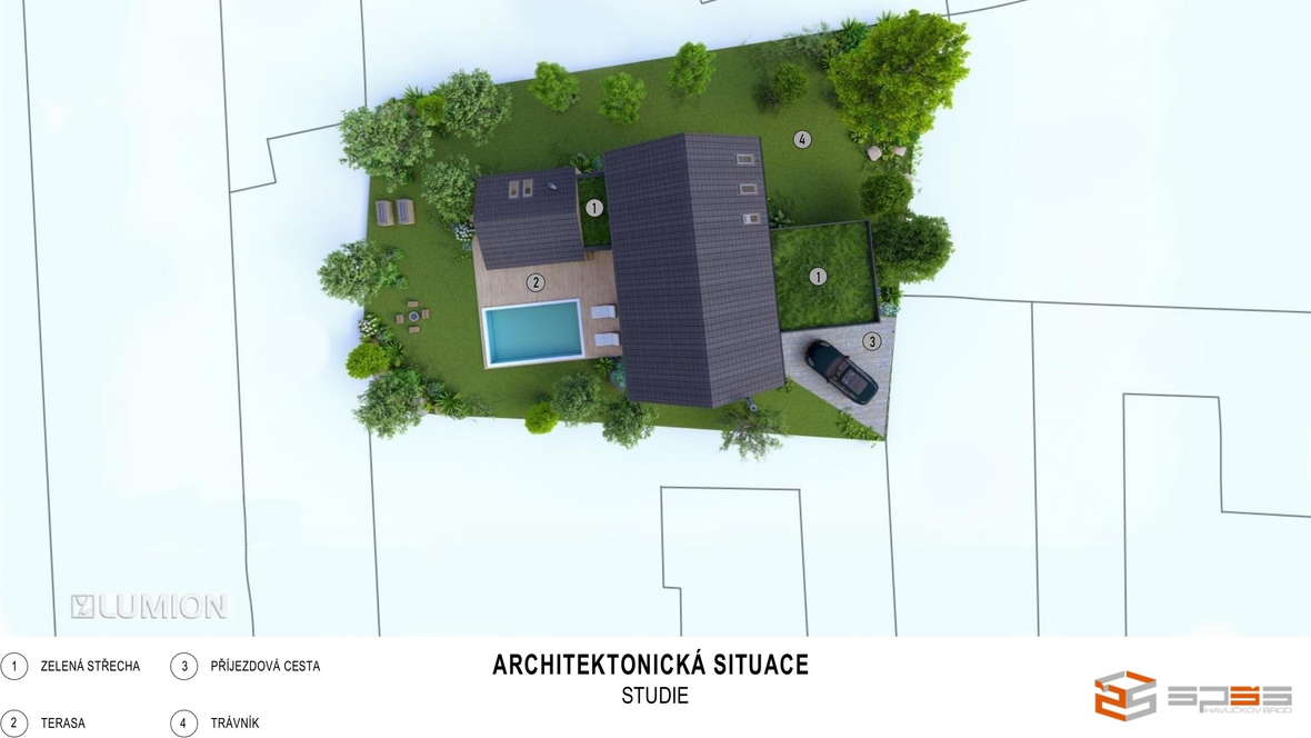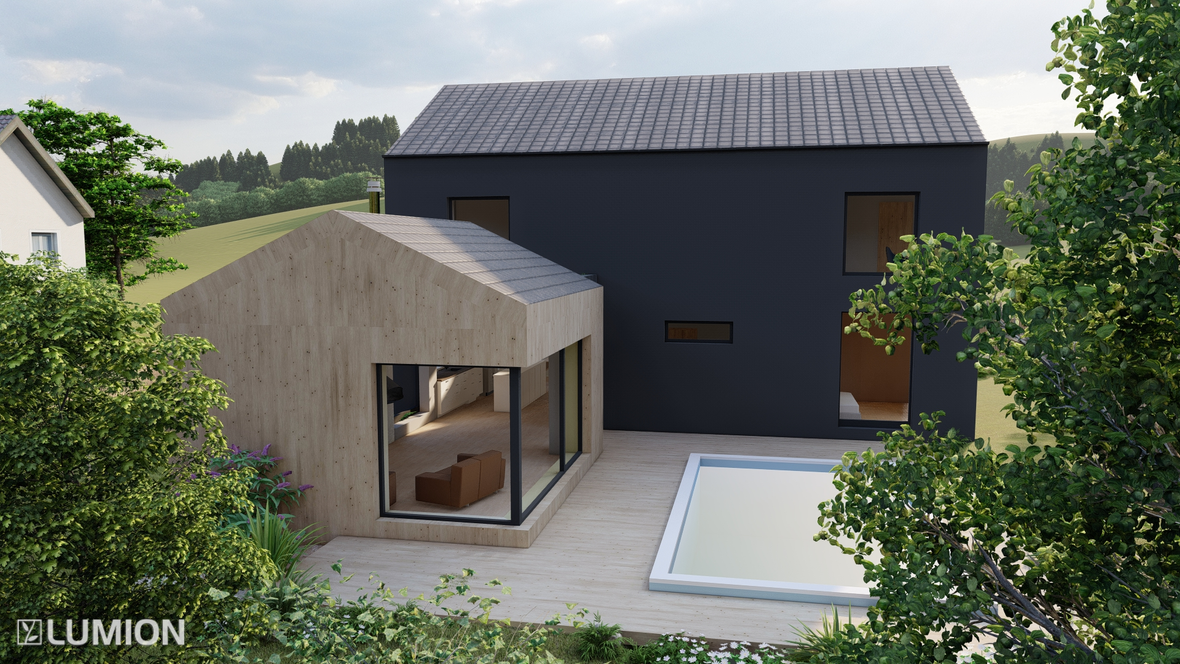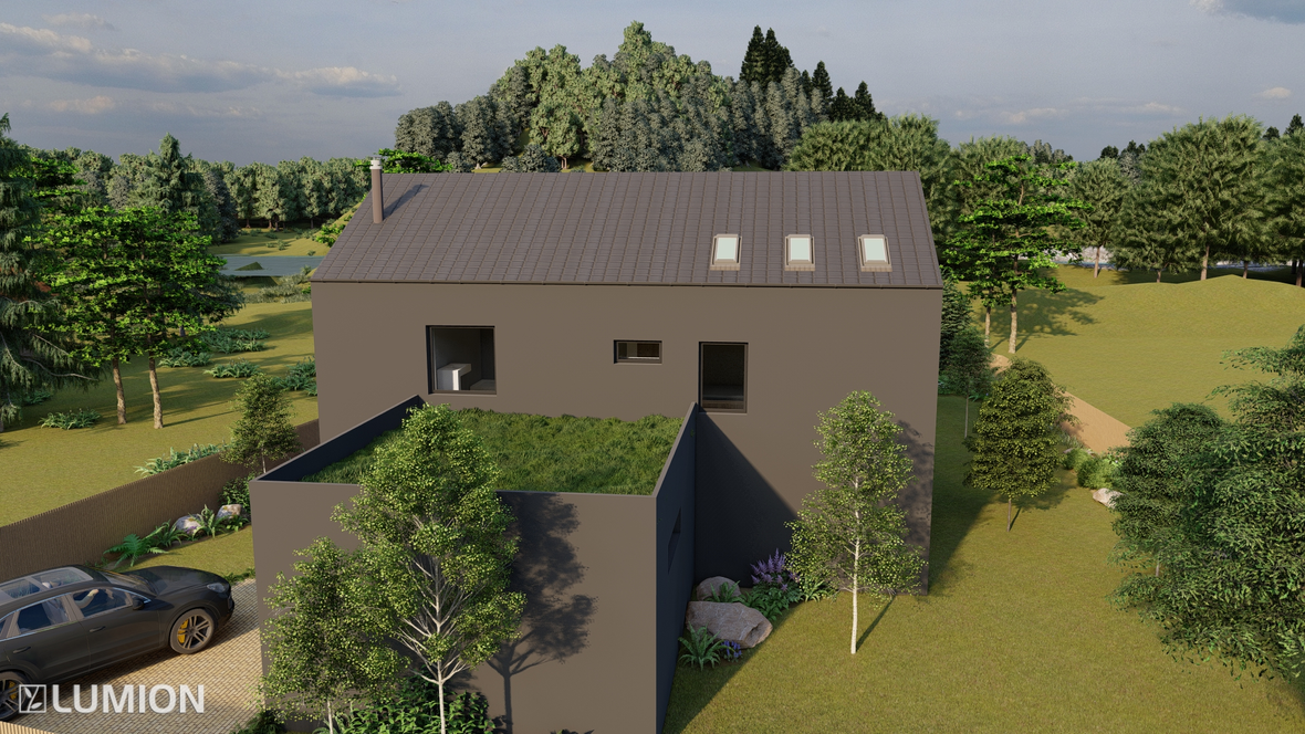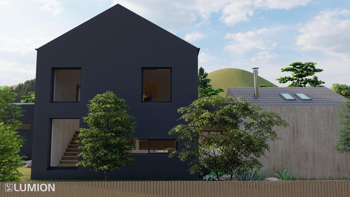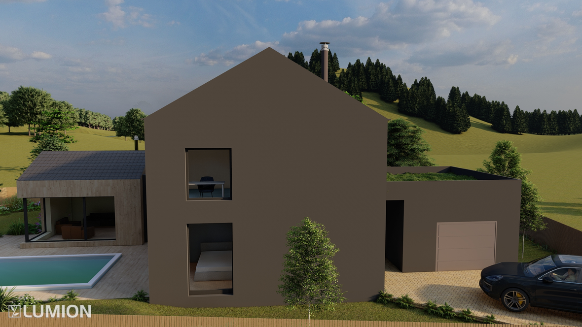 Hlavní myšlenka Moje myšlenka, byla vytvořit návrh rodinného domu, který bude prosvětlený a bude působit otevřeným a prostorným dojmem. Snažila jsem se také dům co nejvíce propojit s přírodou a okolím. Architektonické řešení Jedná se o dvoupodlažní rodinný dům, který je navržen z keramických tvárnic Porotherm. Dominantou domu je propojená kuchyň s jídlem a obývacím pokojem. V obývacím pokoji jsou prostorná francouzská okna a také střešní okna VELUX, která jsem použila i v chodbě, kde slouží k prosvětlení schodiště a galerie. Na dům jsem navrhla sedlové a zelené střechy. Fasáda je černé barvy s kombinací dřevěného obkladu.