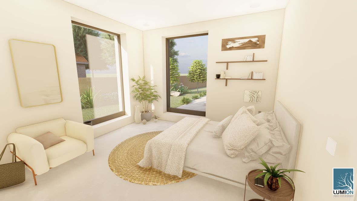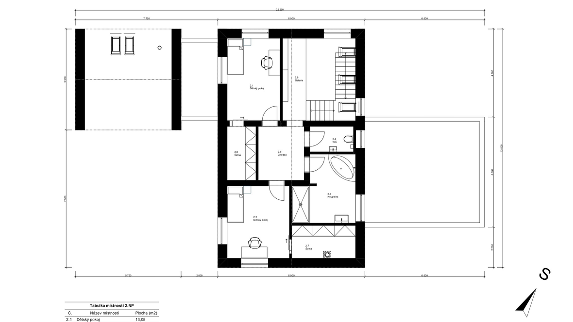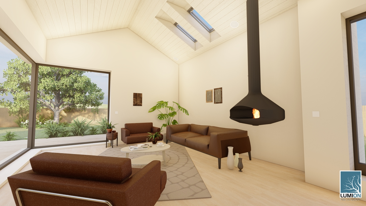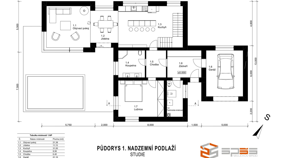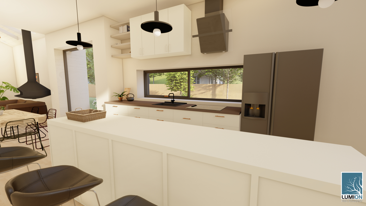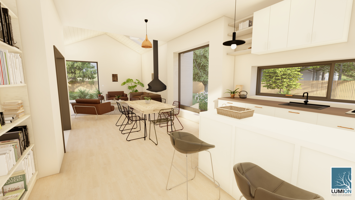 Hlavní myšlenka Moje myšlenka, byla vytvořit návrh rodinného domu, který bude prosvětlený a bude působit otevřeným a prostorným dojmem. Snažila jsem se také dům co nejvíce propojit s přírodou a okolím. Architektonické řešení Jedná se o dvoupodlažní rodinný dům, který je navržen z keramických tvárnic Porotherm. Dominantou domu je propojená kuchyň s jídlem a obývacím pokojem. V obývacím pokoji jsou prostorná francouzská okna a také střešní okna VELUX, která jsem použila i v chodbě, kde slouží k prosvětlení schodiště a galerie. Na dům jsem navrhla sedlové a zelené střechy. Fasáda je černé barvy s kombinací dřevěného obkladu.