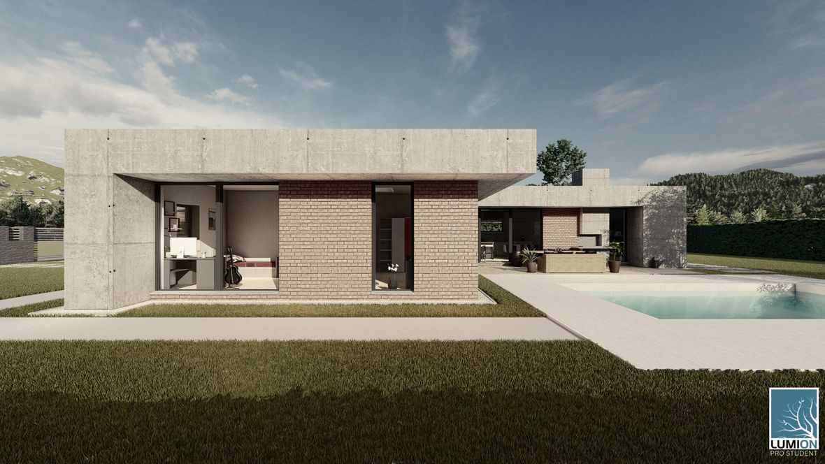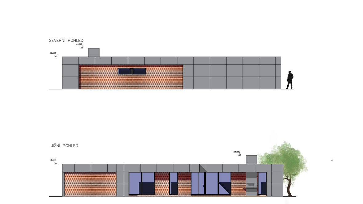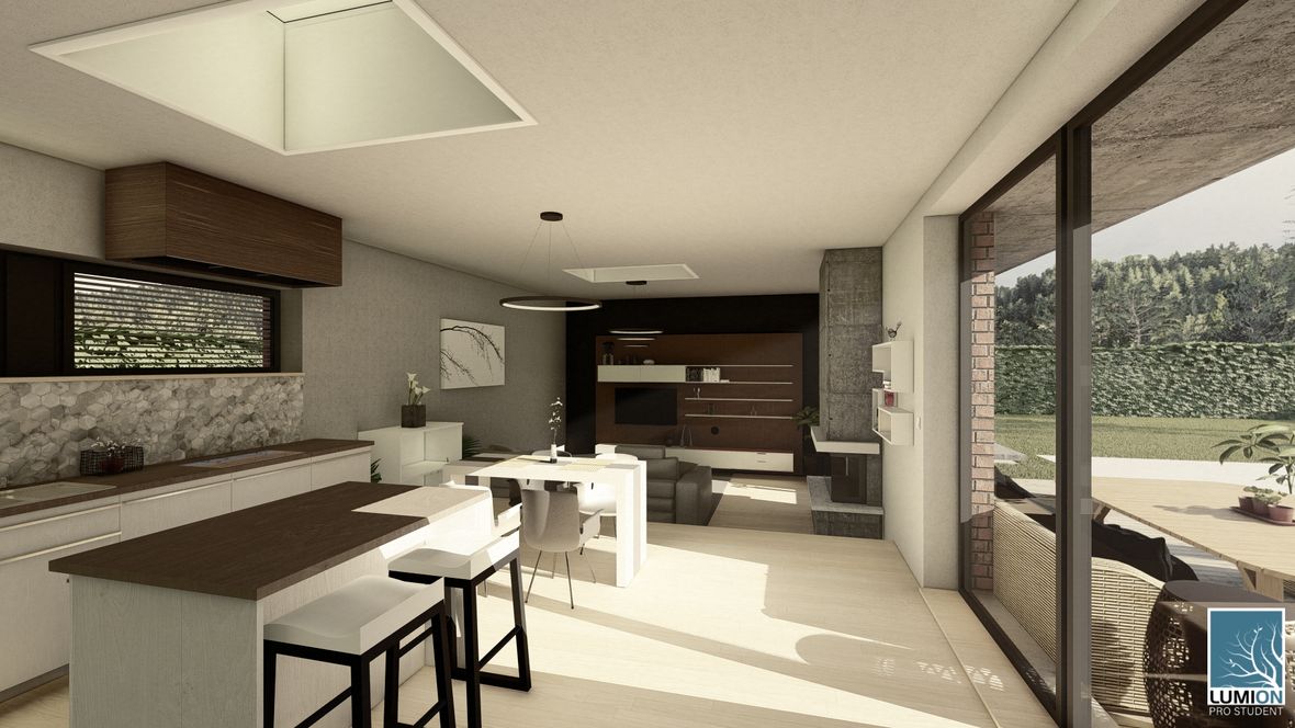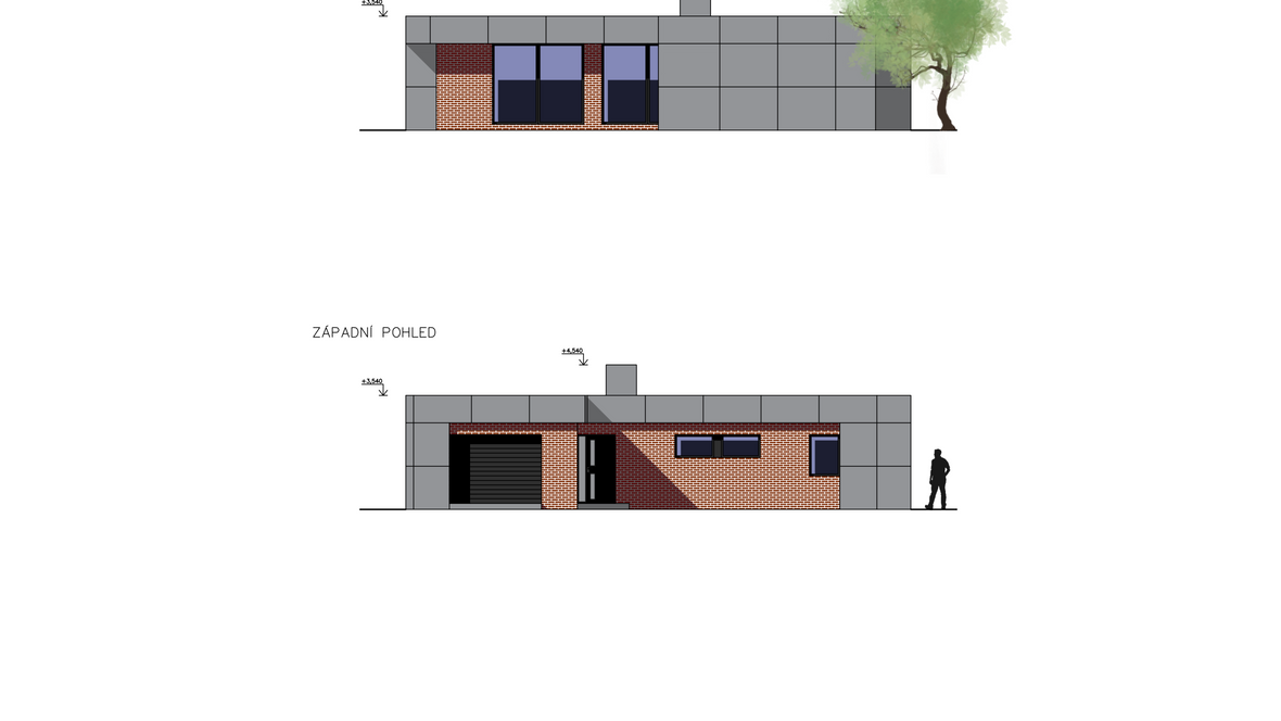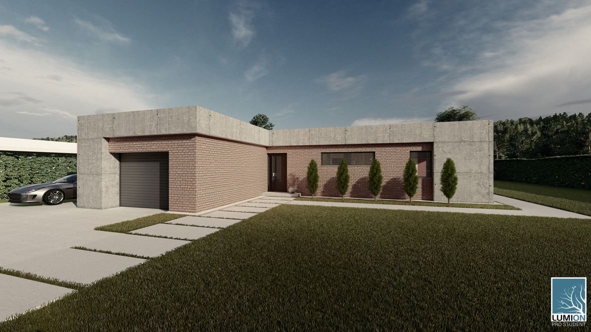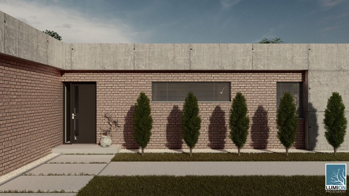 MYŠLENKA Cílem bylo vytvořit soběstačný jednopodlažní rodinný dům s velkorysým vnitřním prostorem, který je dostatečně prosvětlen a bude příjemným a pohodlným prostředím pro život čtyřčlenné rodiny. ARCHITEKTONICKÉ A DISPOZIČNÍ ŘEŠENÍ Rodinný dům je rozdělen na tři části zastřešených zelenou střechou. Nachází se zde garáž s kapacitou jednoho auta. Využít lze také stání vedle objektu. Součástí domu je také nekrytá terasa s grilem situovaná na jih. Dominantním materiálem je režné zdivo, které doplňuje pohledový beton. Na jižní části brání betonová konstrukce vnikání letního slunečního světla hluboko do místnosti, v zimě slunce místnosti naopak vyhřívá. ŘEŠENÍ PROSVĚTLENÍ K prosvětlení hlavních místností domu slouží francouzská okna umístěna na jižní a východní fasádě. Ta prosvětlují obývací pokoj s kuchyní, ložnici a oba pokoje. Doplňkovým prosvětlením zde slouží světlíky CFU, CVU, ISU 2093 a CFU, CVU, ISU 1093 spolu se světlovody Velux. Informace o prosvětlení pochází z programu Daylight Visualizer.