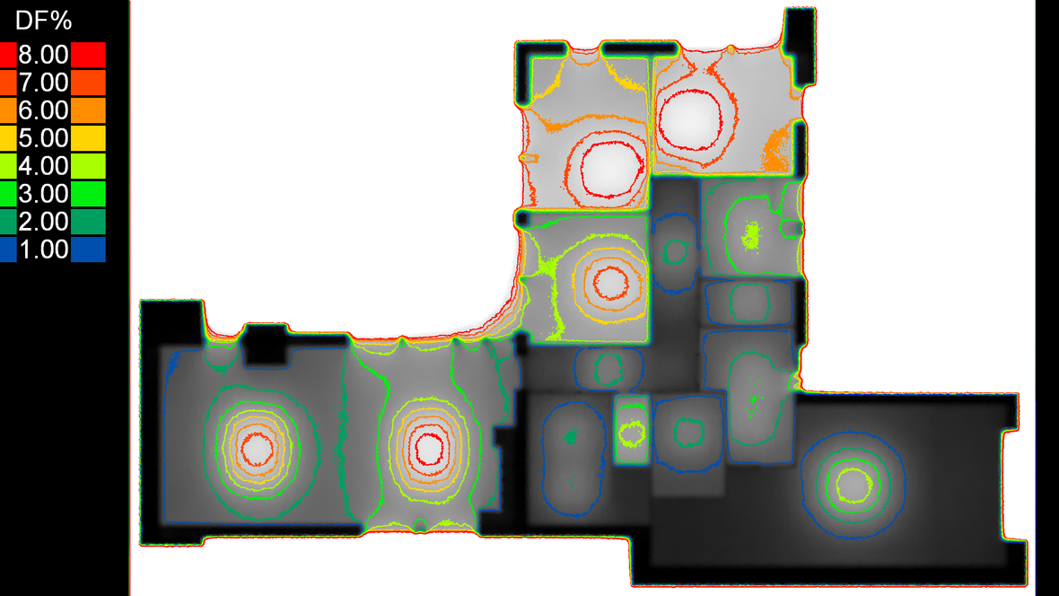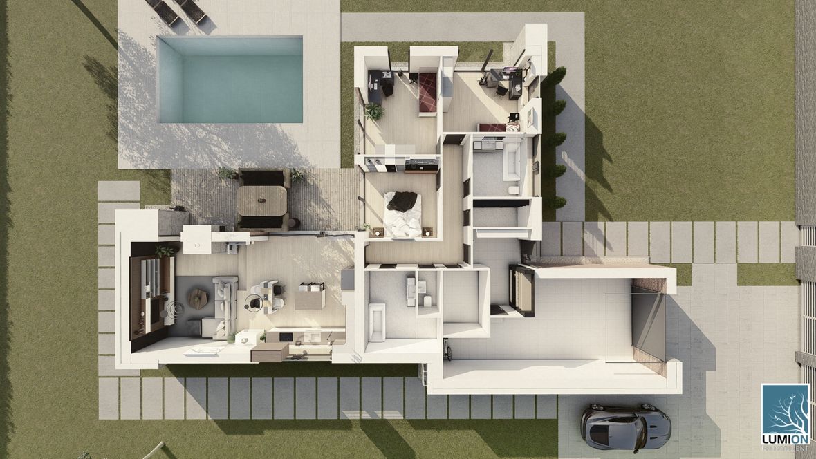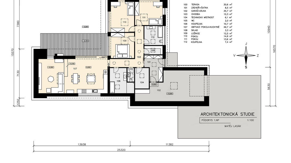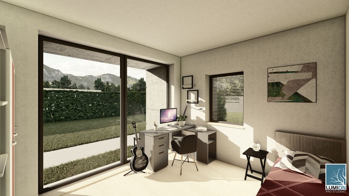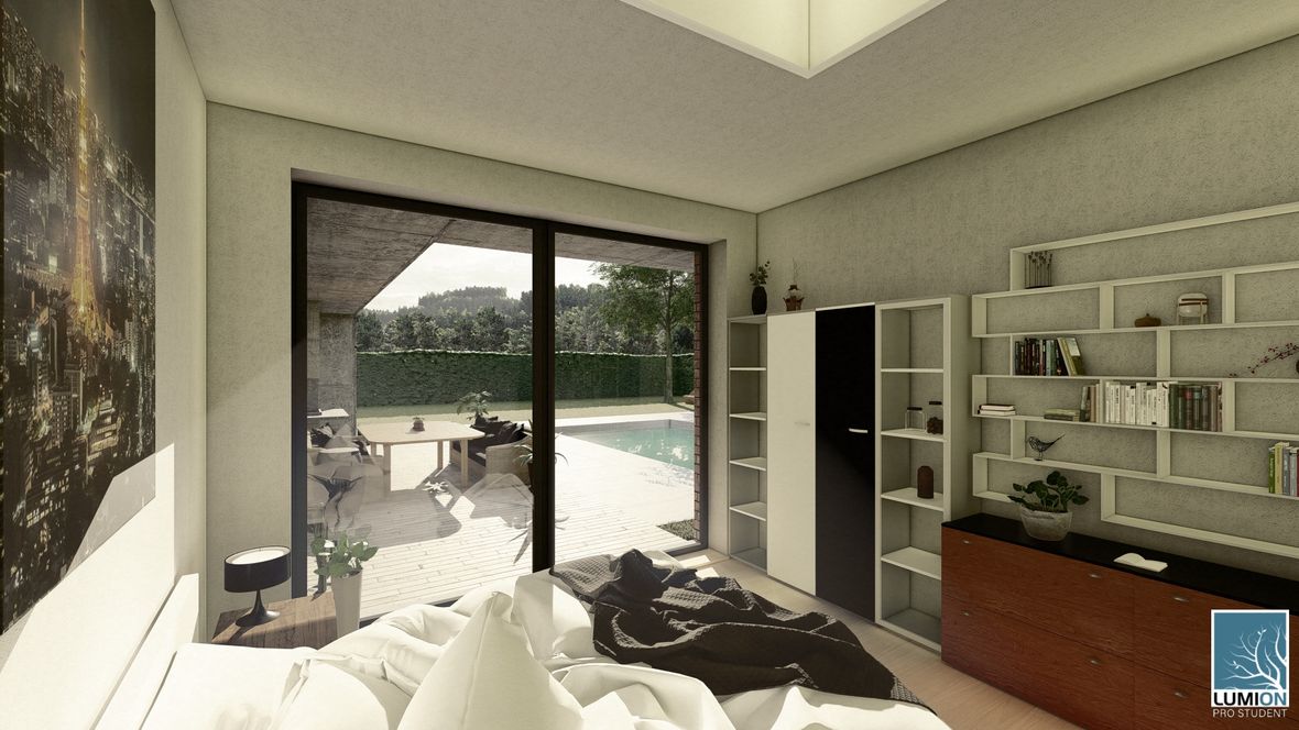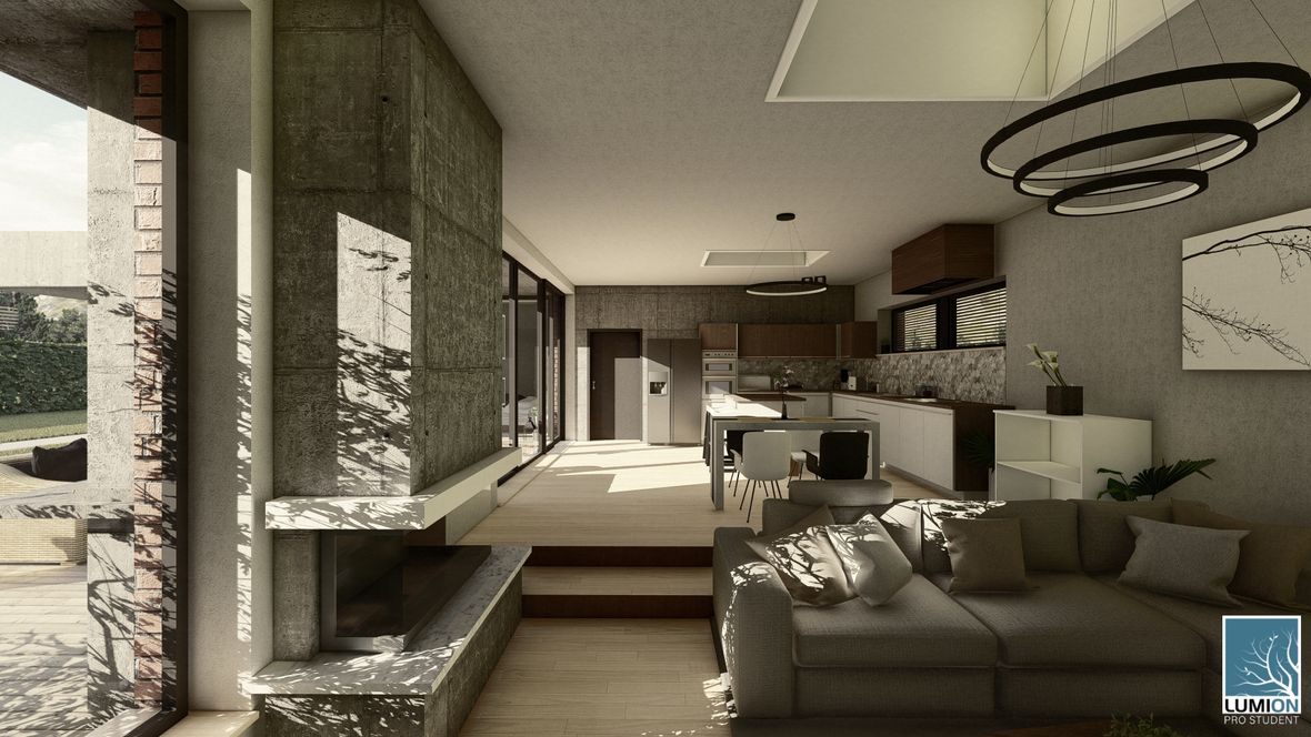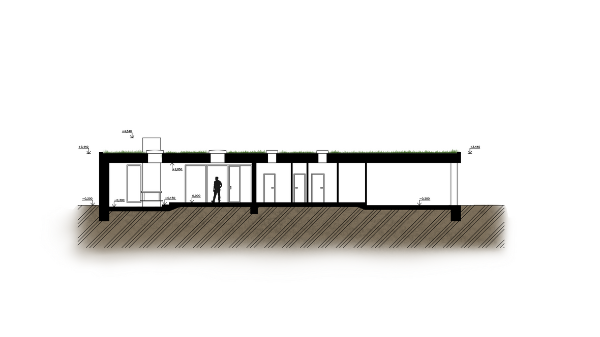 MYŠLENKA Cílem bylo vytvořit soběstačný jednopodlažní rodinný dům s velkorysým vnitřním prostorem, který je dostatečně prosvětlen a bude příjemným a pohodlným prostředím pro život čtyřčlenné rodiny. ARCHITEKTONICKÉ A DISPOZIČNÍ ŘEŠENÍ Rodinný dům je rozdělen na tři části zastřešených zelenou střechou. Nachází se zde garáž s kapacitou jednoho auta. Využít lze také stání vedle objektu. Součástí domu je také nekrytá terasa s grilem situovaná na jih. Dominantním materiálem je režné zdivo, které doplňuje pohledový beton. Na jižní části brání betonová konstrukce vnikání letního slunečního světla hluboko do místnosti, v zimě slunce místnosti naopak vyhřívá. ŘEŠENÍ PROSVĚTLENÍ K prosvětlení hlavních místností domu slouží francouzská okna umístěna na jižní a východní fasádě. Ta prosvětlují obývací pokoj s kuchyní, ložnici a oba pokoje. Doplňkovým prosvětlením zde slouží světlíky CFU, CVU, ISU 2093 a CFU, CVU, ISU 1093 spolu se světlovody Velux. Informace o prosvětlení pochází z programu Daylight Visualizer.
