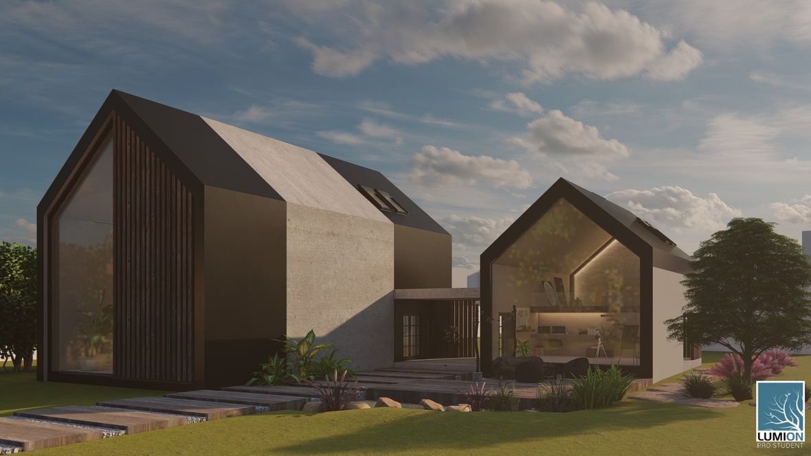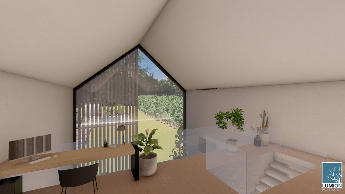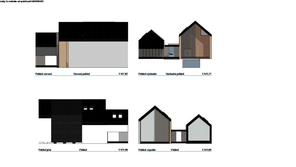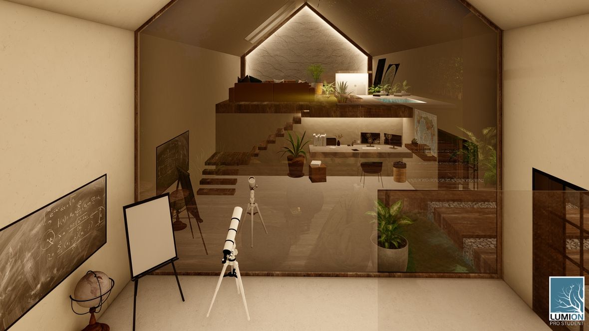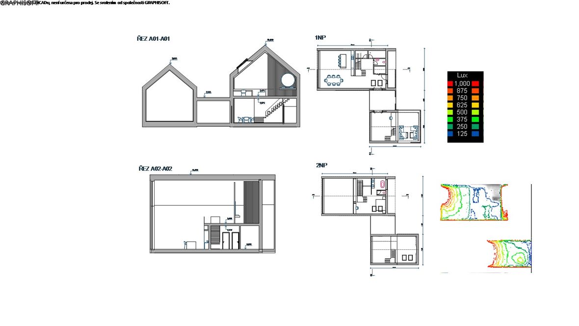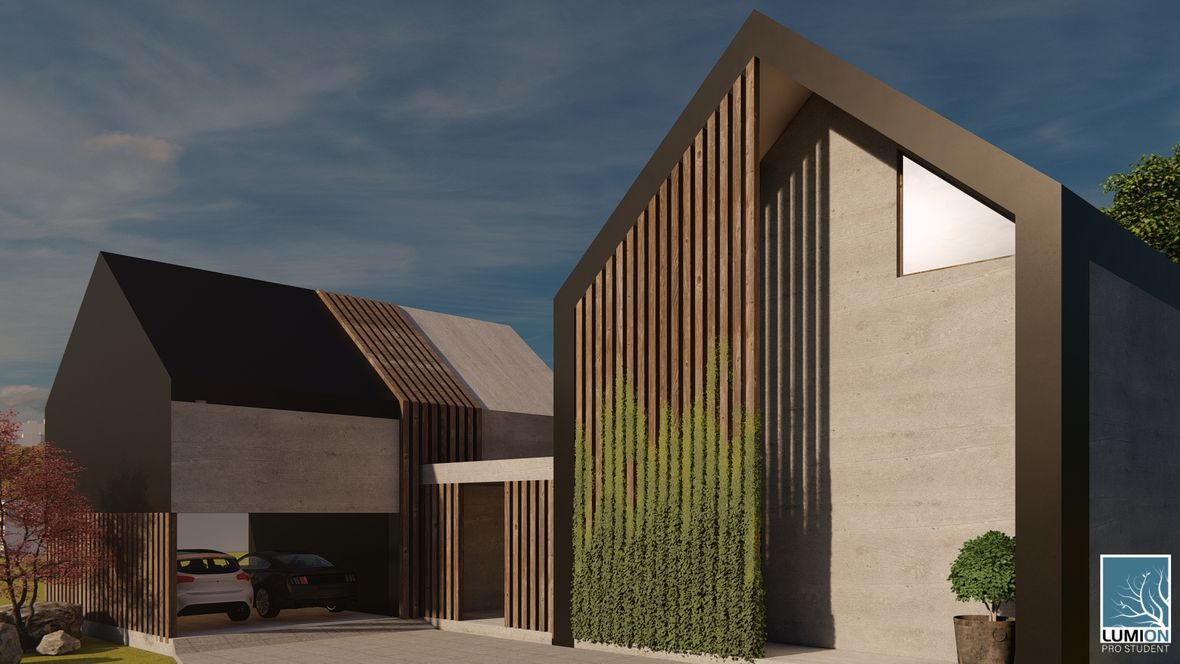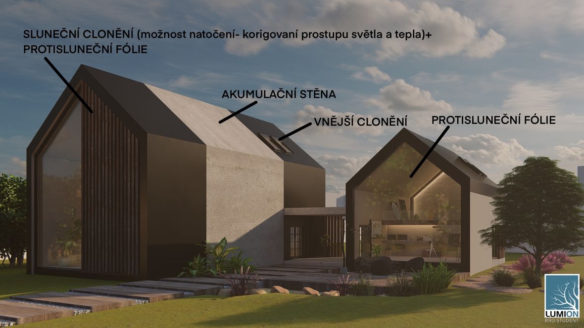 Rozlehlý pozemek nad krásným, ničím nerušeným údolím s korytem řeky Jihlavy. Výhled na rozsáhlou, městem nerušenou oblohu ve dne i v noci. Naprosto ideální místo pro milovníka hvězdářství. Na rohovém pozemku v Třebíči na Jasanově ulici jsem navrhla dům pro pár se zálibou v astronomii. Objekt je složen ze dvou hmot mezi sebou propojených. Dominantnější část je umístěna na severu pozemku a respektuje uliční čáru s ostatními domy ulice ze severní části. Dominantnější část mé budovy jsem umístila na sever z několika důvodů: tvoří pomyslnou hranici mého pozemku se sousedními a také pomalu, ale jistě postupuje od domů větších a dominantnější ze severní strany ke straně východní, kterou doplňují domy decentnější a menších rozměrů. Proto jsem z cela jistě svou druhou část umístila k jihu. Svou velikostí doplňuje menší domy z východu. Navrhnutý objekt jsem rozdělila na dvě části z jednoduchého důvodu. Severnější část bude tvořit obytnou zónu se všemi místnostmi, zatímco menší jižní část bude určena jako hvězdárna. Propojeny jsou mezi sebou plochou střechou, která zajišťuje komfort při přecházení. Tato chodba je velmi důležitou součástí mého objektu, protože ze dvou částí tvoří jednu. Může však poukazovat na mnoho dalších okolností jako např. propojení života člověka s vesmírem. Fasádu domu tvoří tmavý válcovaný plech, betonová stěrka a dřevěné doplňky. Tvar budovy je dotvářen sedlovou střechou se solárními panely. Vchod je umístěn z východní strany. Obytnou část, která nás může při příchodu oslovit jednoduchým schodištěm s esteticky využitým prostorem má v 1NP otevřený kuchyňský kout s jídelnou, který má volný a vzdušný prostor. Nejvíc kouzelný je však výhled kterému napomáhá prosklený štít. Dále je součástí 1NP šatna, WC a technická místnost a komora. Ve 2NP můžeme najít útulnou ložnici s koupelnu. Druhou velmi důležitou částí mé budovy, je hvězdárna. Hlavní osvětlení hvězdárny také zajišťuje prosklení štítu. Pod polovinou hvězdárny z uliční strany je umístěno parkoviště pro 2 auta, z toho důvodu je jedna polovina této budovy vyvýšená se schodištěm. Jsou zde umístěny všechny potřebné věci pro hvězdáře. V dolní části je před štítem umístěn teleskop s výhledem na celou noční oblohu. V obou částech mého objektu najdeme 2 střešní okna VELUX, které zajišťují potřebné prosvětlení zadní části domu. Exteriér je tvořen krásnou zahradou, posezením, ohništěm, nebo také bazénem.
