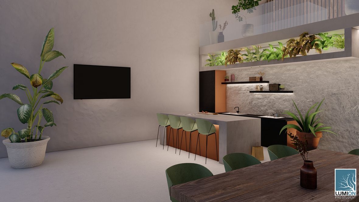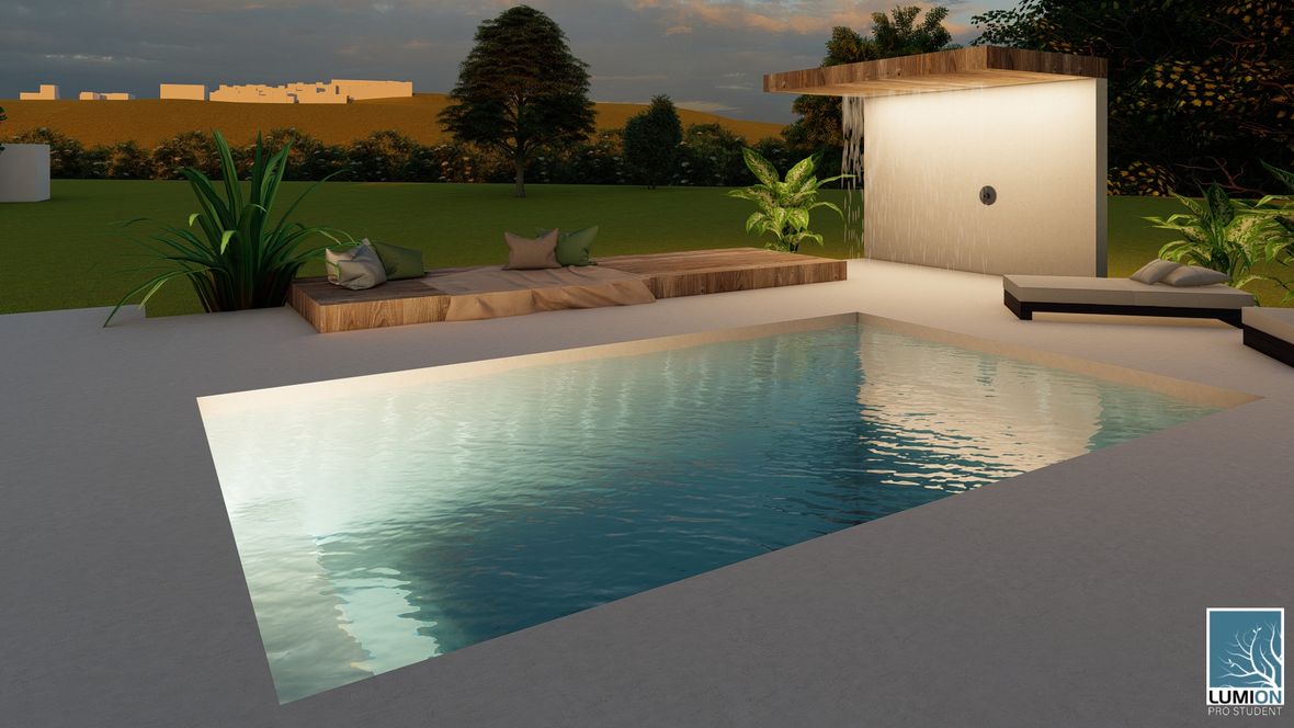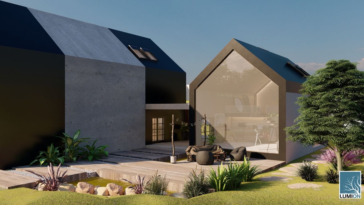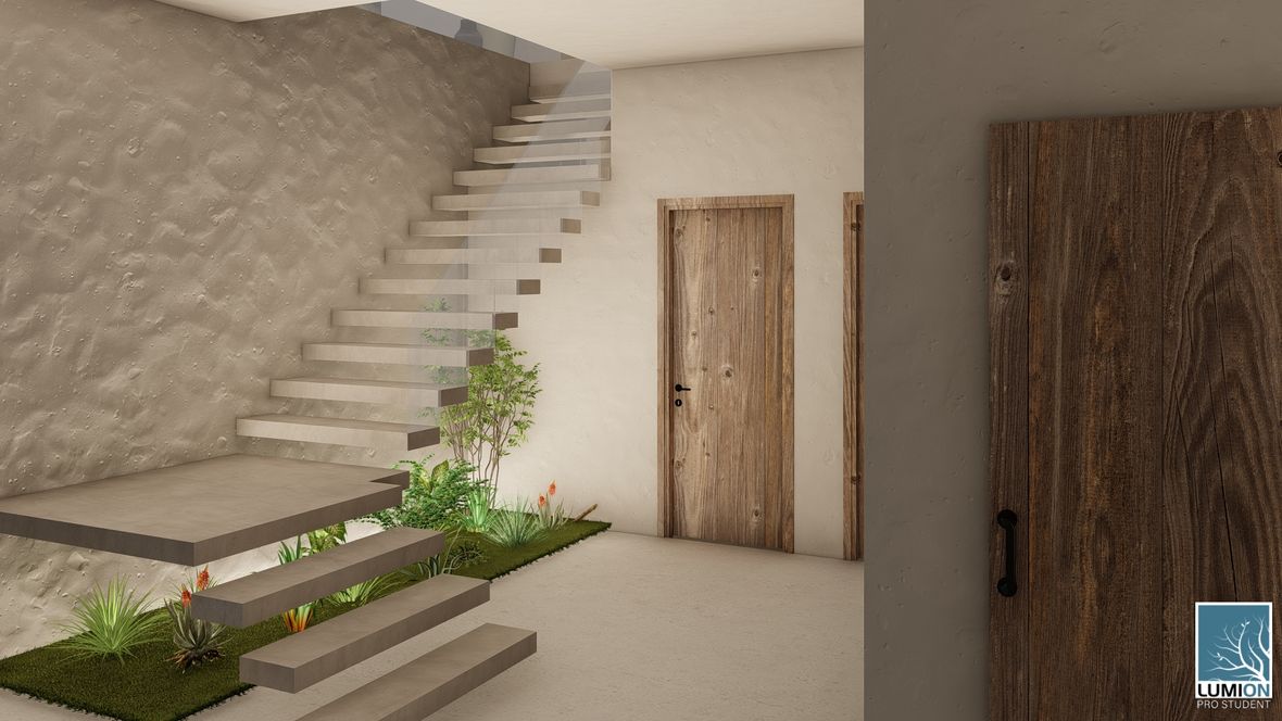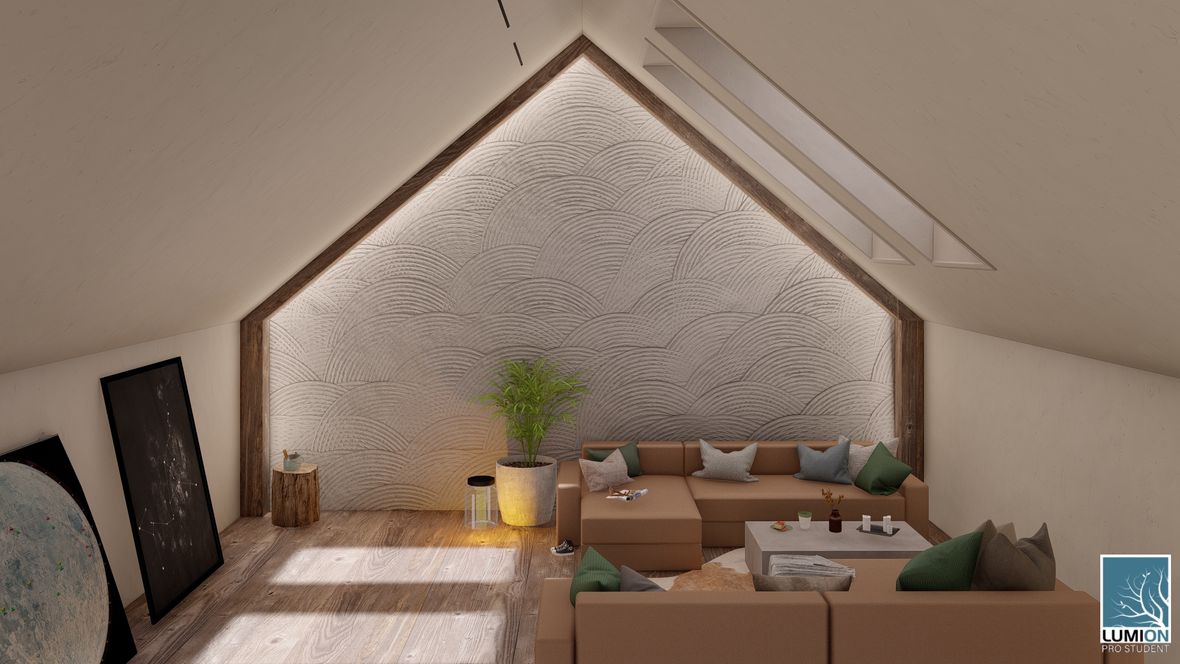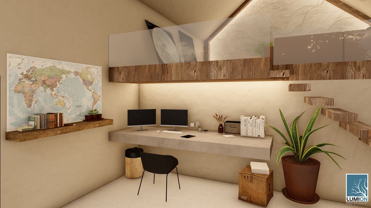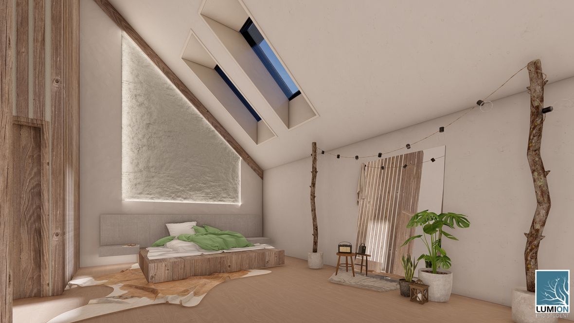 Rozlehlý pozemek nad krásným, ničím nerušeným údolím s korytem řeky Jihlavy. Výhled na rozsáhlou, městem nerušenou oblohu ve dne i v noci. Naprosto ideální místo pro milovníka hvězdářství. Na rohovém pozemku v Třebíči na Jasanově ulici jsem navrhla dům pro pár se zálibou v astronomii. Objekt je složen ze dvou hmot mezi sebou propojených. Dominantnější část je umístěna na severu pozemku a respektuje uliční čáru s ostatními domy ulice ze severní části. Dominantnější část mé budovy jsem umístila na sever z několika důvodů: tvoří pomyslnou hranici mého pozemku se sousedními a také pomalu, ale jistě postupuje od domů větších a dominantnější ze severní strany ke straně východní, kterou doplňují domy decentnější a menších rozměrů. Proto jsem z cela jistě svou druhou část umístila k jihu. Svou velikostí doplňuje menší domy z východu. Navrhnutý objekt jsem rozdělila na dvě části z jednoduchého důvodu. Severnější část bude tvořit obytnou zónu se všemi místnostmi, zatímco menší jižní část bude určena jako hvězdárna. Propojeny jsou mezi sebou plochou střechou, která zajišťuje komfort při přecházení. Tato chodba je velmi důležitou součástí mého objektu, protože ze dvou částí tvoří jednu. Může však poukazovat na mnoho dalších okolností jako např. propojení života člověka s vesmírem. Fasádu domu tvoří tmavý válcovaný plech, betonová stěrka a dřevěné doplňky. Tvar budovy je dotvářen sedlovou střechou se solárními panely. Vchod je umístěn z východní strany. Obytnou část, která nás může při příchodu oslovit jednoduchým schodištěm s esteticky využitým prostorem má v 1NP otevřený kuchyňský kout s jídelnou, který má volný a vzdušný prostor. Nejvíc kouzelný je však výhled kterému napomáhá prosklený štít. Dále je součástí 1NP šatna, WC a technická místnost a komora. Ve 2NP můžeme najít útulnou ložnici s koupelnu. Druhou velmi důležitou částí mé budovy, je hvězdárna. Hlavní osvětlení hvězdárny také zajišťuje prosklení štítu. Pod polovinou hvězdárny z uliční strany je umístěno parkoviště pro 2 auta, z toho důvodu je jedna polovina této budovy vyvýšená se schodištěm. Jsou zde umístěny všechny potřebné věci pro hvězdáře. V dolní části je před štítem umístěn teleskop s výhledem na celou noční oblohu. V obou částech mého objektu najdeme 2 střešní okna VELUX, které zajišťují potřebné prosvětlení zadní části domu. Exteriér je tvořen krásnou zahradou, posezením, ohništěm, nebo také bazénem.