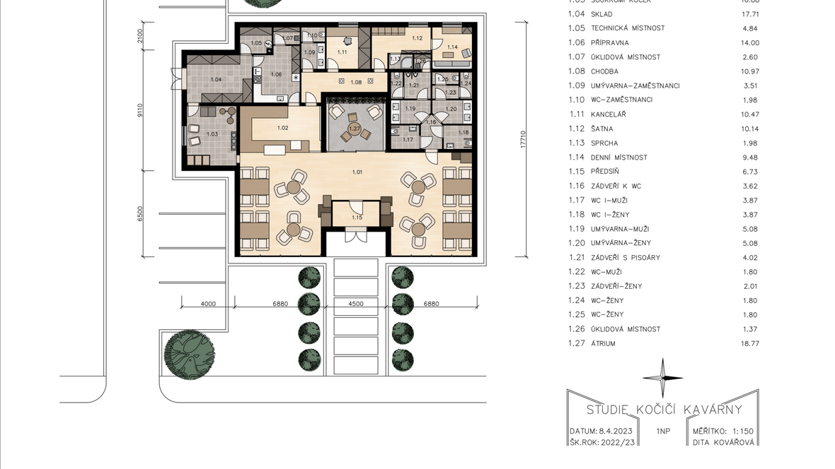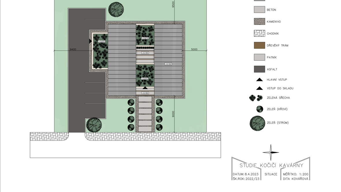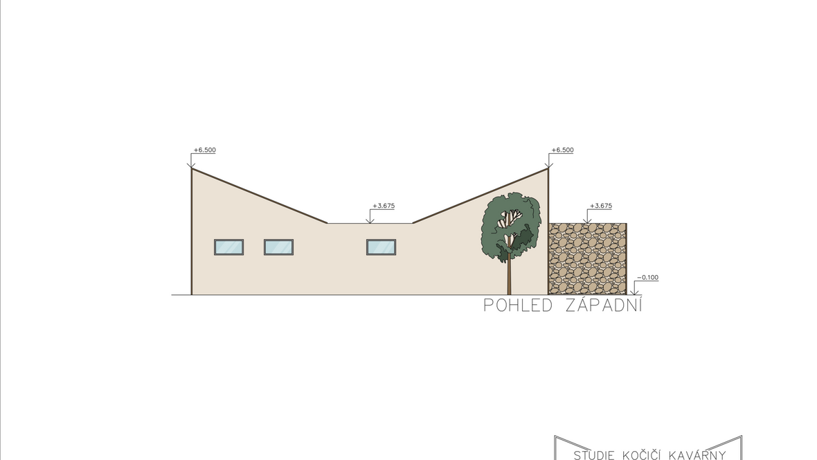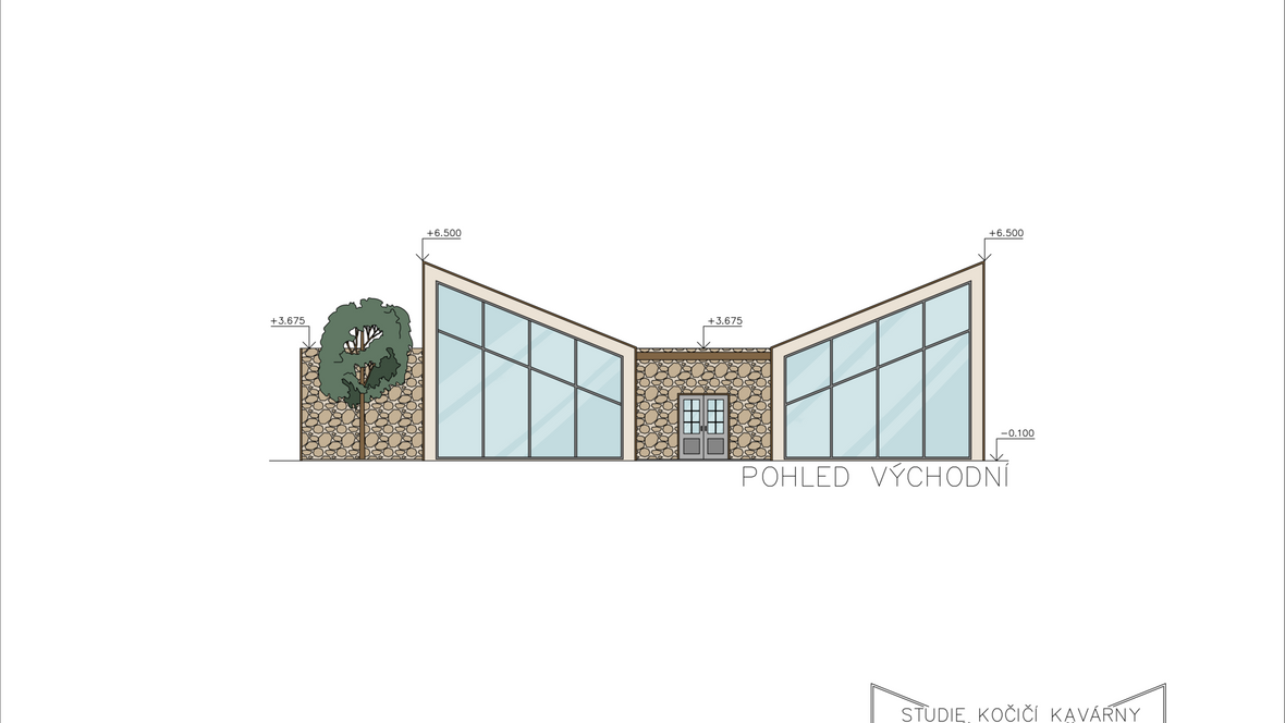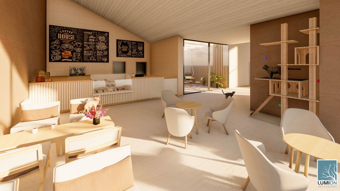 Hlavní myšlenkou mého projektu bylo vytvořit příjemné, prosvětlené a bezbariérové prostředí kavárny sloužící pro odpočinek ve společnosti koček. V centru budovy se nachází malé atrium pro posezení na čerstvém vzduchu a zároveň větší přísun přirozeného světla do prostor kavárny. Prosklené plochy jsou stíněny venkovními roletami. Dva světlovody VELUX (TCR 0K14 0010 350 mm pro ploché střechy) přivádí denní světlo do chodby pro zaměstnance, tvoří tak úspornou a praktickou formu osvětlení frekventované zóny objektu. Součástí projektu je fyzický model 1:100.