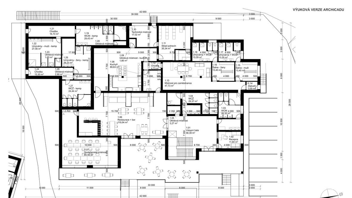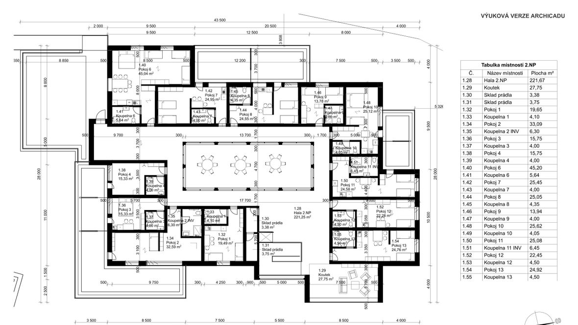 Katastrální území: Dobrovítova Lhota [768782] Parcela: 108/6 Objekt se nachází na řece Sázava, v obci Trpišovice, nedaleko města Ledeč nad Sázavou, plní funkci rekreačního střediska s parkovištěm a ubytováním. V 1. NP budovy se nachází vstupní hala s recepcí, dále WC, úklidová místnost , schodiště s výtahem pro invalidy, restaurace, kuchyň, společenská místnost, zázemí pro zaměstnance, sprchy, WC pro zaměstnance, sklad potravin a technická místnost. Dále je k hlavní budově z jižní strany připojena budova umýváren a WC pro kemp. V 2. NP se nachází pokoje pro 42 hostů, odpočívací kout s knihovnou a prosklené atrium. Z některých pokojů je přístup na vegetační terasu. Mimo jiné se krom hlavního schodiště ve 2. NP nachází i únikový požární východ. Budova je postavena v moderním stylu. Plochá vegetační střecha napomáhá k obnovení zeleně, která byla touto stavbou zastavěna, světlíky prosvětlují vnitřní prostor. Budova je celkově velmi prosklená a prosvětlená.