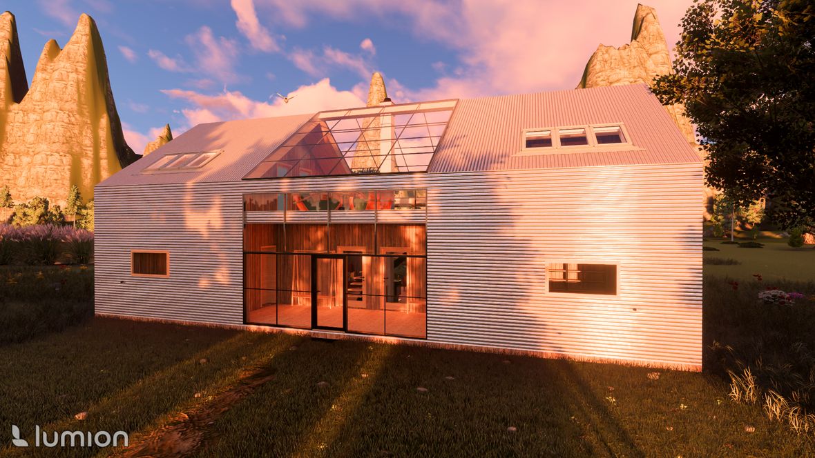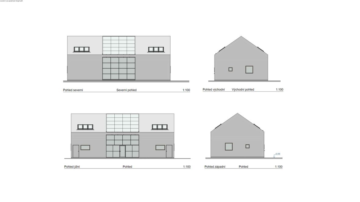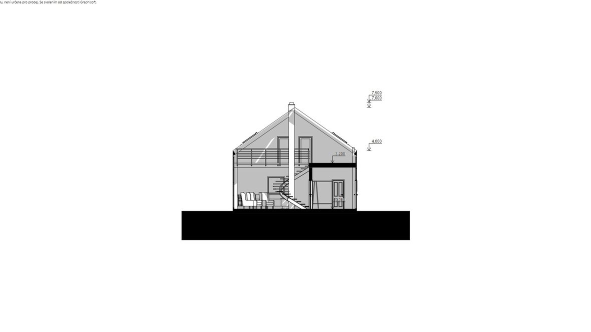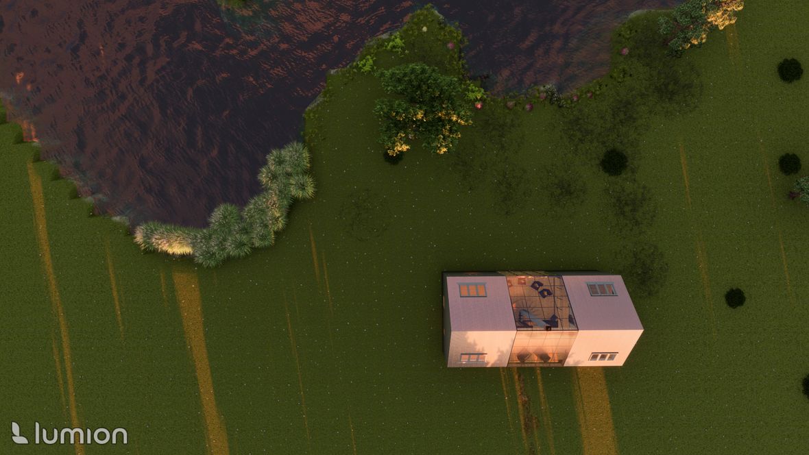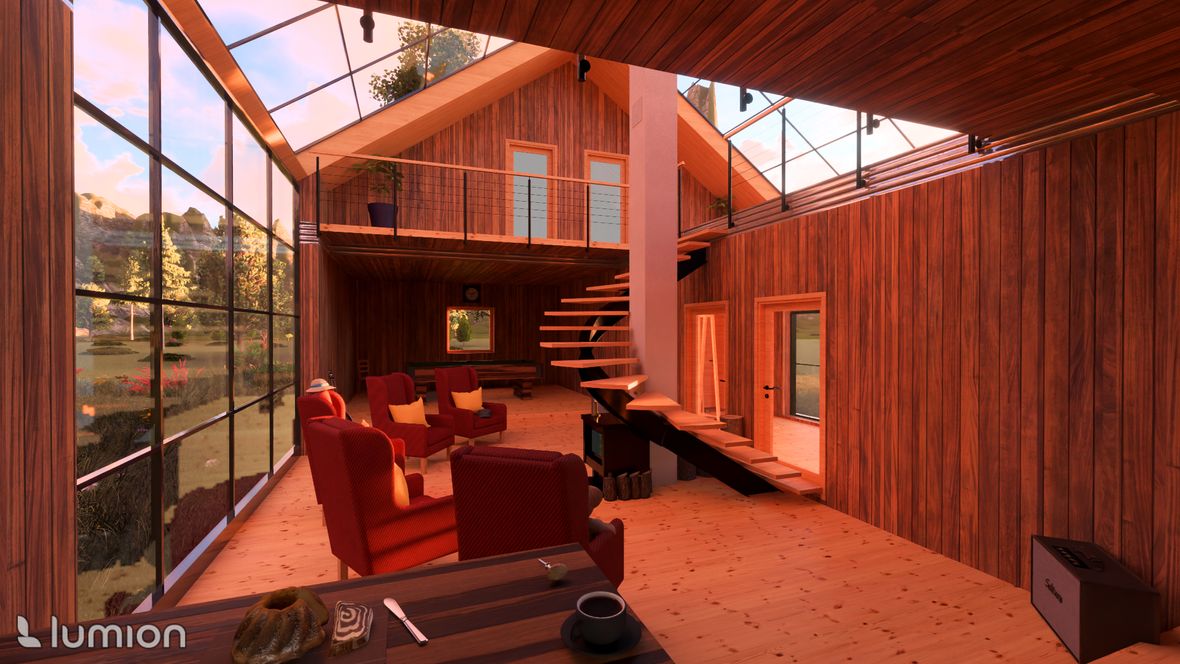 Projekt víkendové chaty je založen na mezilidském kontaktu, tak jak ho znali naši předkové - pěkně z očí do očí, off-line. Celý objekt je navržen tak, aby se hlavní dění odehrávalo ve velkém společenském prostoru. V přízemí je nalevo kuchyňský kout s jídelnou, vpravo pak kulečník - tyto části jsou výškově odděleny od hlavního prostoru, jehož dominantou je na osu umístěná kombinace krbu a centrálního schodiště. Schodištěm se pozvolně dostaneme na otevřenou galerii, a z ní pak do 4 soukromých pokojů vybavených sestavou oken STUDIO "3 v 1" firmy Velux. Okna poskytují nejen dostatečné prosvětlení, ale také výhled na hvězdy. Součástí objektu je také koupelna, WC, technická místnost a kolárna (sklad). Ekologie je v dnešní době důležité téma. Rozhodl, jsem se, že objekt bude zhotoven z recyklovatelných materiálů. Hlavní nosná konstrukce bude dřevěná, vše ostatní bude zhotoveni z materiálu Chip[s] Board® (desky z bramborových slupek) o tepelnou izolaci se postarají konopné vláknité desky. Fasáda bude z vlnitého plechu, který dává vyniknout symetrii stavby. Založená bude na zemních vrutech. Okna budou vybavena inteligentním systémem stínění, aby nedocházelo k přehřívání stavby.