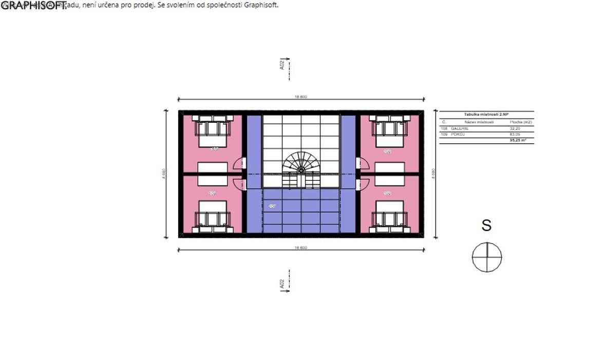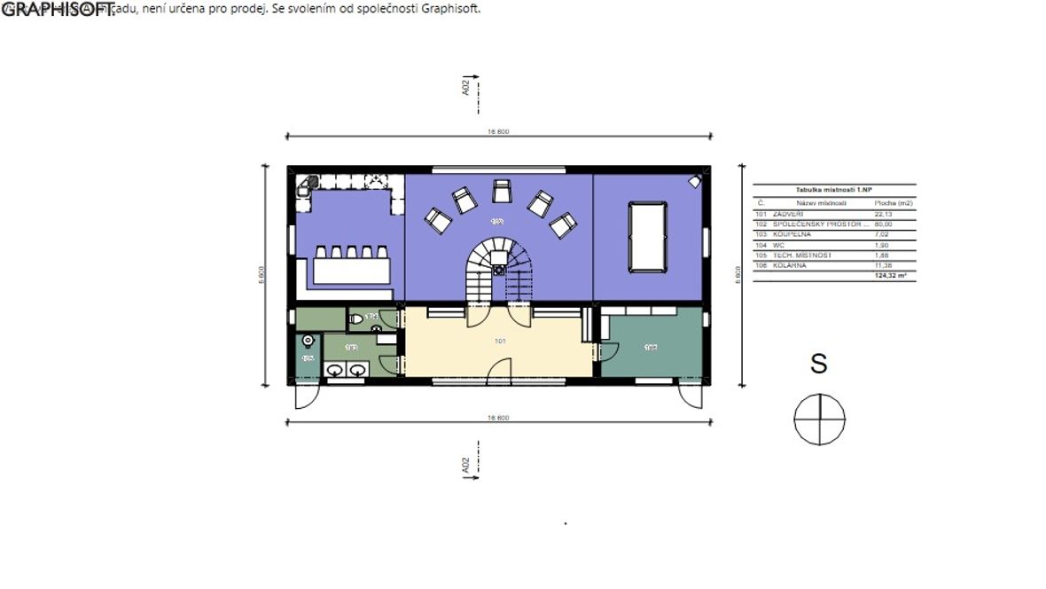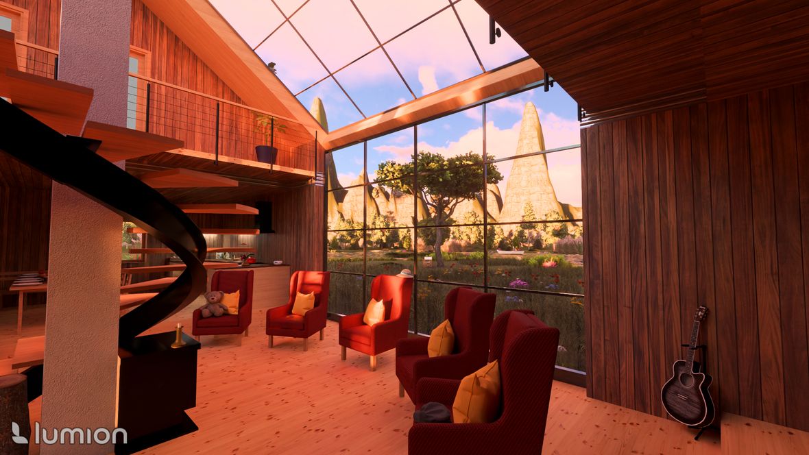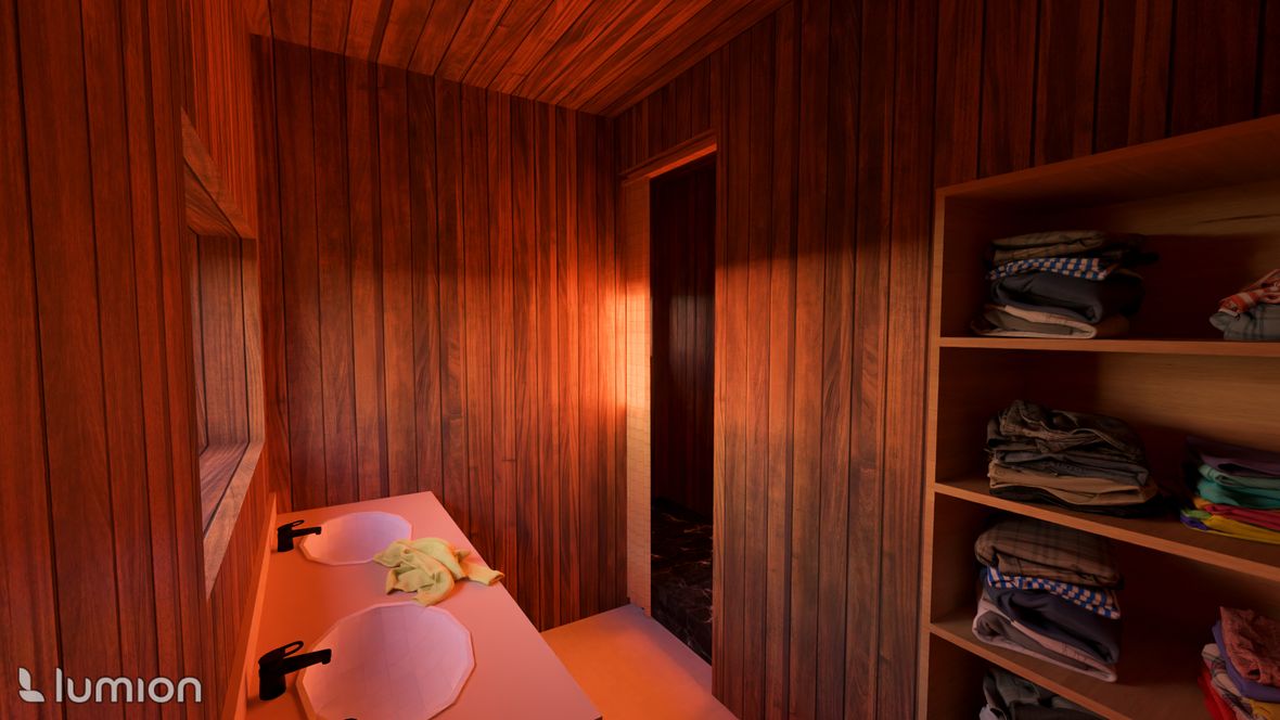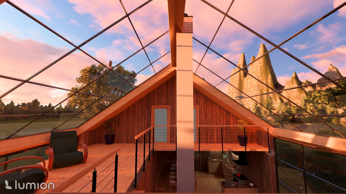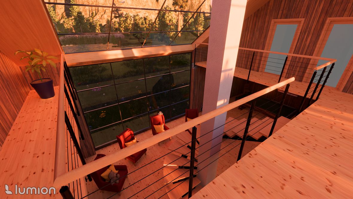 Projekt víkendové chaty je založen na mezilidském kontaktu, tak jak ho znali naši předkové - pěkně z očí do očí, off-line. Celý objekt je navržen tak, aby se hlavní dění odehrávalo ve velkém společenském prostoru. V přízemí je nalevo kuchyňský kout s jídelnou, vpravo pak kulečník - tyto části jsou výškově odděleny od hlavního prostoru, jehož dominantou je na osu umístěná kombinace krbu a centrálního schodiště. Schodištěm se pozvolně dostaneme na otevřenou galerii, a z ní pak do 4 soukromých pokojů vybavených sestavou oken STUDIO "3 v 1" firmy Velux. Okna poskytují nejen dostatečné prosvětlení, ale také výhled na hvězdy. Součástí objektu je také koupelna, WC, technická místnost a kolárna (sklad). Ekologie je v dnešní době důležité téma. Rozhodl, jsem se, že objekt bude zhotoven z recyklovatelných materiálů. Hlavní nosná konstrukce bude dřevěná, vše ostatní bude zhotoveni z materiálu Chip[s] Board® (desky z bramborových slupek) o tepelnou izolaci se postarají konopné vláknité desky. Fasáda bude z vlnitého plechu, který dává vyniknout symetrii stavby. Založená bude na zemních vrutech. Okna budou vybavena inteligentním systémem stínění, aby nedocházelo k přehřívání stavby.