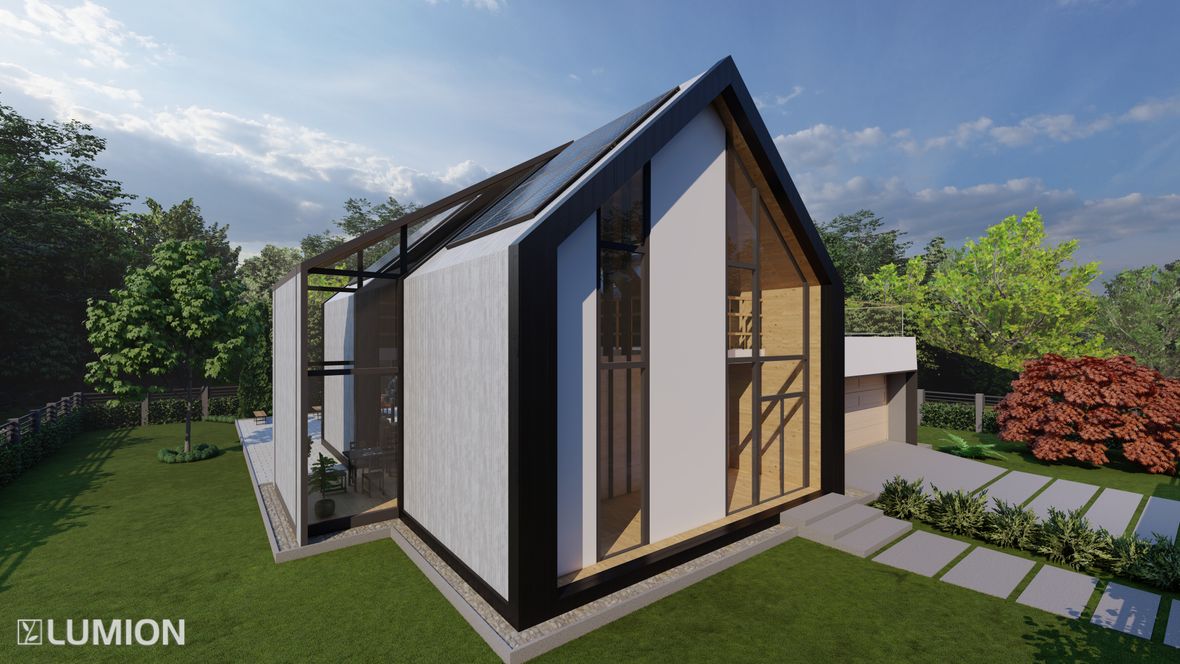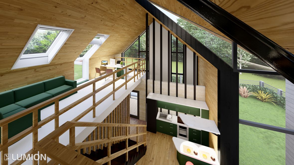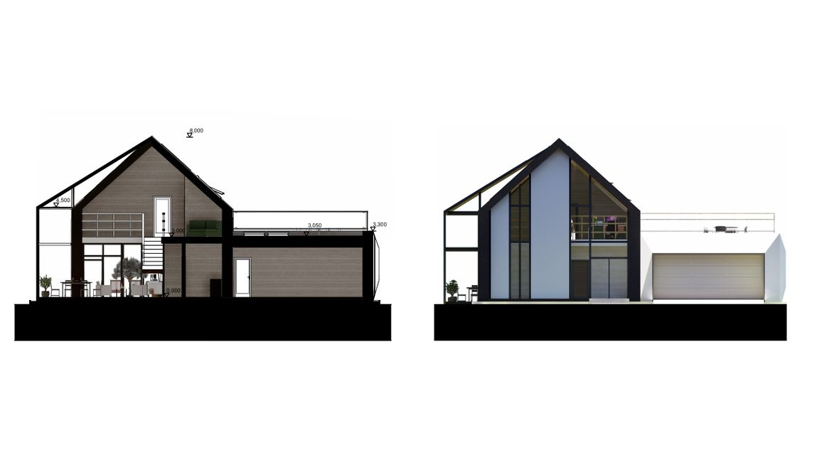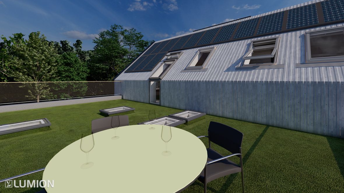 Tento rodinný dům byl navržen tak, aby splnil požadavky územního plánu na rodinný dům a současně poskytoval prostor pro skleník s exotickými rostlinami. Na garáži pro dva automobily byla vytvořena zelená střecha, která dodává moderní vzhled zahradě ve dvou úrovních. Přístup na zelenou střechu umožňuje střešní terasa VELUX GEL, kde jsou světlíky VELUX CVP. Na sedlové střeše jsou instalována střešní okna VELUX GGL. Díky tomu tento dům nabízí dostatek světla a pohodlí přístupu na střešní terasu.