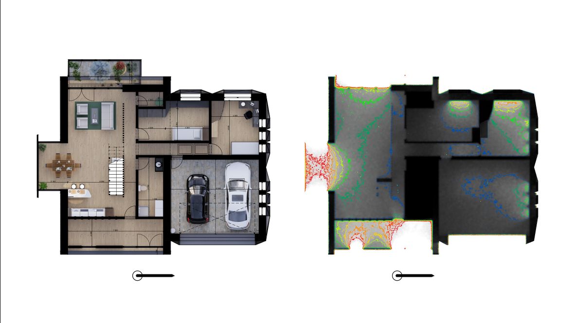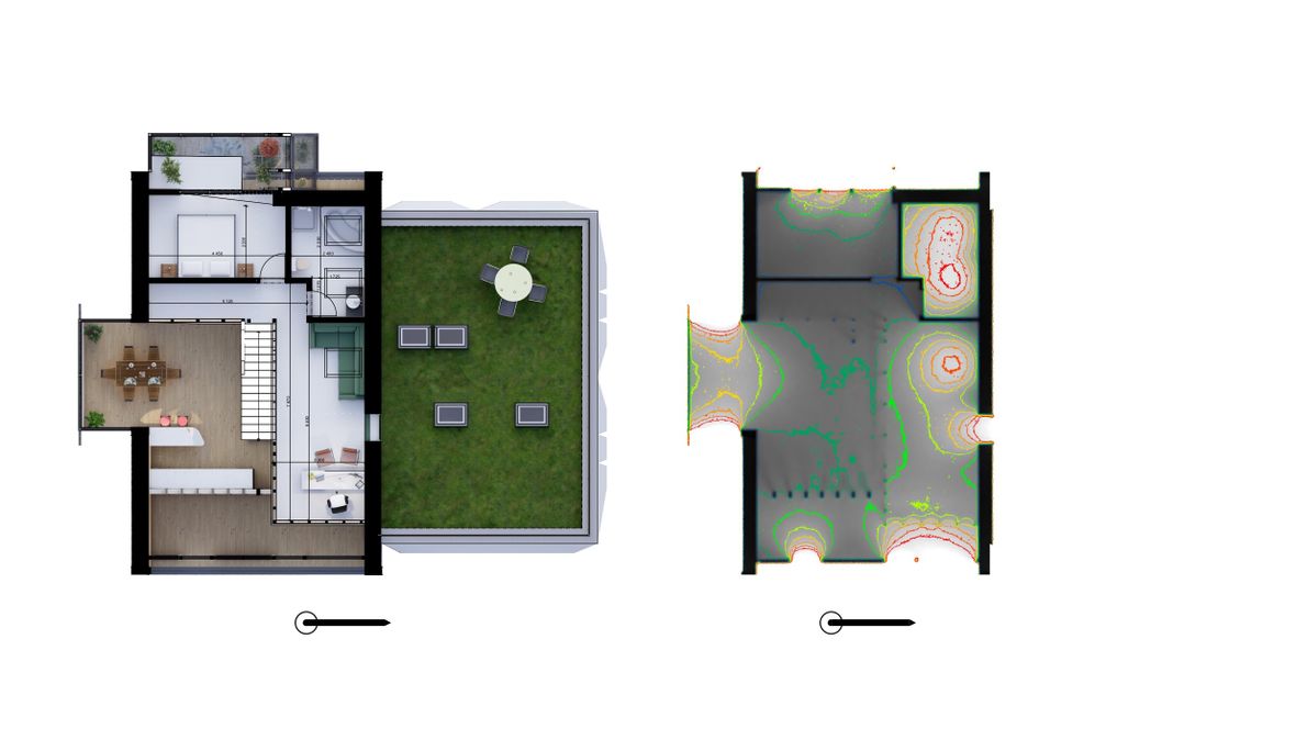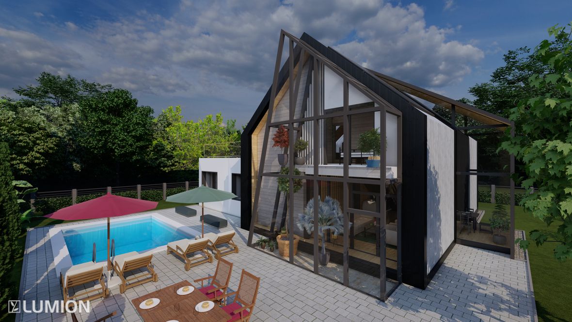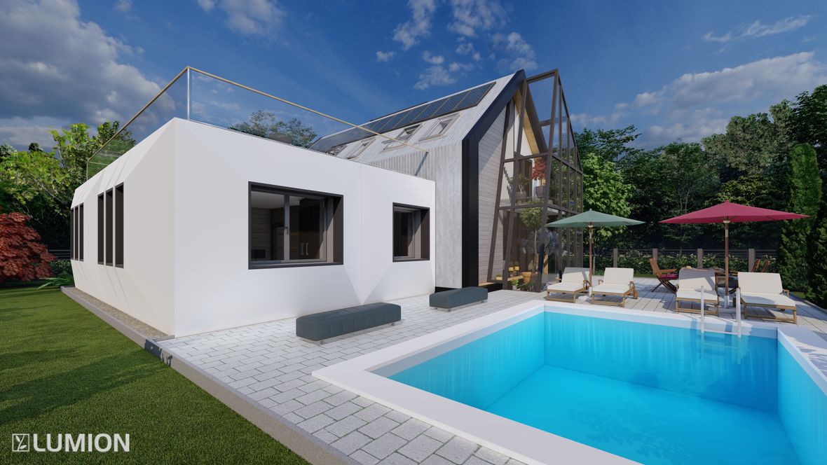 Tento rodinný dům byl navržen tak, aby splnil požadavky územního plánu na rodinný dům a současně poskytoval prostor pro skleník s exotickými rostlinami. Na garáži pro dva automobily byla vytvořena zelená střecha, která dodává moderní vzhled zahradě ve dvou úrovních. Přístup na zelenou střechu umožňuje střešní terasa VELUX GEL, kde jsou světlíky VELUX CVP. Na sedlové střeše jsou instalována střešní okna VELUX GGL. Díky tomu tento dům nabízí dostatek světla a pohodlí přístupu na střešní terasu.
