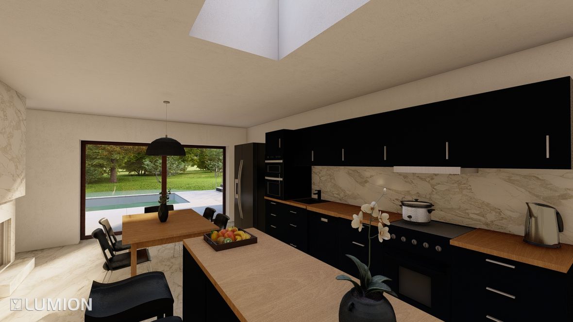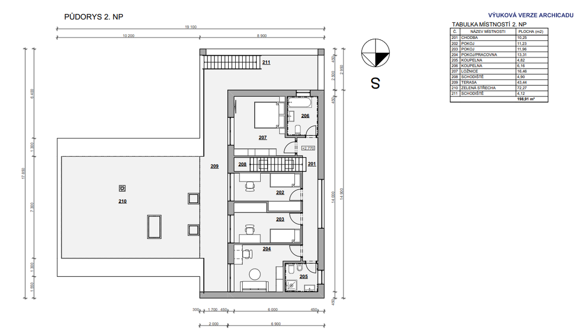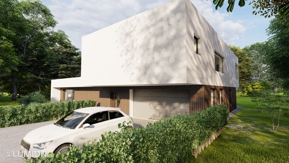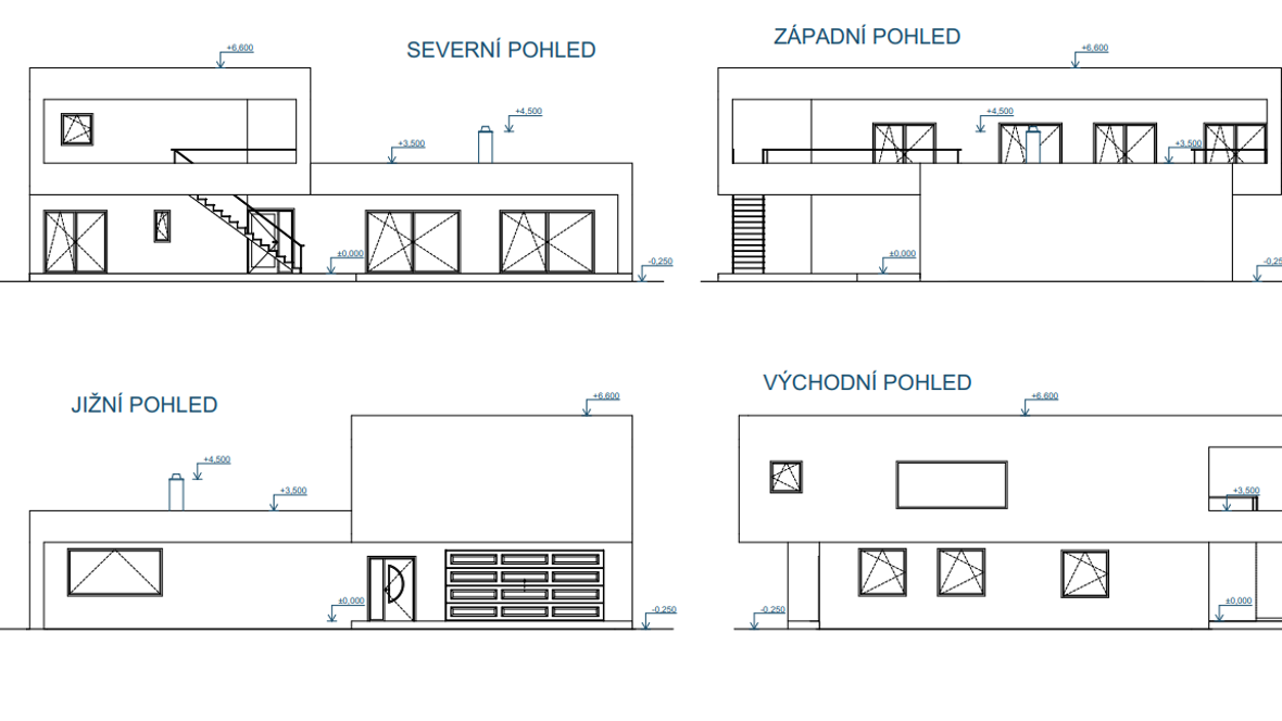 Myšlenka: Mým cílem bylo vytvořit dvoupodlažní pasivní rodinný dům, který bude odpovídat moderním trendům, ale zároveň bude v symbióze s přírodou. Dále bude dostatečně prostorný a prosvětlený pro čtyřčlennou až pětičlennou rodinu. Osvětlení: Pro dosažení dostatečného prosvětlení jsou v objektu hojně použita francouzská okna, která jsou doplněna designovými světlíky se zaobleným sklem typu CVU. Jsou zasklená trojsklem a vybavená venkovní markýzou s možností ovládání pomocí mobilního telefonu v aplikaci VELUX ACTIVE. Charakteristika projektu: Objekt je ve tvaru písmene L a je rozdělen do čtyř zón - vstupní, společenské, relaxační a klidové. Vstup je orientovaný na sever. Hlavním architektonickým a dekorativním prvkem je železobetonová konstrukce, která také slouží jako neobvyklý druh zastínění. Také je zde použitý dřevěný obklad fasády a zelená střecha pro lepší kontakt člověka s přírodou. Vytápění je řešeno pomocí tepelného čerpadla typu vzduch - voda, ze kterého je teplá voda rozváděná do podlahového topení a převážně v zimních měsících je zde taktéž možnost využít krbová kamna.