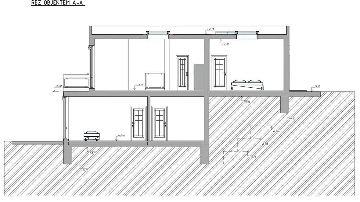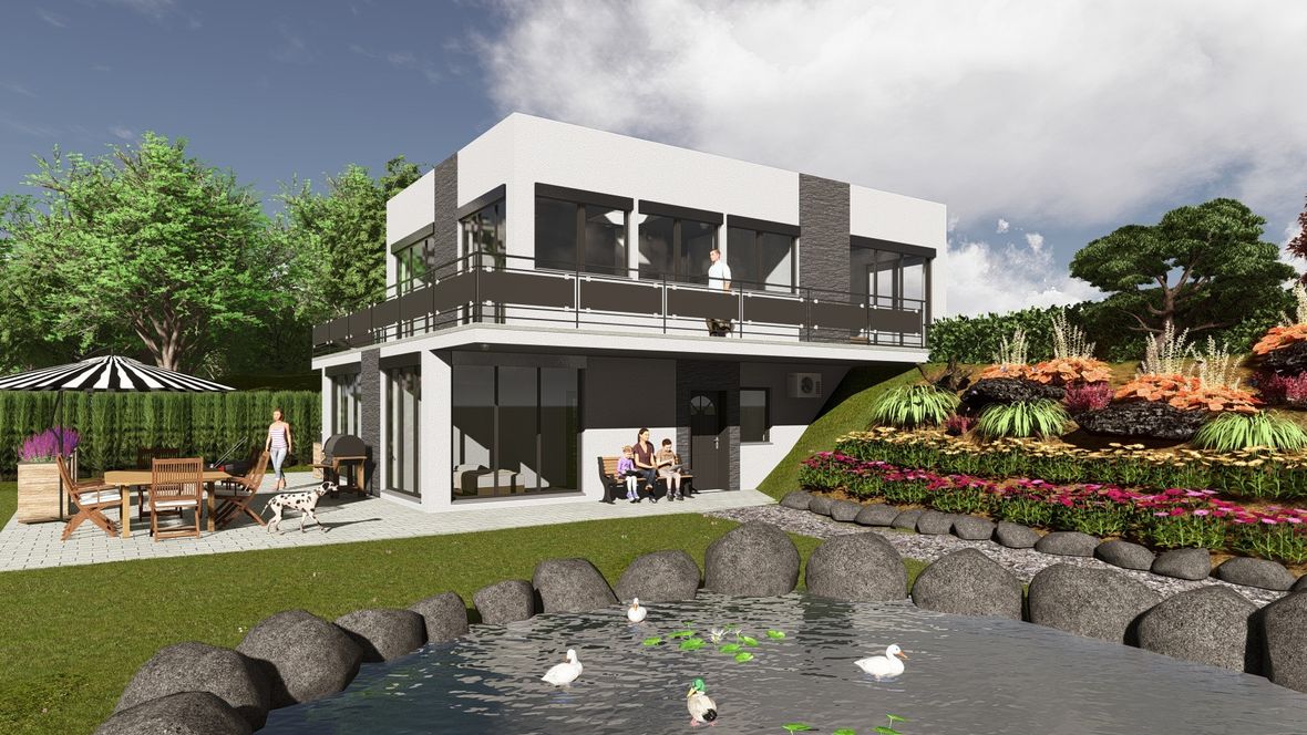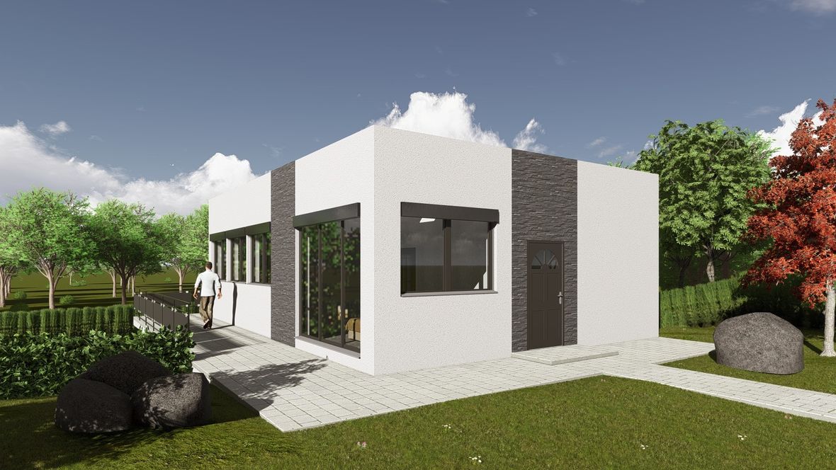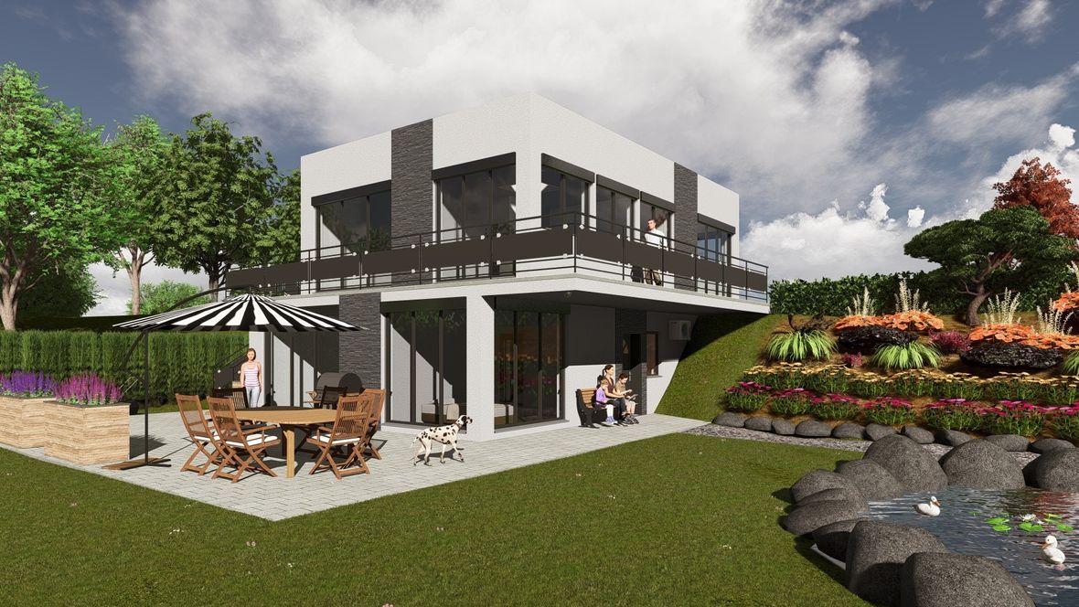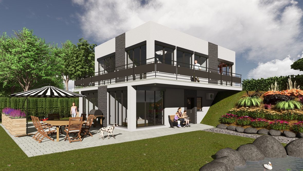 Rodinný dům Ibiza je dvou podlažní objekt s plochou střechou, který je situován do prudkého svahu. Vizuální stránka budovy je řešena v kombinaci barev černá a bílá. Bílou barvu zastupuje omítka a černou zastupuje kamenný obklad antracitové barvy. Doplňkem jsou fasádní a střešní okna v antracitové barvě, které objekt dostatečně prosvětlí. Na pozemku se nachází dominantní vodní prvek a skalka s pestrými barvami květin.