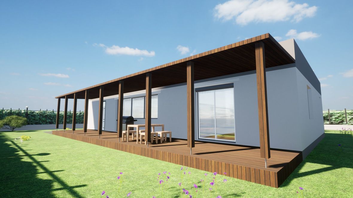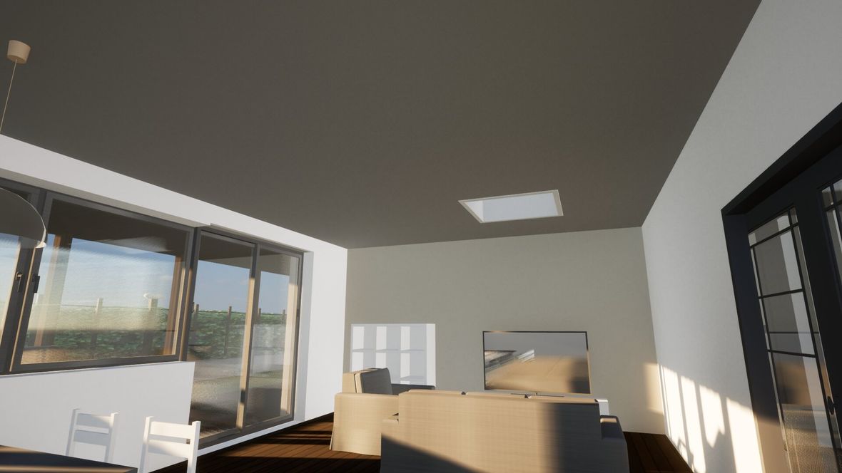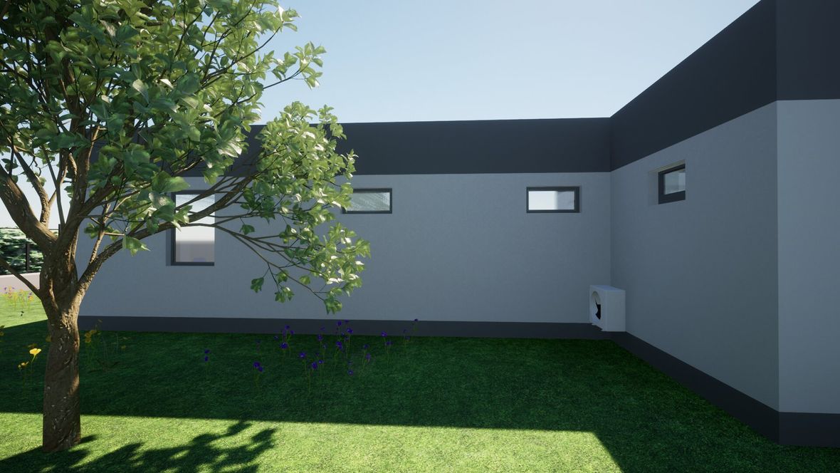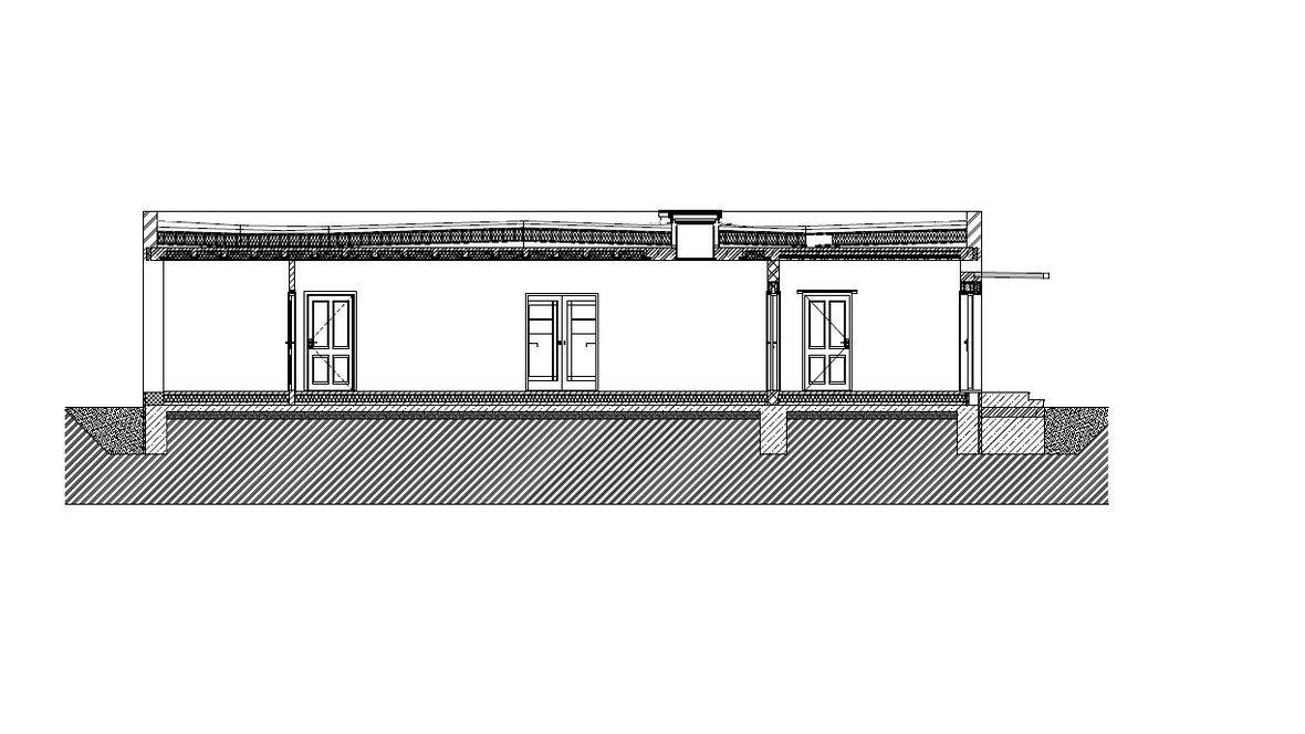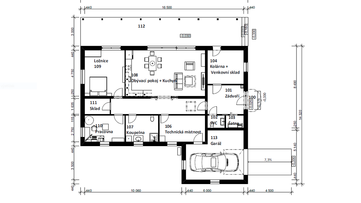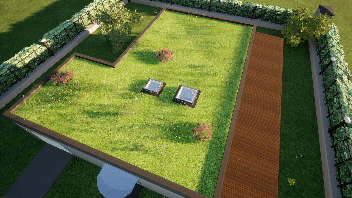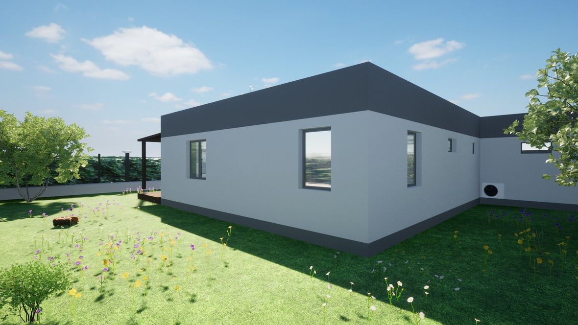 Architektonické řešení: Jedná se o přízemní stavbu typu bungalov se zelenou střechou. Dispoziční řešení 3+kk s vestavěnou garáží a prostory pro technické zařízení. Obytná část je doplněna přímým vstupem na terasu, která propojuje zahradu s obytným prostorem. Konstrukční řešení: Stavba je navržena ze systému Porotherm. Obvodové zdivo Porotherm Profi Dryfix, zastropení je řešeno pomocí POT nosníku + stropní vložky, skladba střešního pláště je zakončena vegetační vrstvou. Prosvětlení a větrání je zajištěno okny v obvodových konstrukcích + světlovody. Stavba obsahuje dva střešní světlíky od firmy Velux (VELUX FlatRoofWindowsNewGen 1000x1000, 800x800). Větší světlík prosvětluje obývací pokoj spojený s kuchyní, druhý světlík osvětluje chodbu řešenou uprostřed objektu. Vstup na terasu je řešený z ložnice a obývacího pokoje francouzským oknem. Hlavní myšlenkou bylo vytvořit útulný a úsporný dům pro pohodlné bydlení.