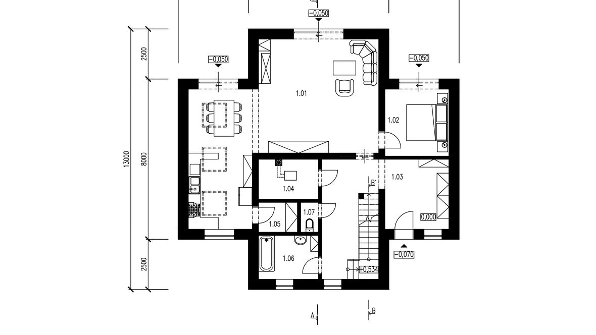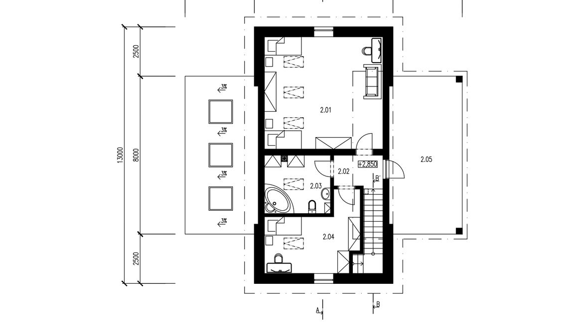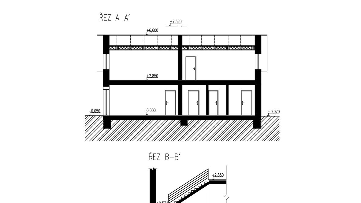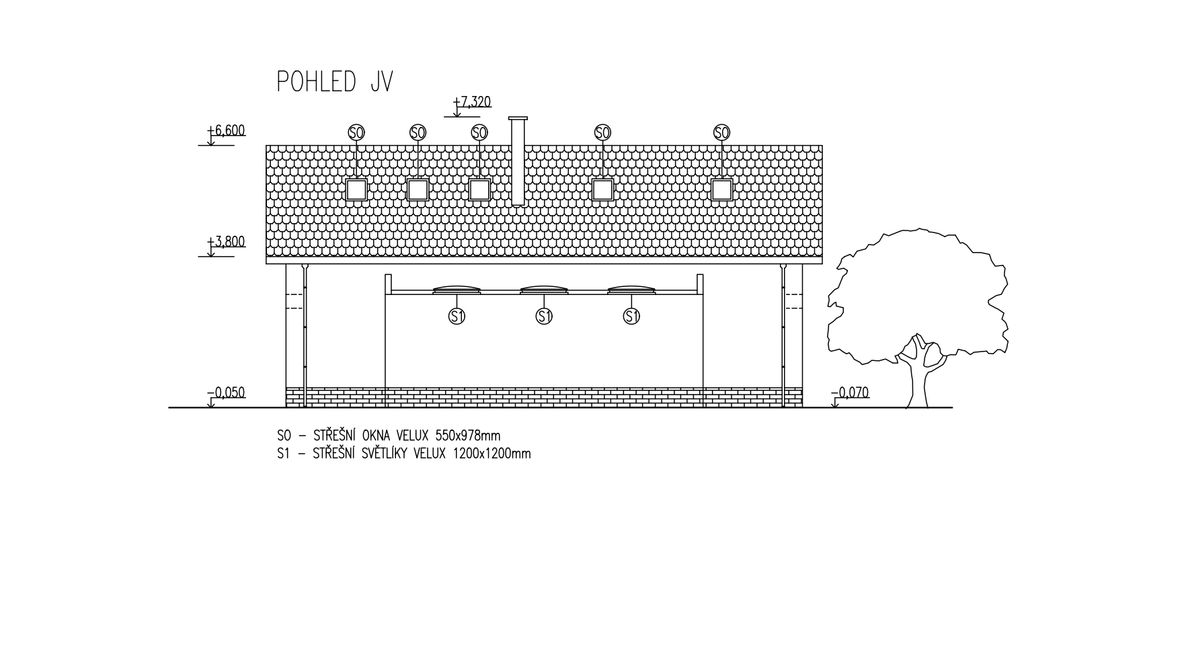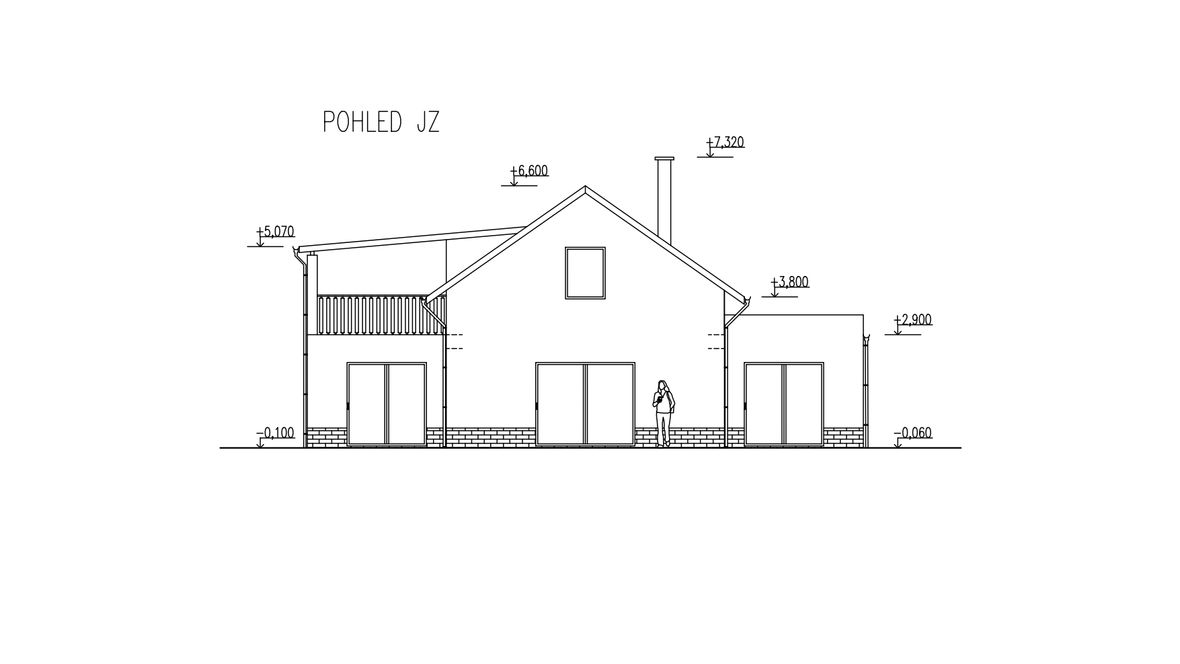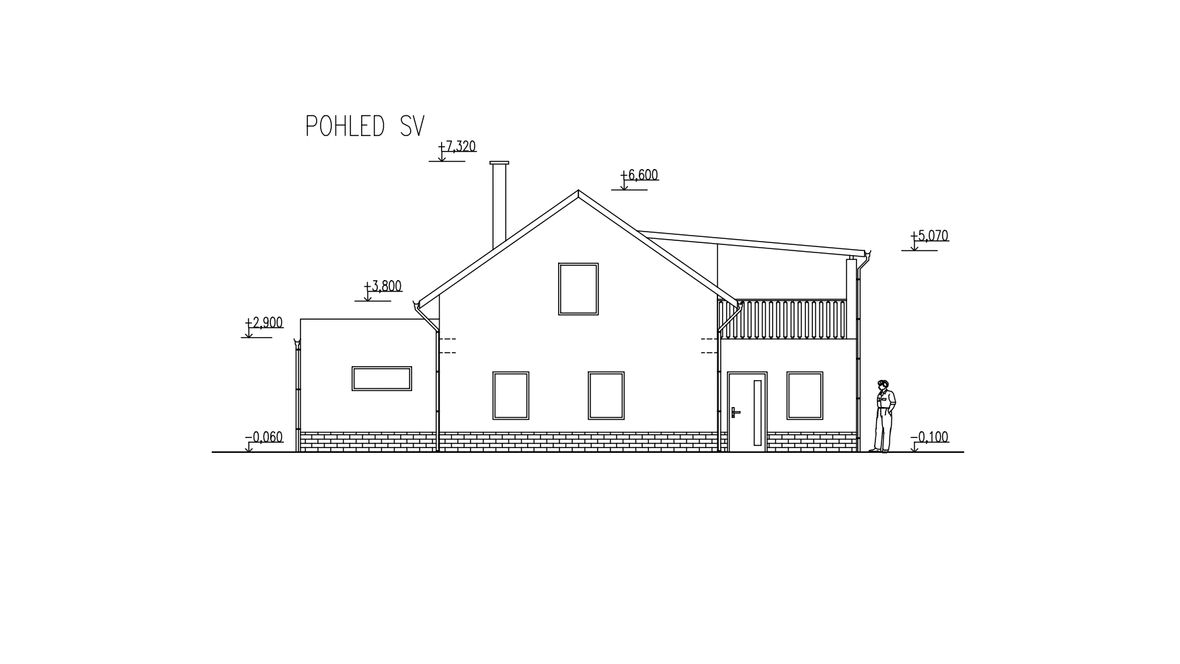 Myšlenkou bylo vytvořit rozmanitý tvar rodinného domu, který by dispozičně dával smysl. Proto jsem navrhl dvoupatrový nadzemní dům o celkové ploše 147m². V prvním podlaží je zvolen prostor pro společenské účely a zázemí. Po schodech nahoru vstoupíte do druhého podlaží, kde se nachází 2 pokoje, koupelna a vstup na zastřešenou terasu. Pro lepší prosvětlení kuchyně a 2NP jsem využil světlíky a střešní okna VELUX. 1NP: 1.01 OBYV. POKOJ + JÍDELNA + KUCHYNĚ 57,6m² 1.02 LOŽNICE 10,7m² 1.03 ZÁDVEŘÍ + CHODBA + SCHODIŠTĚ 28,8m² 1.04 TECH. MÍSTNOST 5,9m² 1.05 SPÍŽ 4,5m² 1.06 KOUPELNA 6,6m² 1.07 WC 1,35m² 2NP: 2.01 POKOJ 34,2m² 2.02 CHODBA + SCHODIŠTĚ 8,9m² 2.03 KOUPELNA 9,8m² 2.04 POKOJ 15,2m² 2.05 TERASA 15,9m²