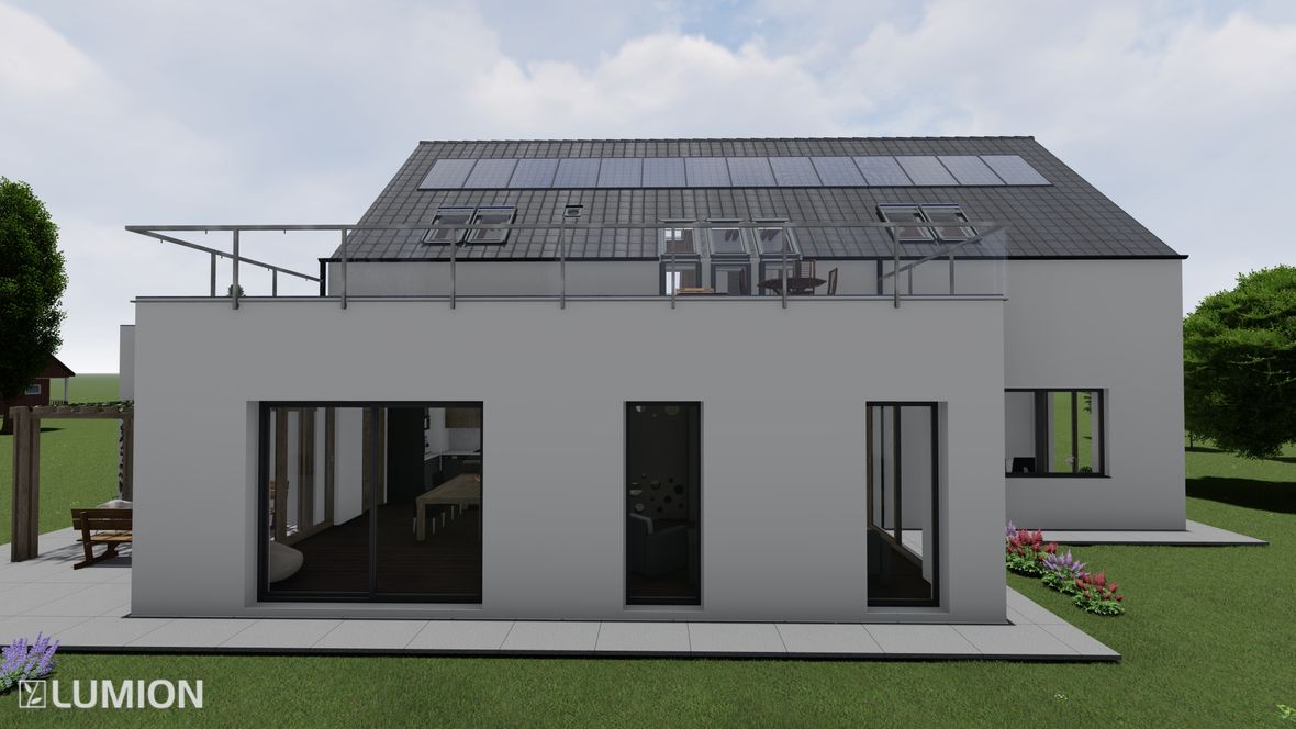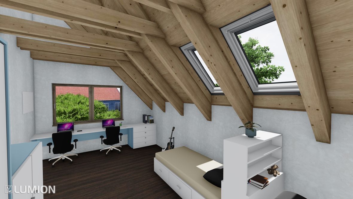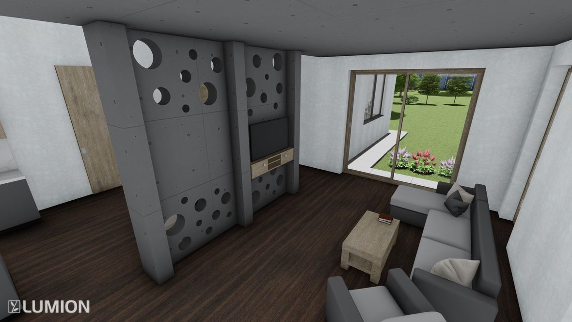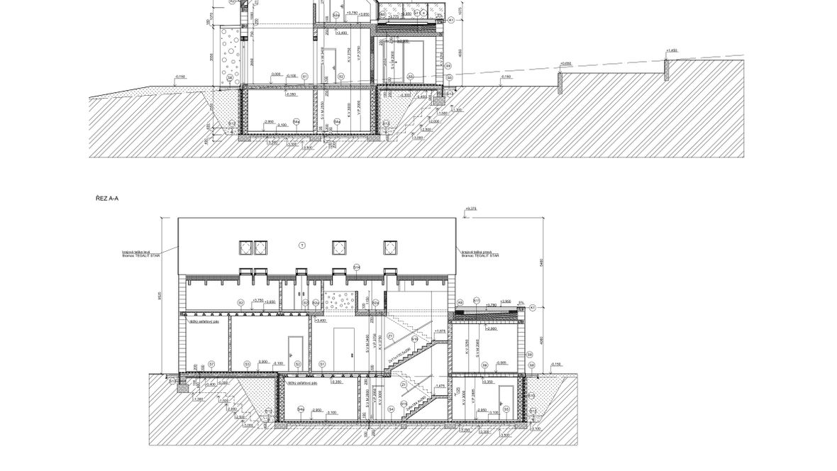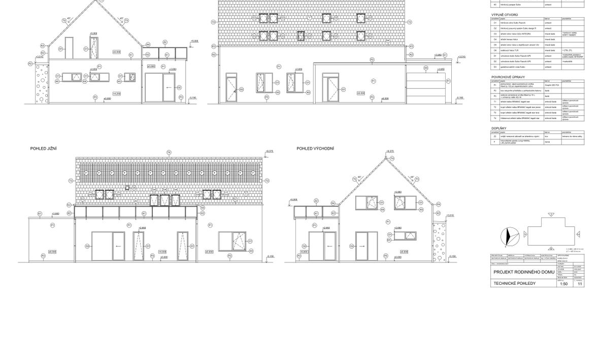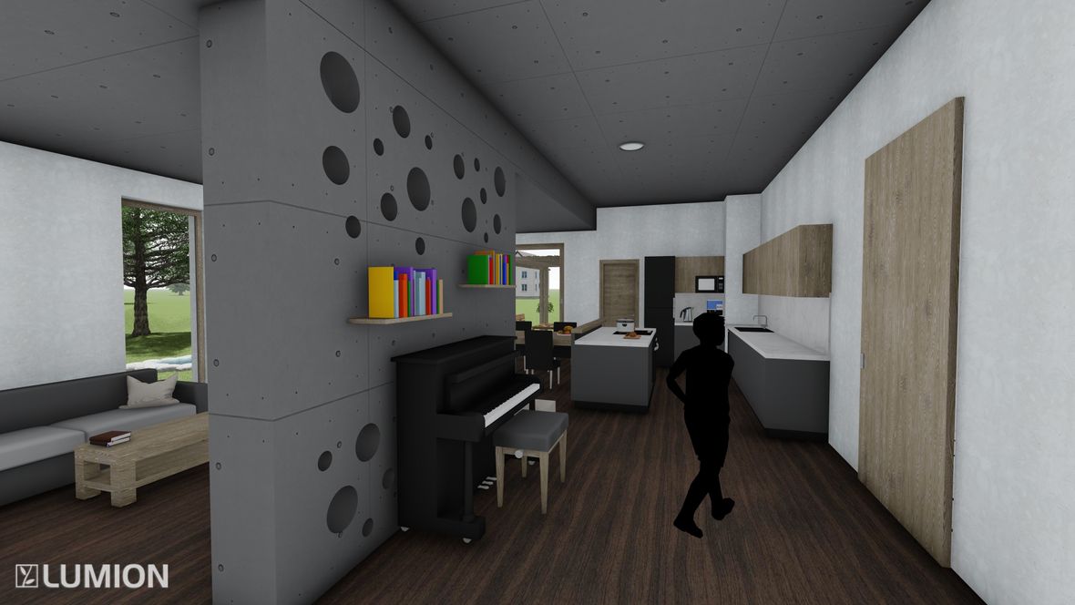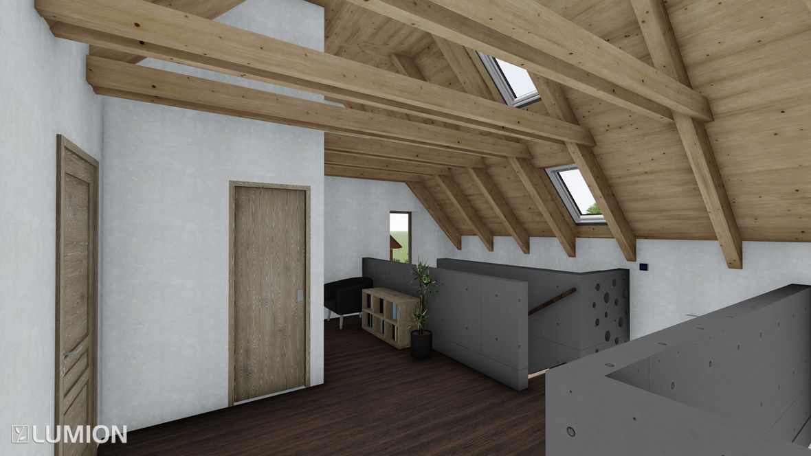 Mým cílem bylo navrhnout prostorný energeticky úsporný rodinný objekt pro aktivní čtyřčlennou rodinu, v kterém bude ideální teplota po celý rok díky zeleným střechám a vnějšímu stínění oken. K propojení interiéru a exteriéru slouží konstrukce z pohledového betonu s kruhovými prostupy, velkoplošná a střešní okna. Vnitřní vstupní prostor je otevřen do krovu, jehož konstrukce je přiznaná ve všech místnostech podkroví.