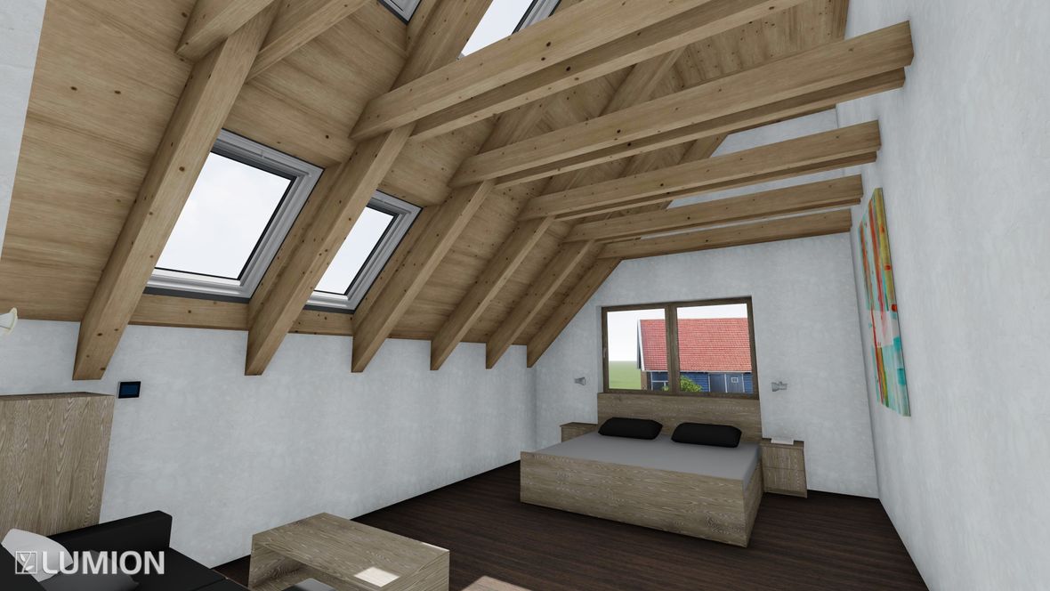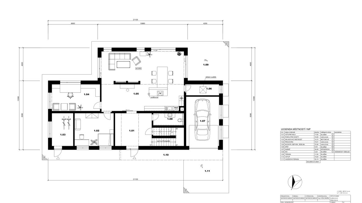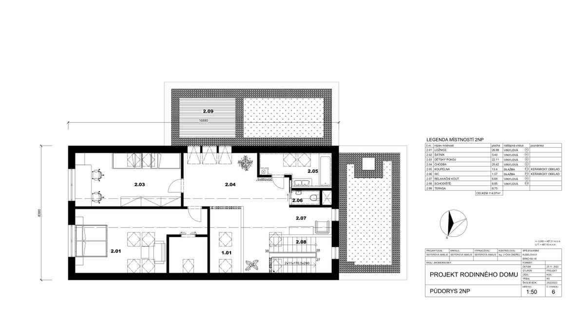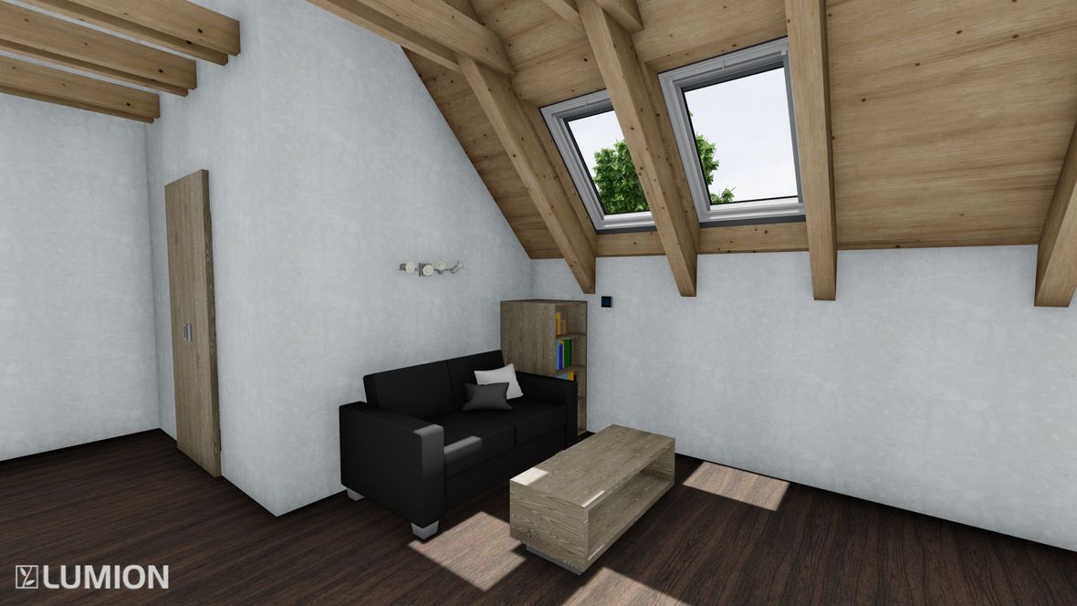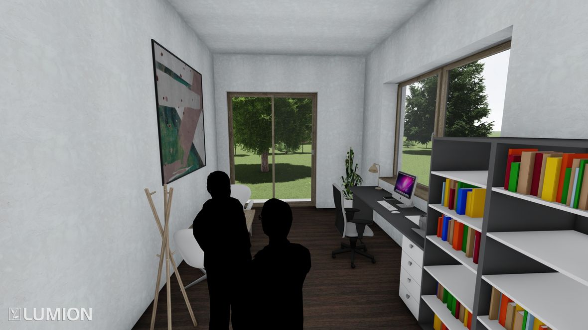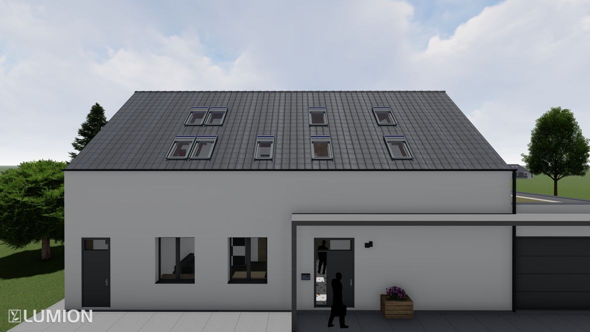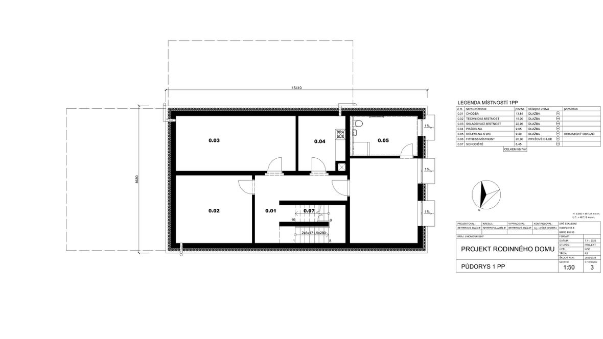 Mým cílem bylo navrhnout prostorný energeticky úsporný rodinný objekt pro aktivní čtyřčlennou rodinu, v kterém bude ideální teplota po celý rok díky zeleným střechám a vnějšímu stínění oken. K propojení interiéru a exteriéru slouží konstrukce z pohledového betonu s kruhovými prostupy, velkoplošná a střešní okna. Vnitřní vstupní prostor je otevřen do krovu, jehož konstrukce je přiznaná ve všech místnostech podkroví.