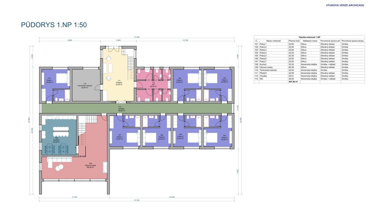 Záměrem bylo vytvořit třípodlažní objekt jednoduchého, a přesto zajímavého tvaru, který slouží jako chata na pronájem soukromých pokojů s nabídkou sdílených prostor jako je kuchyň, obývací pokoj, bazén a knihovna. Objekt je navržen, do oblasti u jezera Lago di Como v Itálii, kde se hostům chaty dostane spojení s přírodou. Dřevěná chata nabízí prostorné a útulné pokoje. Každý pokoj má soukromou koupelnu a výhledy na okolní krajinu. Přízemí domu je vyhrazeno z části společným prostorům a soukromým pokojům. Bazén s výhledem na jezero se nachází na terase se vstupem z obývacího pokoje. Obývací pokoj je prosklený s výhledem na celé jezero, tento prostor je určen pro lidi, kteří se chtějí setkávat s ostatními hosty nebo pro odpočinek. Nad obývacím pokojem se nachází knihovna, která je přístupná schodištěm. Střecha je nadkrokevně zateplená. Objekt je zastřešen sedlovou střechou. Ve třetím podlaží jsou místnosti osvětleny střešními okny Velux se stíněním. Okna je možno dálkově ovládat