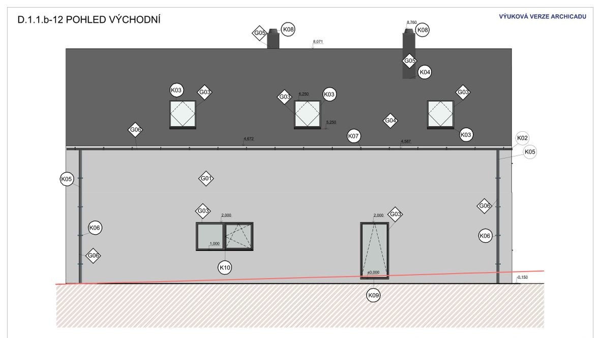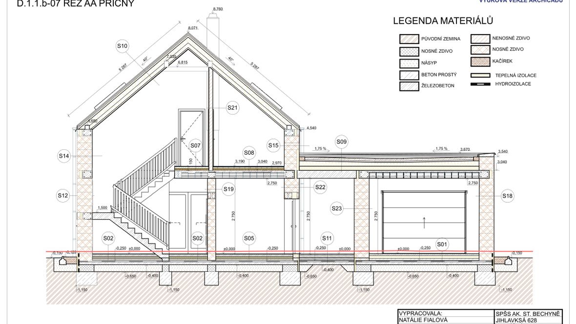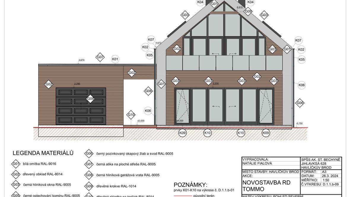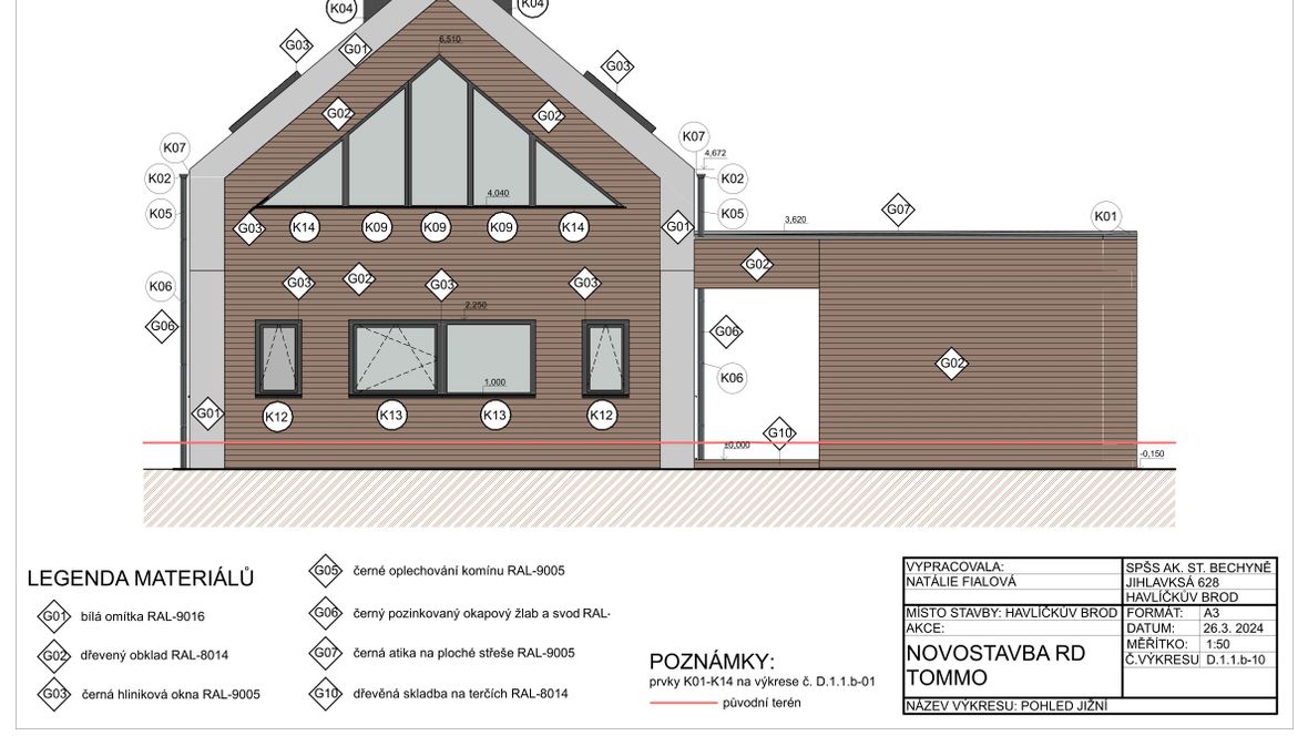 Tento dvoupodlažní rodinný dům je navržen pro čtyřčlennou rodinu. První podlaží je společenské, zatímco v druhém podlaží se nachází klidová zóna s dětskými pokoji a ložnicí. Cílem tohoto projektu je spojení domu s přírodou. Proto je dům prosvětlený, aby v něm bylo, co nejméně umělého světla a naopak co nejvíce toho přírodního. A právě proto považuji za jeho dominantu trojúhelníková okna, která umožňují větší vstup světla do domu. Za další jeho výhodu považuji, že má spousty míst k relaxaci, jak už uvnitř domu či na zahradě. Protože je důležité si občas odpočinout od našich každodenních činností.