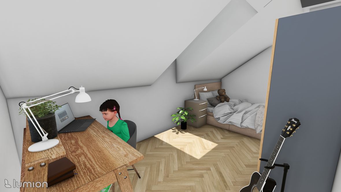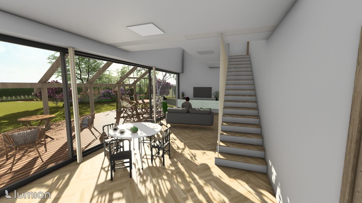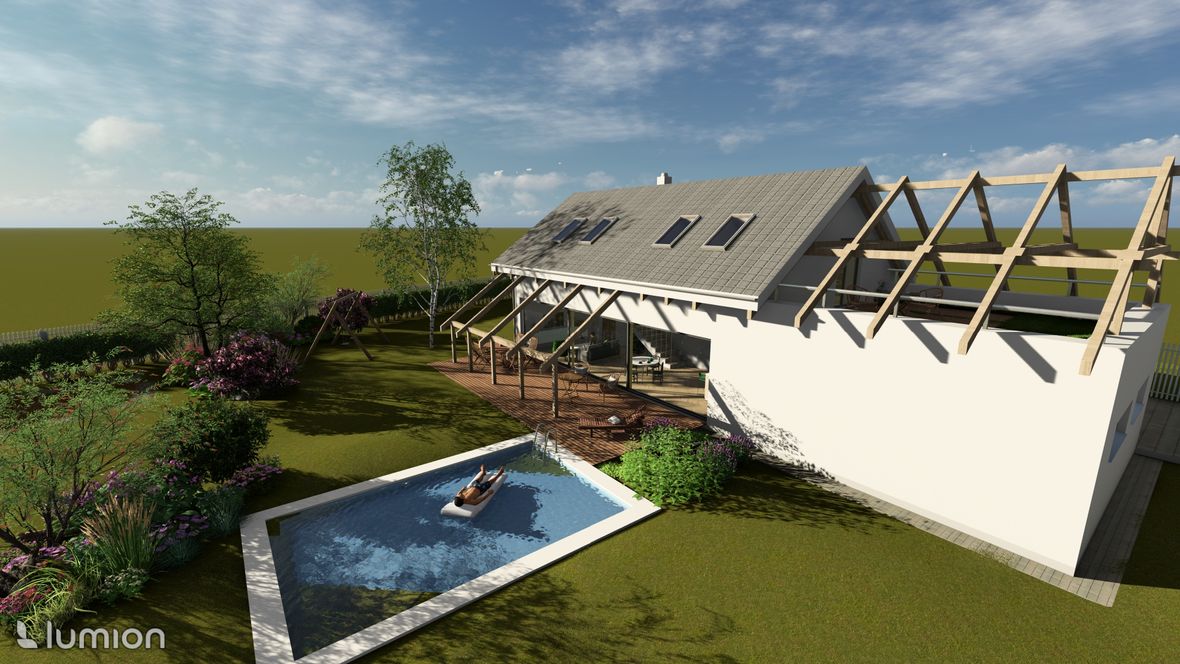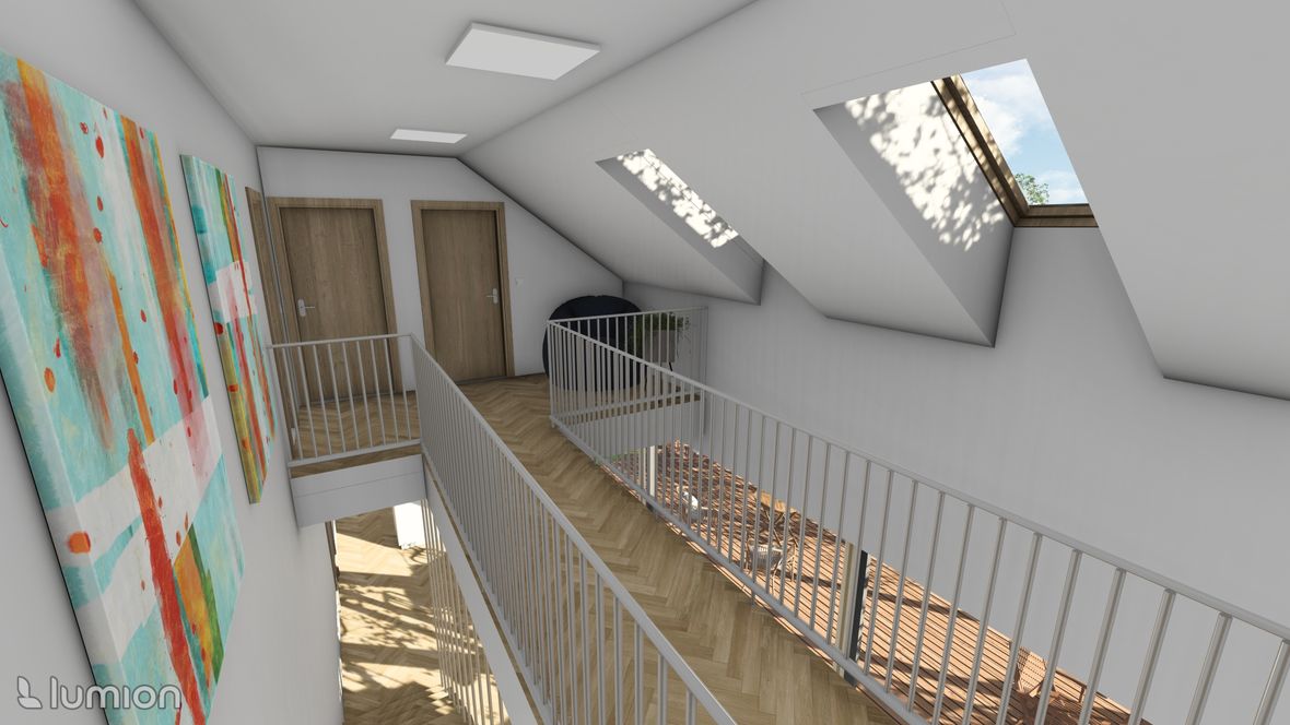 Objekt rodinného domu je navržen pro čtyřčlennou rodinu. Při návrhu byl kladen důraz na společné prostory, tak aby dům nebyl zbytečně zónován a rodina mohla příjemně trávit společný čas. Propojení podlaží je zajištěno otevřením obývacího pokoje do podkroví a tím je vytvořena galerie v horním patře, odkud jsou přístupné ložnice členů rodiny. Na osvětlení objektu byl kladen velký důraz. Ústředním prvkem je velkoformátová prosklená stěna, kterou je docíleno propojení interiéru domu s přilehlou zahradou. Pro osvětlení galerie jsou použita střešní okna, která současně vnáší další pohled do obývacích prostor, který tím získává na vzdušnosti. Jednotlivé pokoje jsou vybaveny francouzskými okny, která jsou doplněna o střešní okna pro zvýšení osvětlení a odlehčení šikmých částí pokoje. Střešní okna v objektu jsou navržena VELUX GLL se spodním ovládáním, okna galerie jsou dálkově, elektricky ovládána.