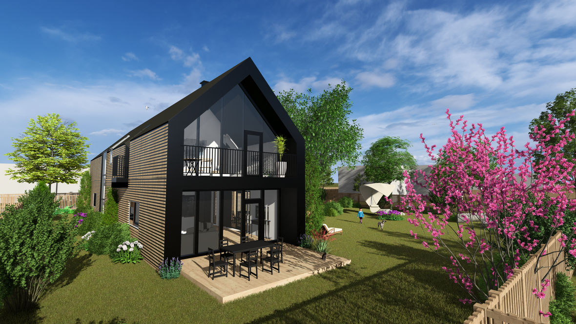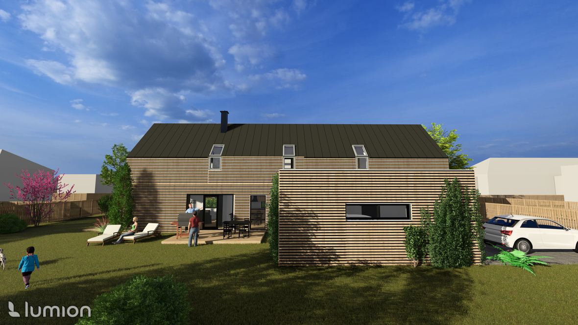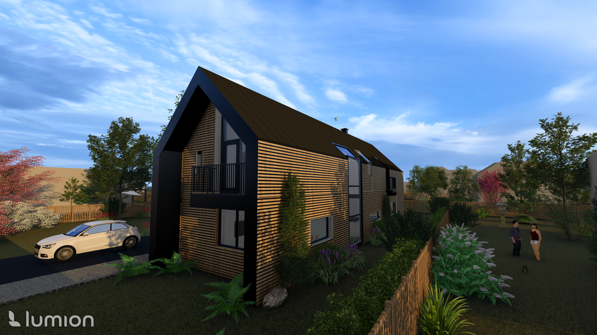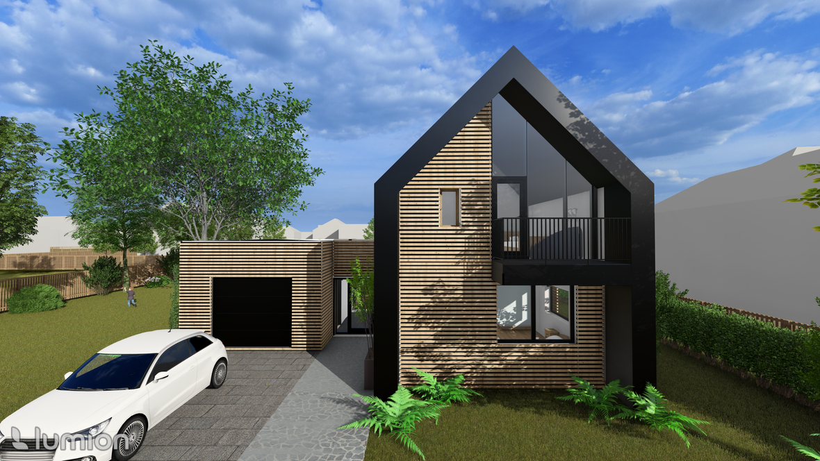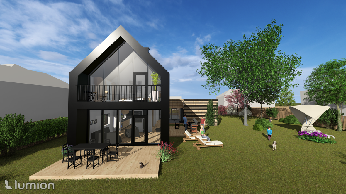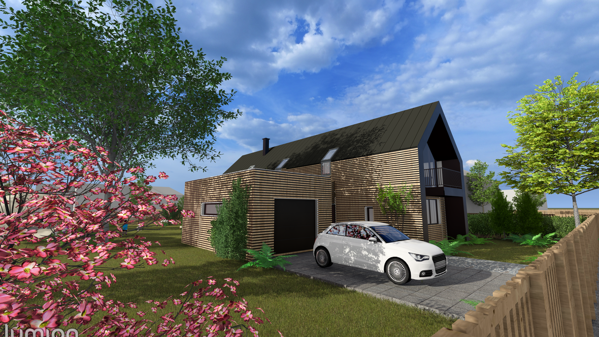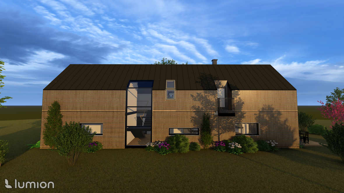 Záměrem byl dvoupodlažní rodinný dům pro čtyřčlennou rodinu. Dům je vzdušný a prosluněný. V druhém podlaží najdeme tři ložnice, každou s vlastním balkónem s výhledem do krajiny. Velmi impozantní prvky jsou prosklené štítové stěny a prosklené schodiště. Dále je dům obohacen dvěma terasami, jednou na východ pro příjemnou snídani a druhou na jihozápad pro večerní grilování. Na domě jsou použita střešní okna GLU0064B se svislým doplňkovým oknem VIU0066 a na léto jsou opatřeny venkovními roletami SML.